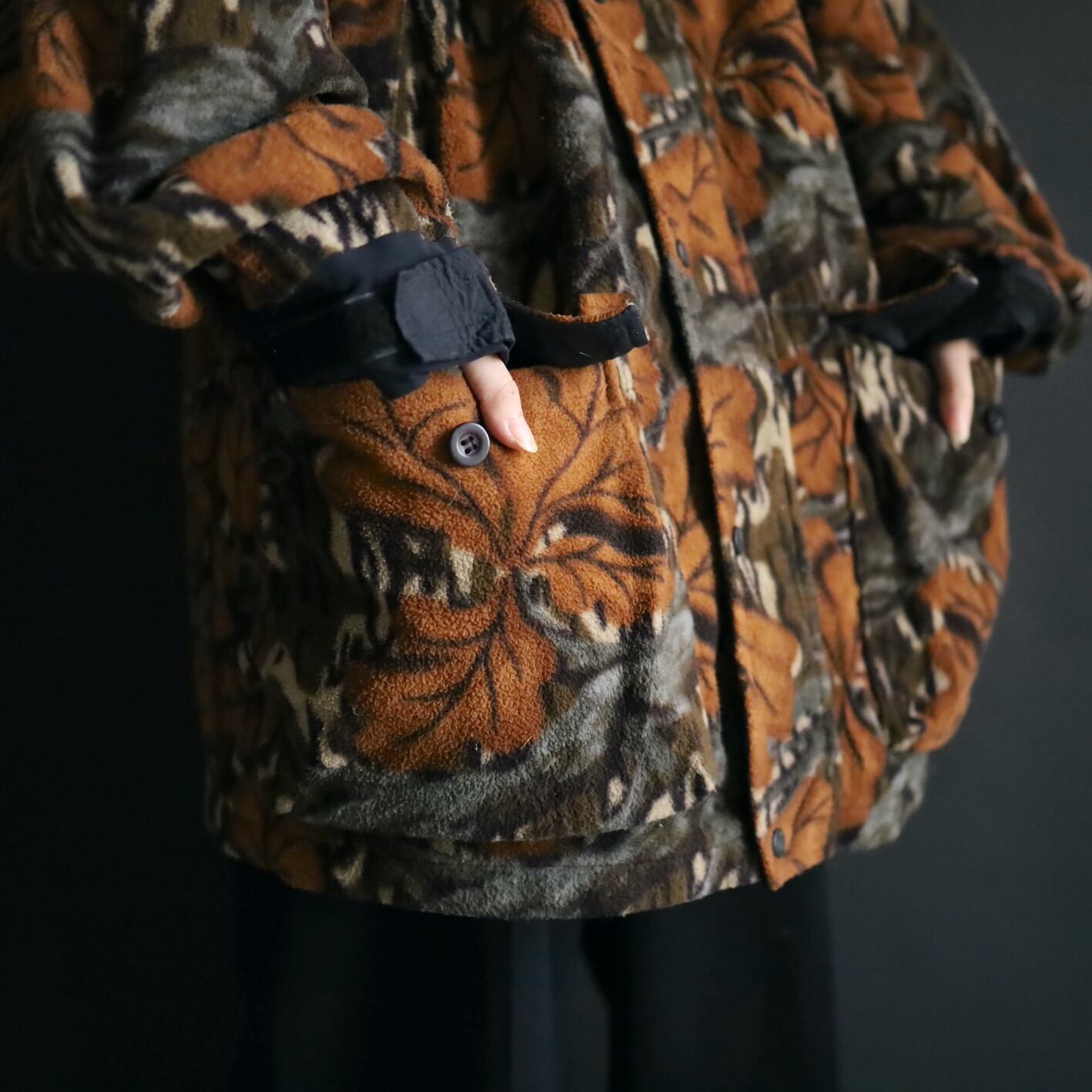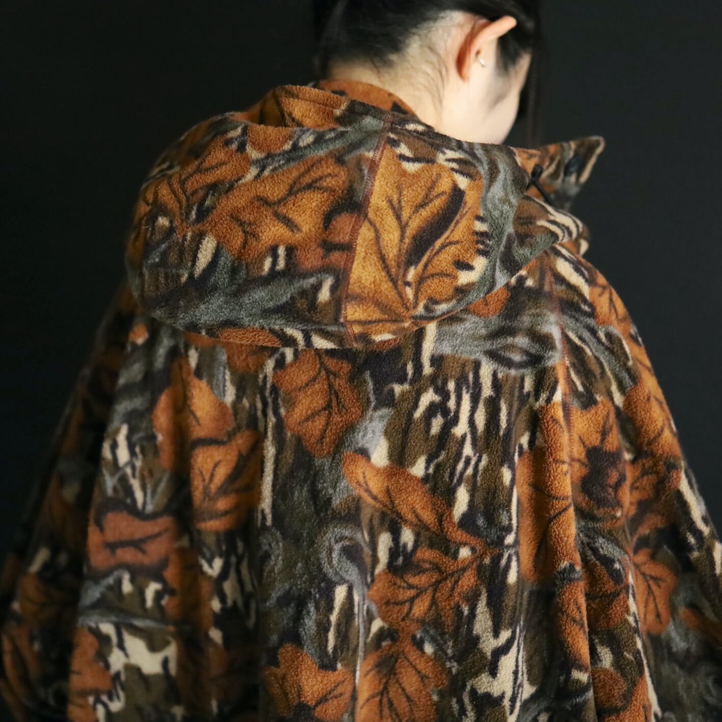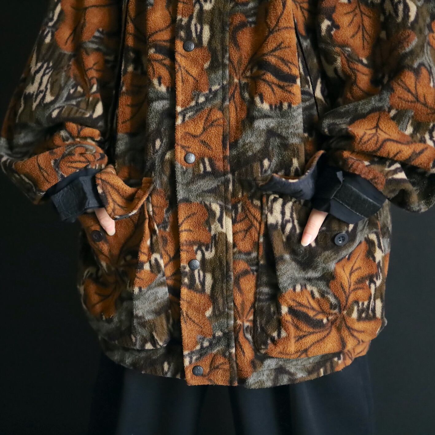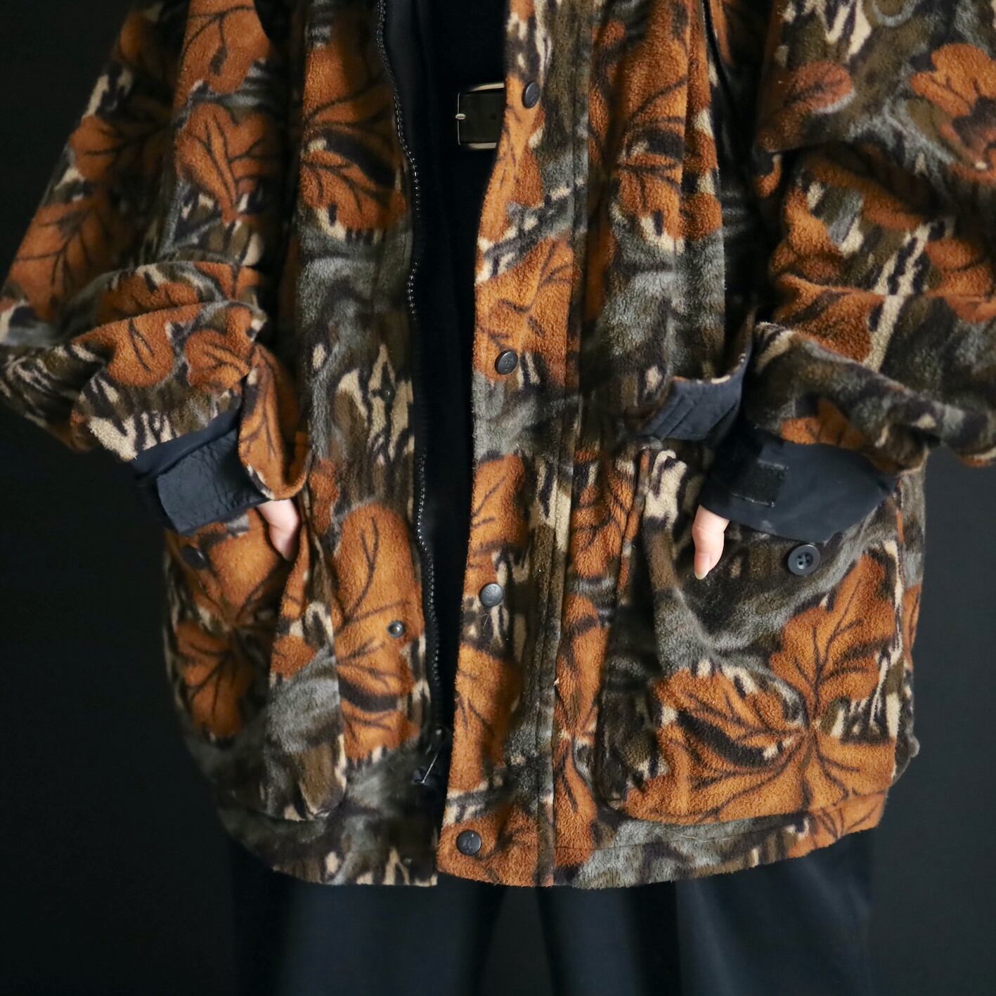 ブラウンベースのリーフカモフラージュ柄フリースで,ほっこりとした印象を受ける温かみのある一枚.