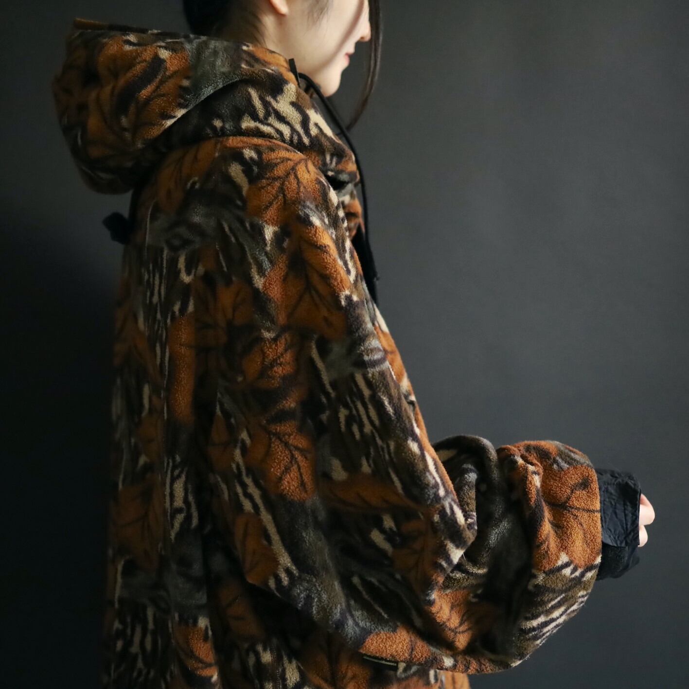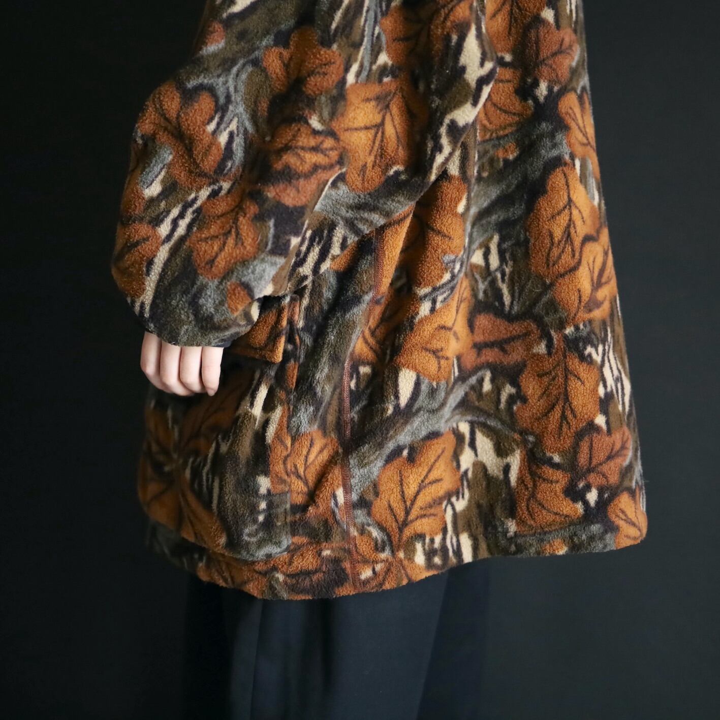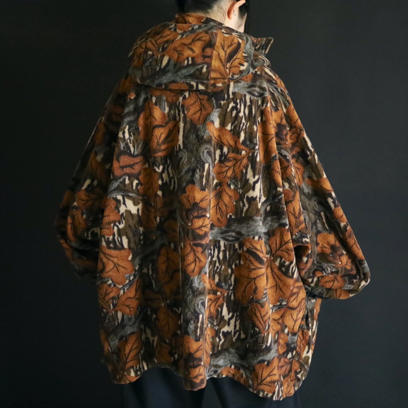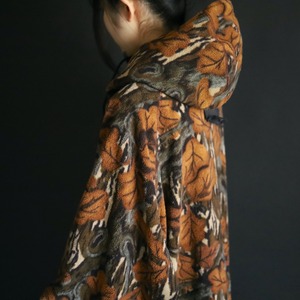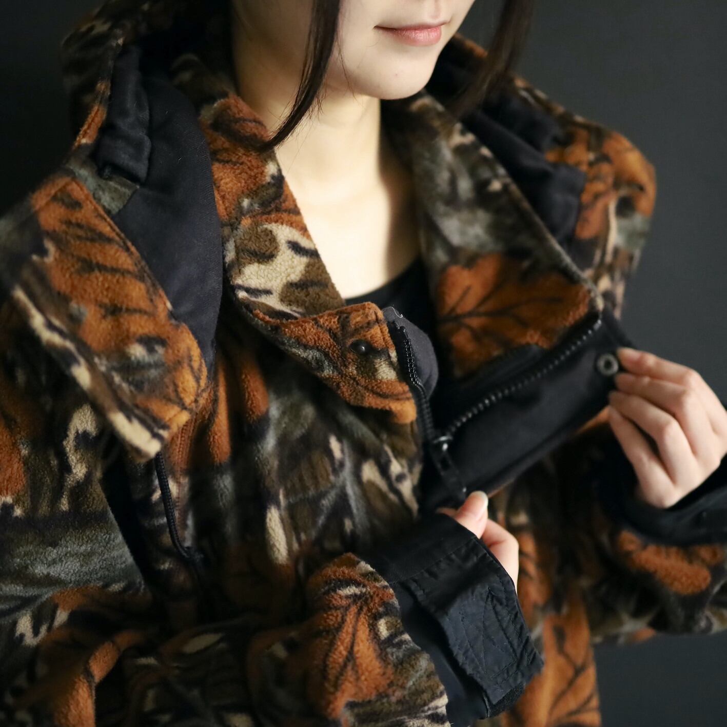 ブラウンベースのリーフカモフラージュ柄フリースで,ほっこりとした印象を受ける温かみのある一枚.