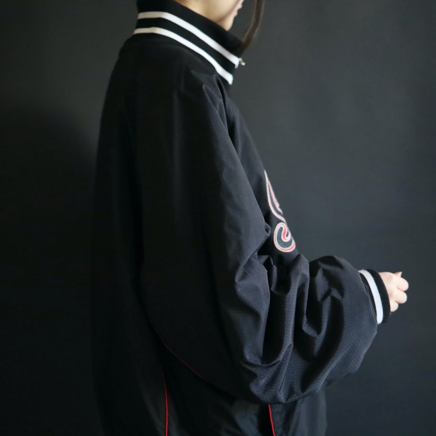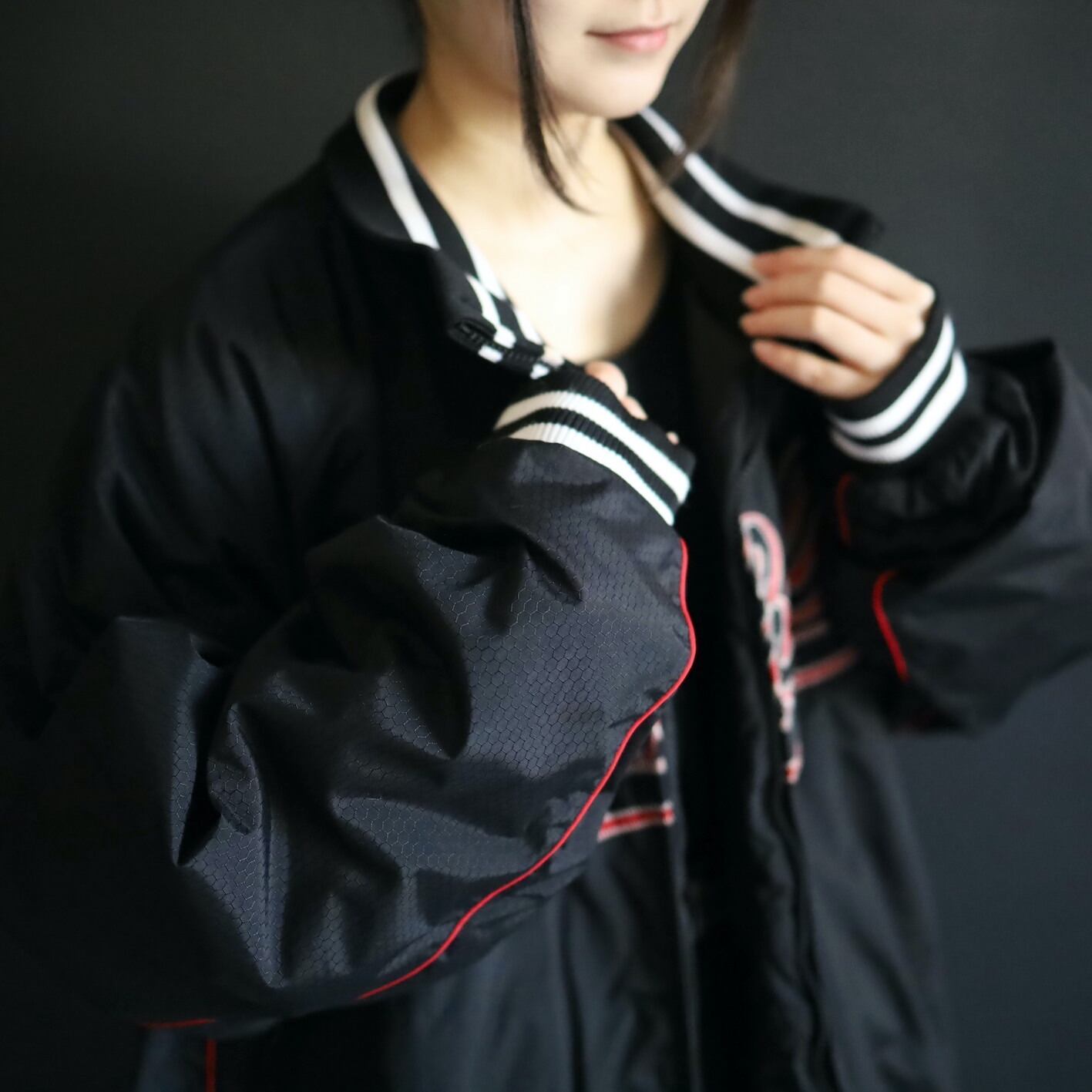 またフロント中央に大きくブランドネームと,脇下やアームにはレッドのパイピング.