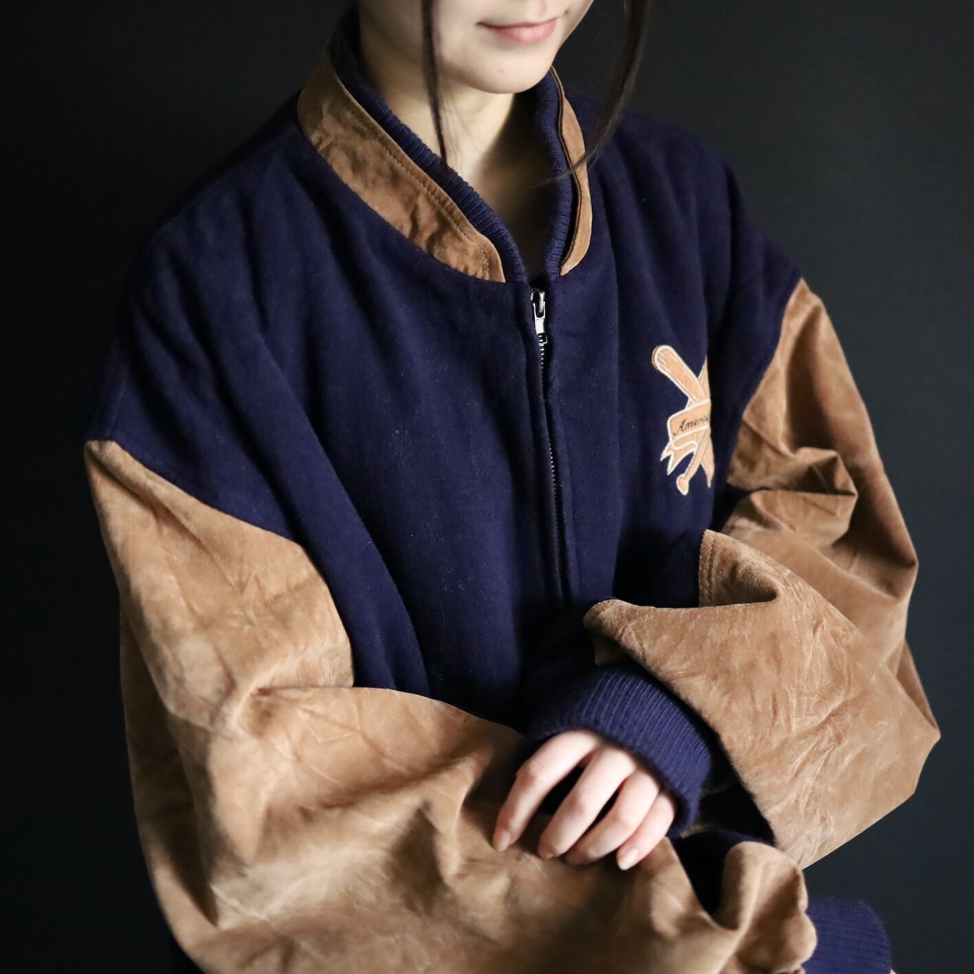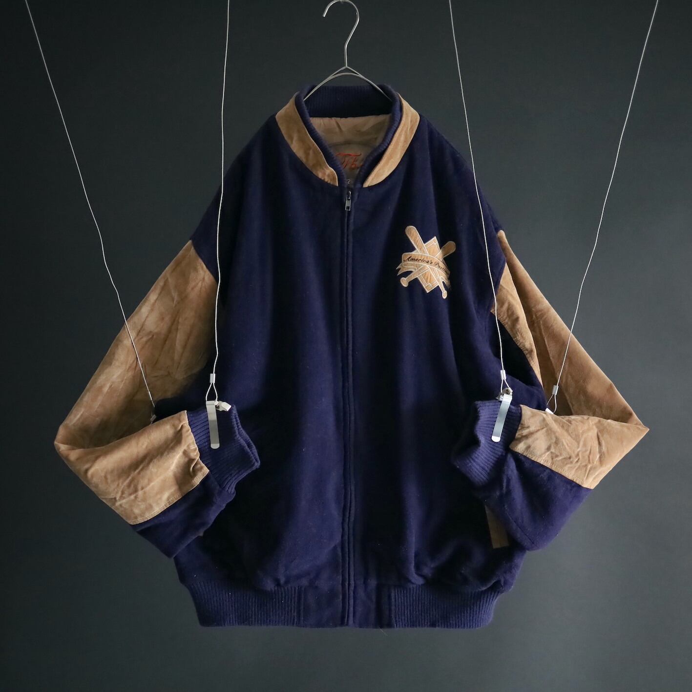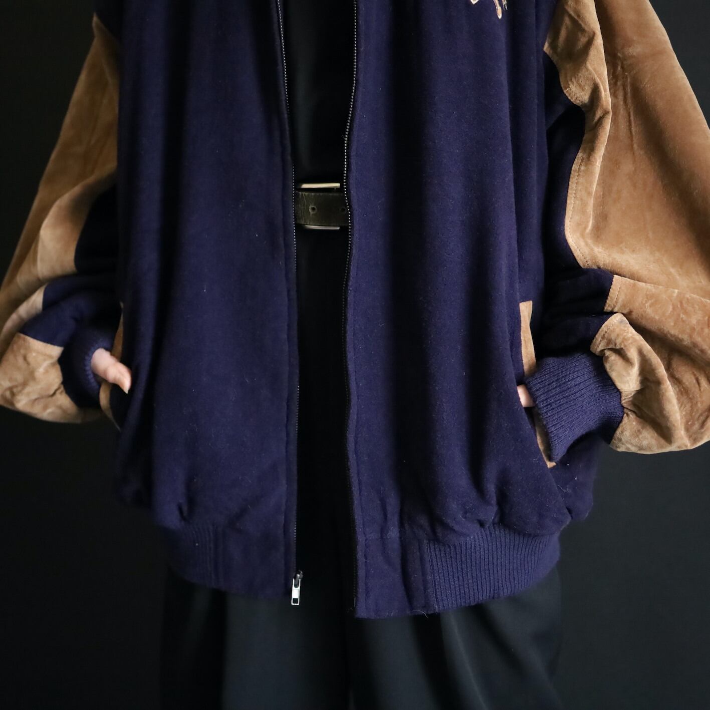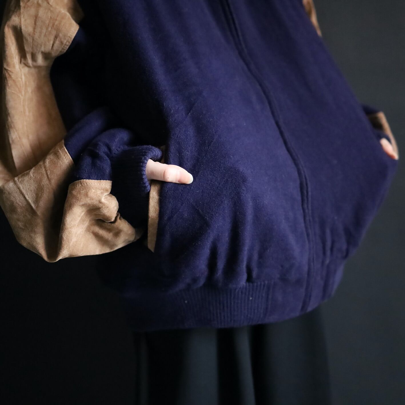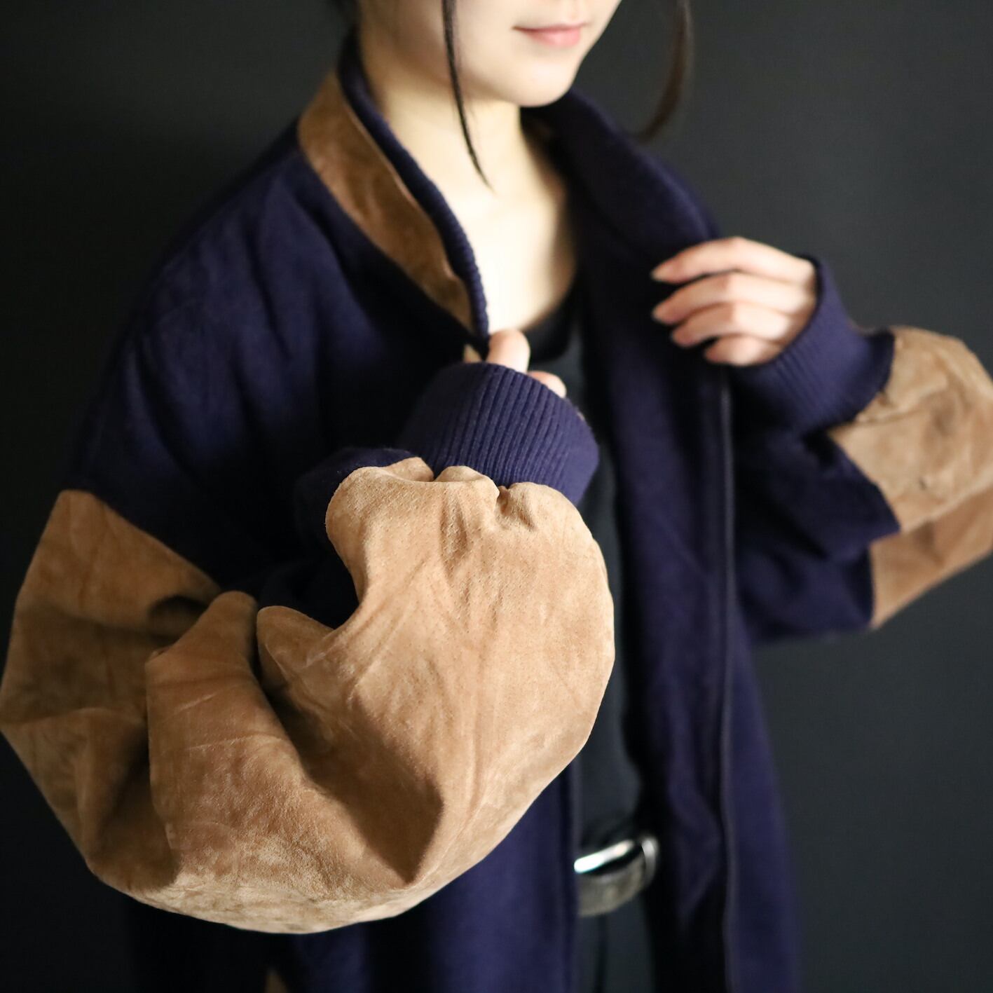 ネイビーのウールボディをベースに,袖,襟周り,ポケット口がスウェードレザー切替.
