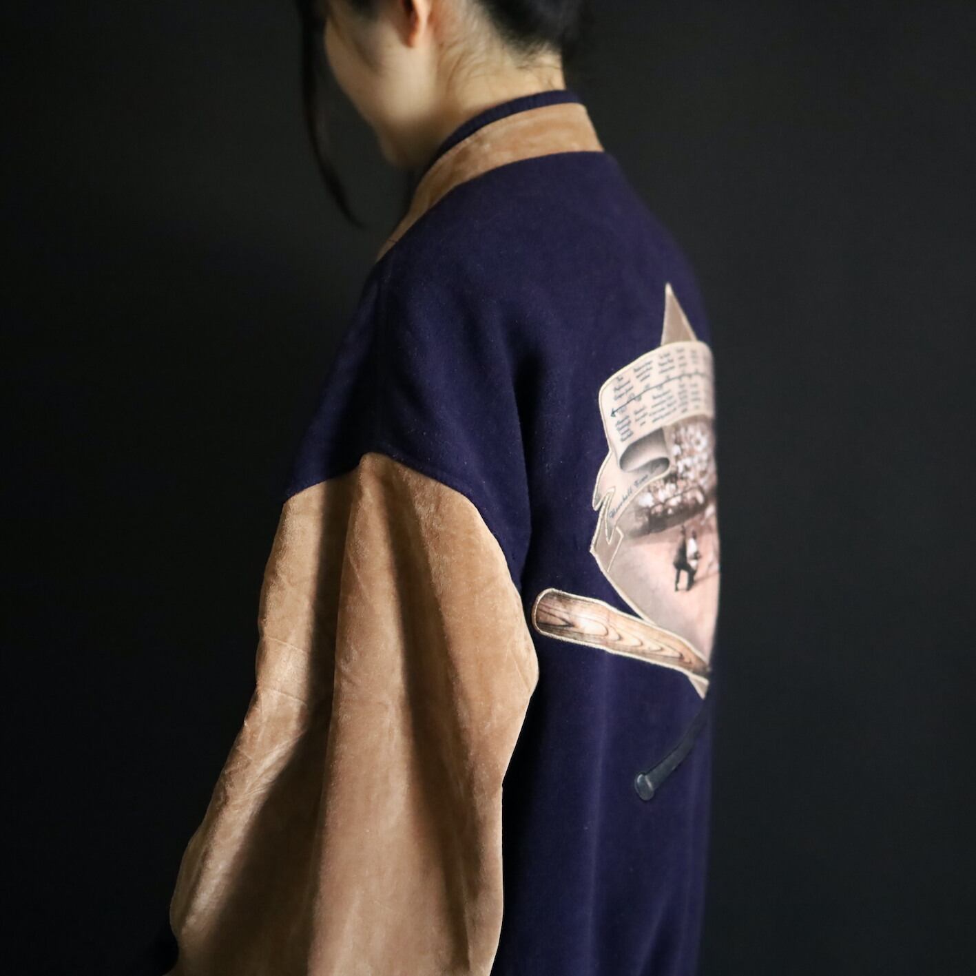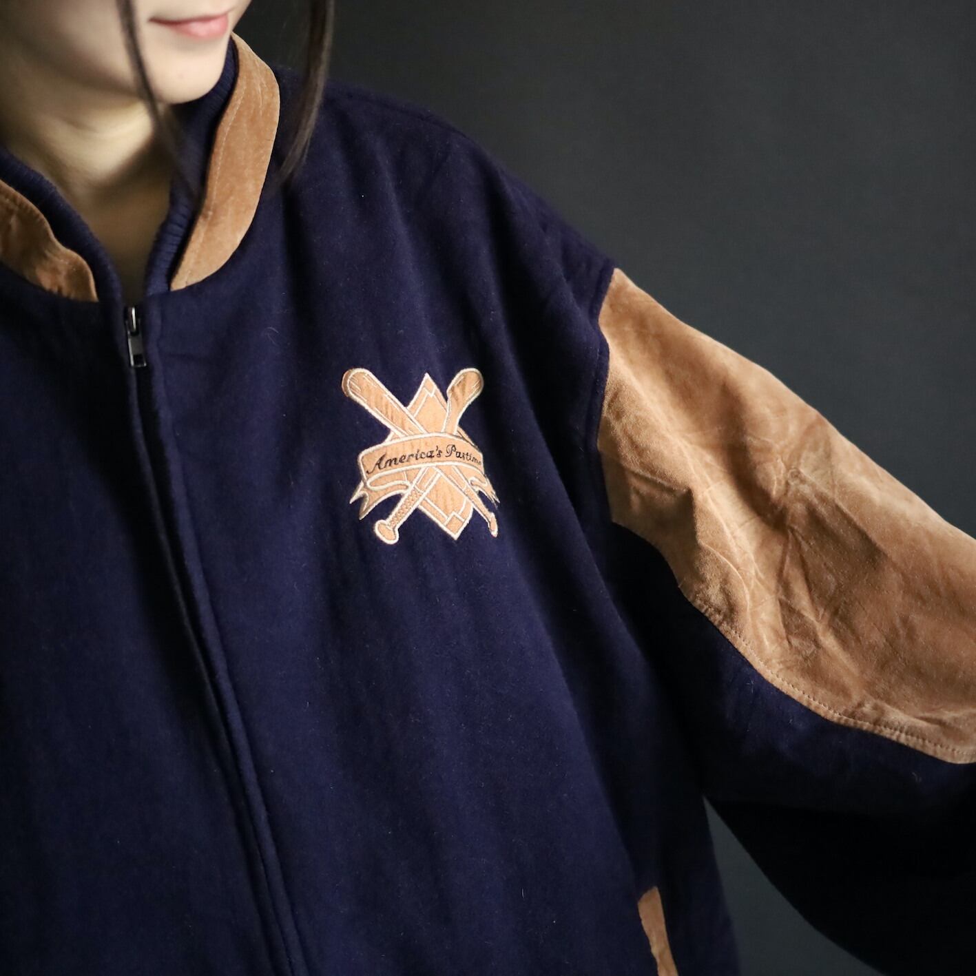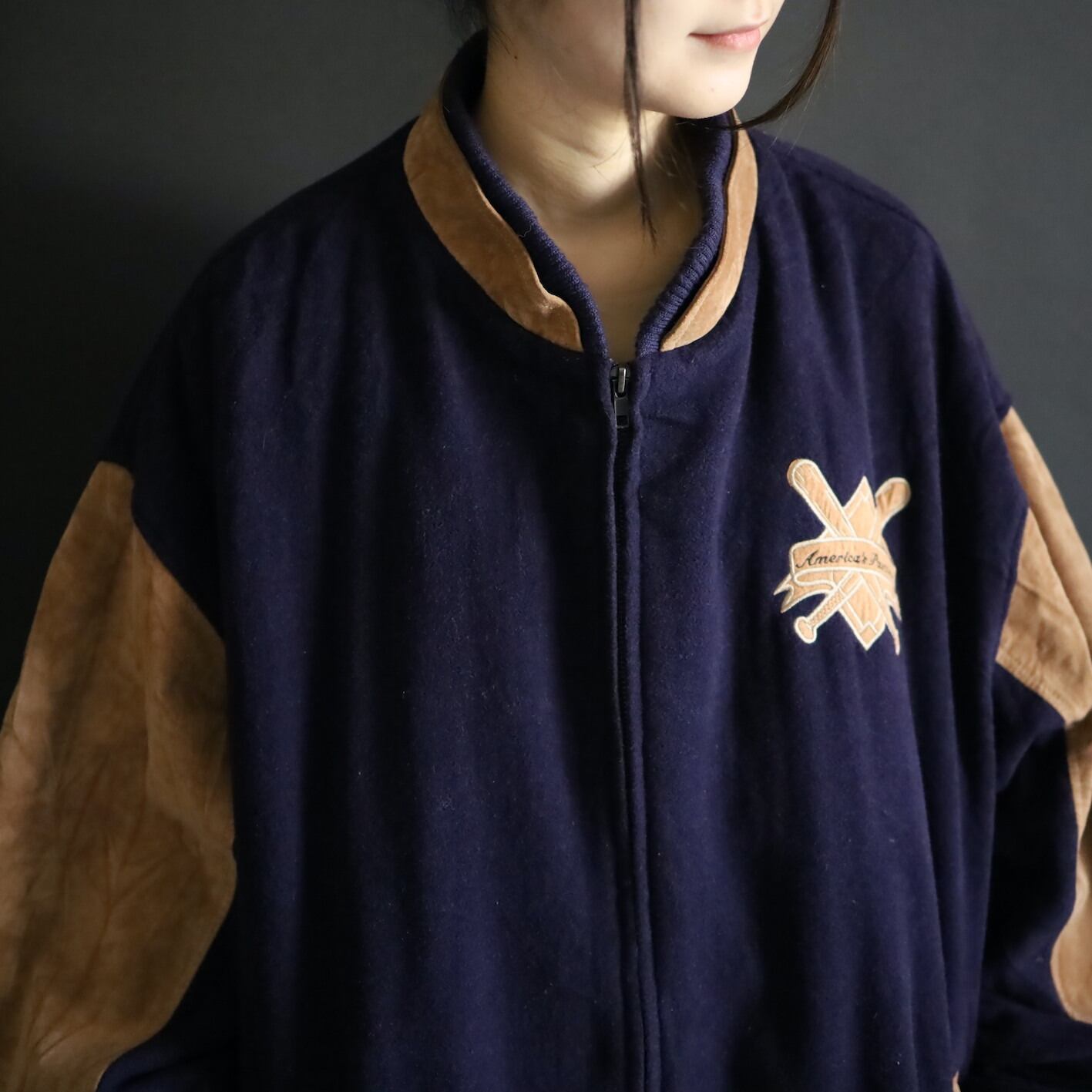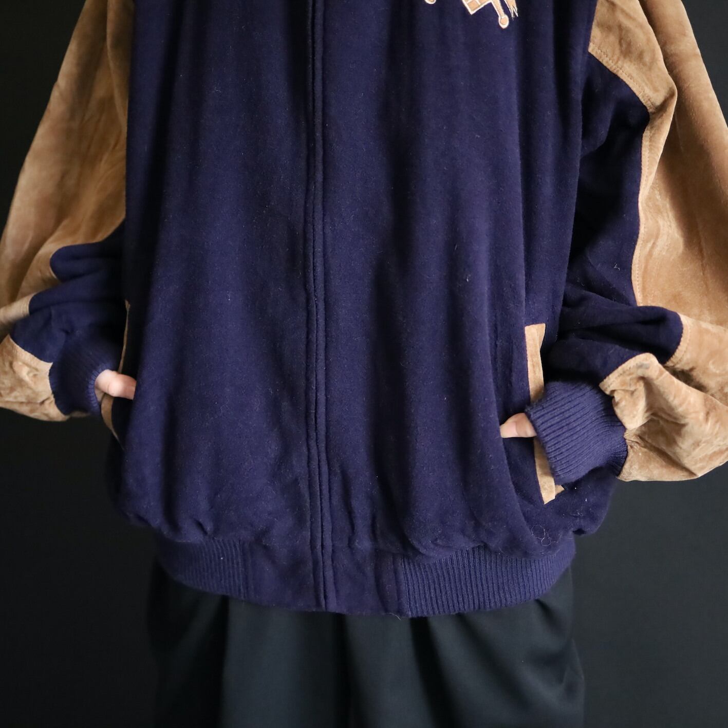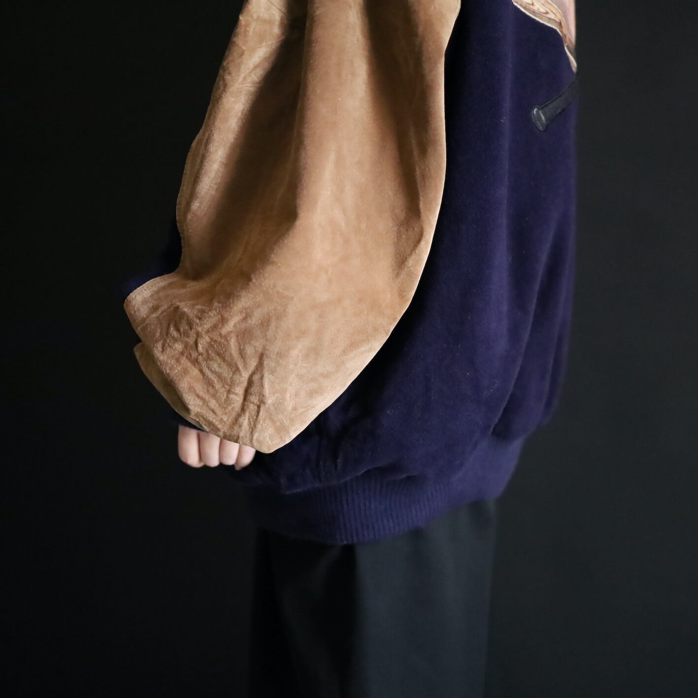 ネイビーのウールボディをベースに,袖,襟周り,ポケット口がスウェードレザー切替.
