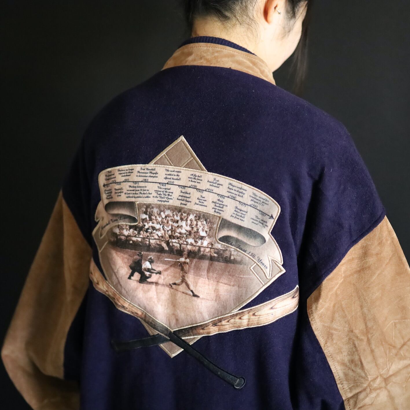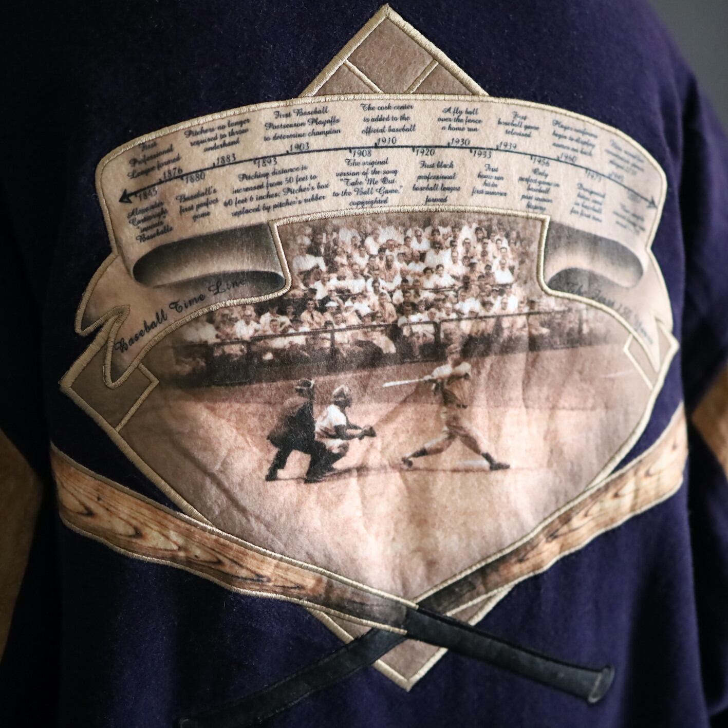 左胸,バックにはベースボールの刺繍,プリントで,レトロな雰囲気漂う色味が味わい深いです.