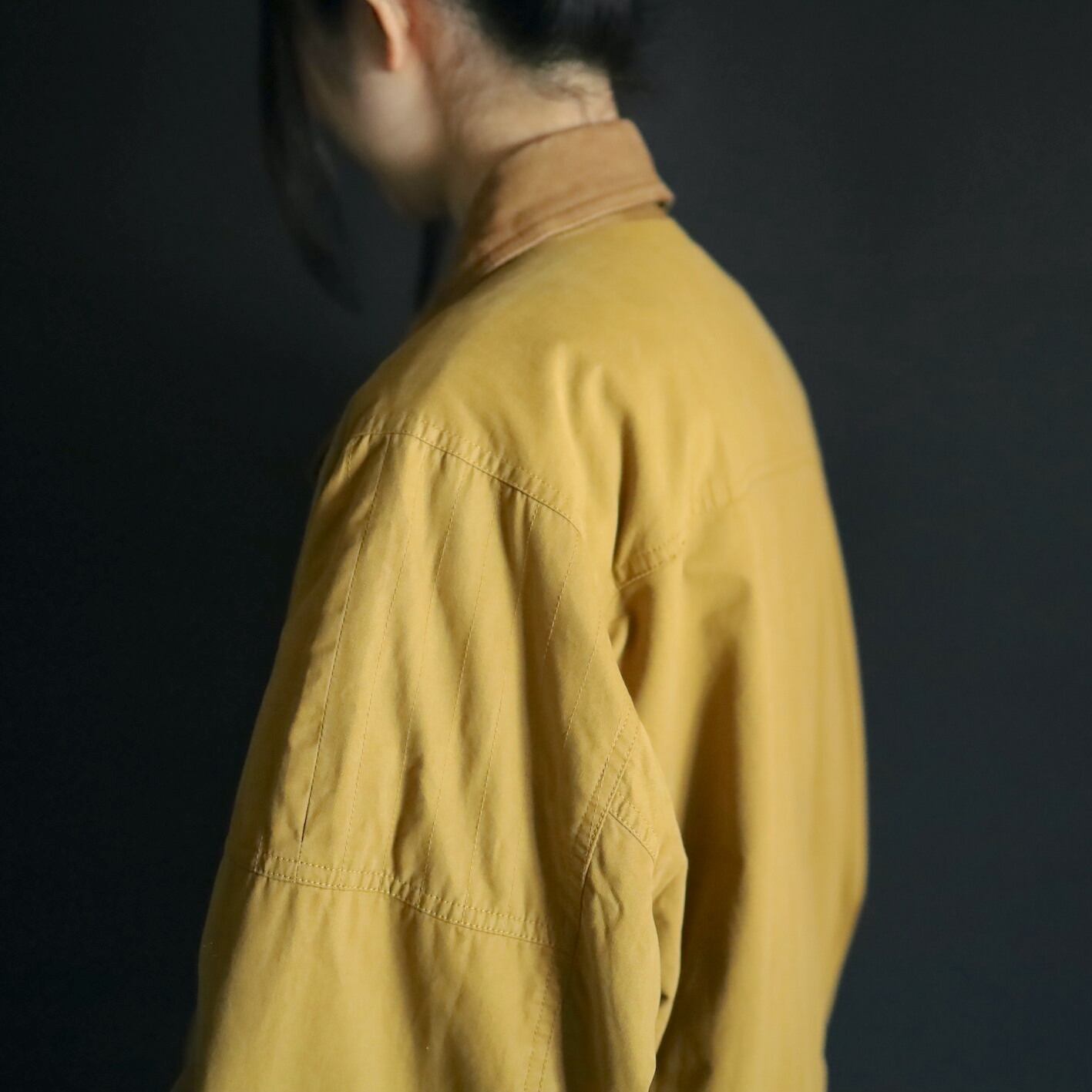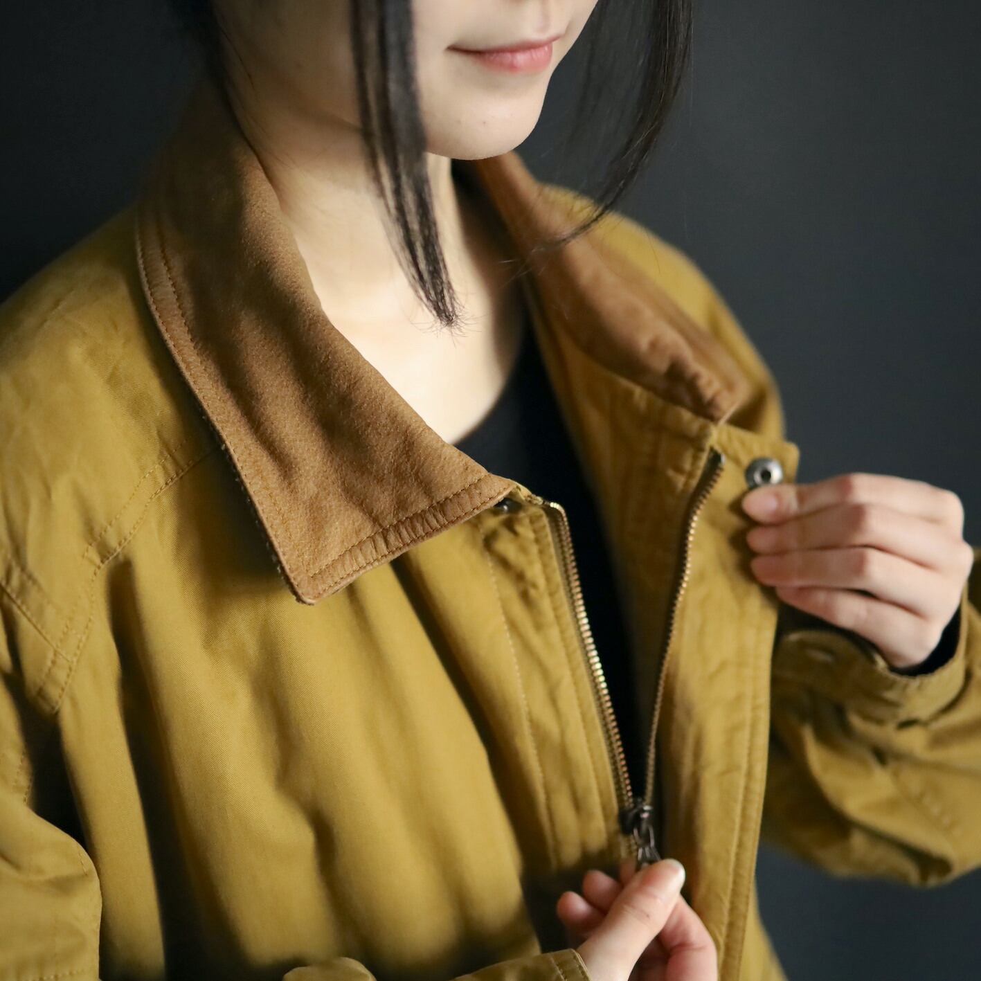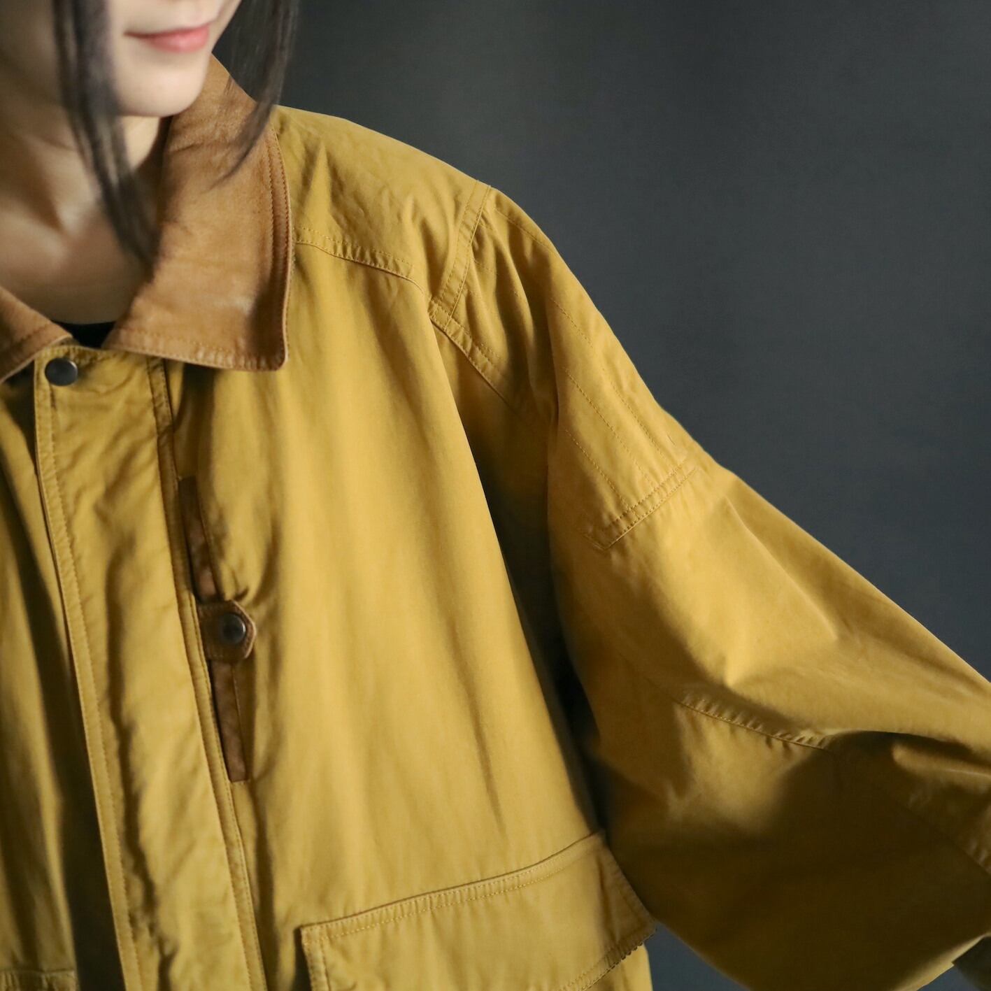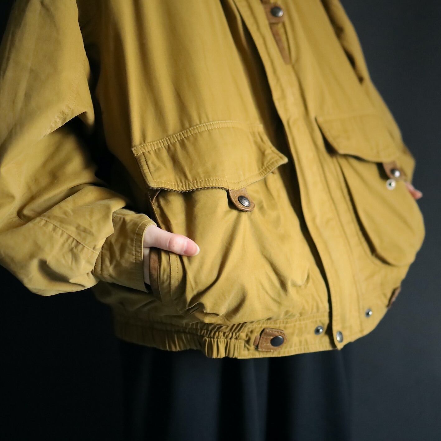 やや霞んだようなマスタードカラーをベースに,襟,ポケット,アジャスターがレザー切替.