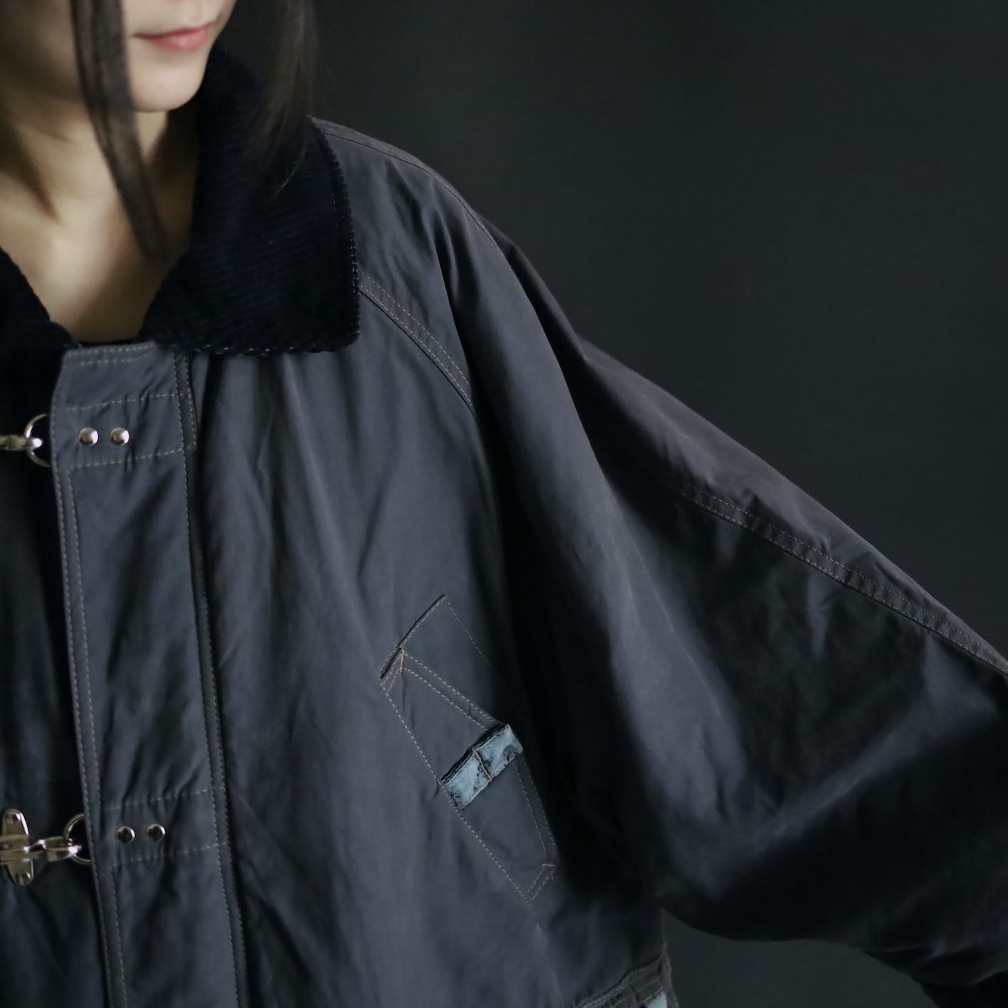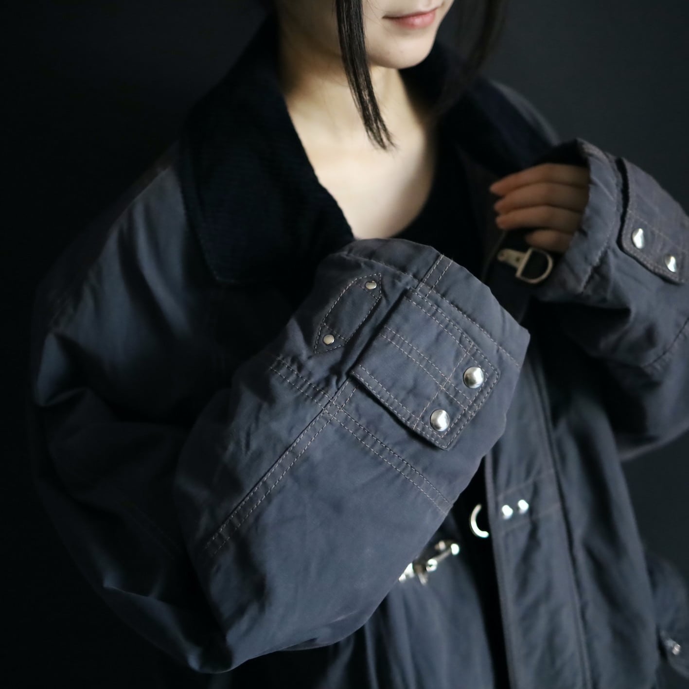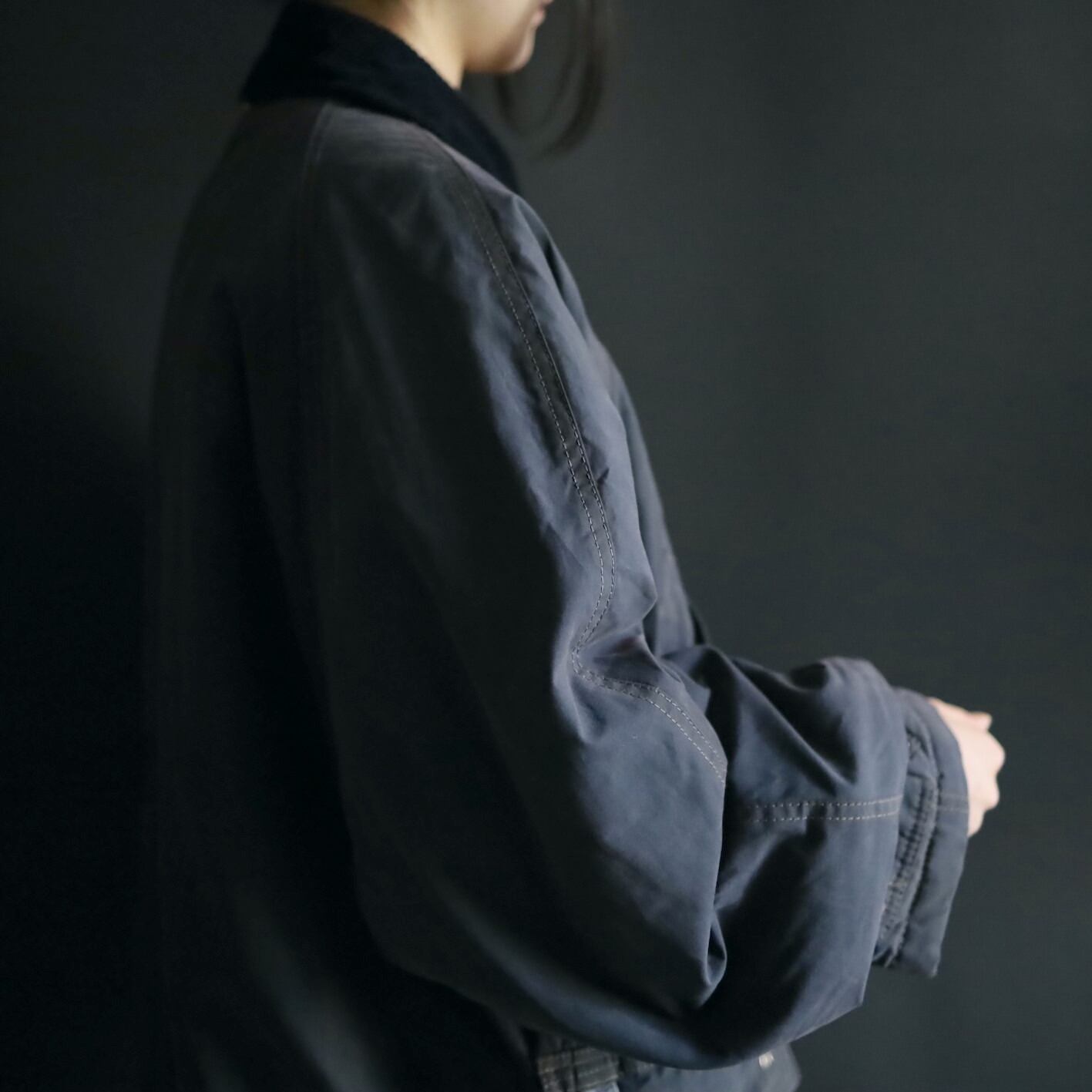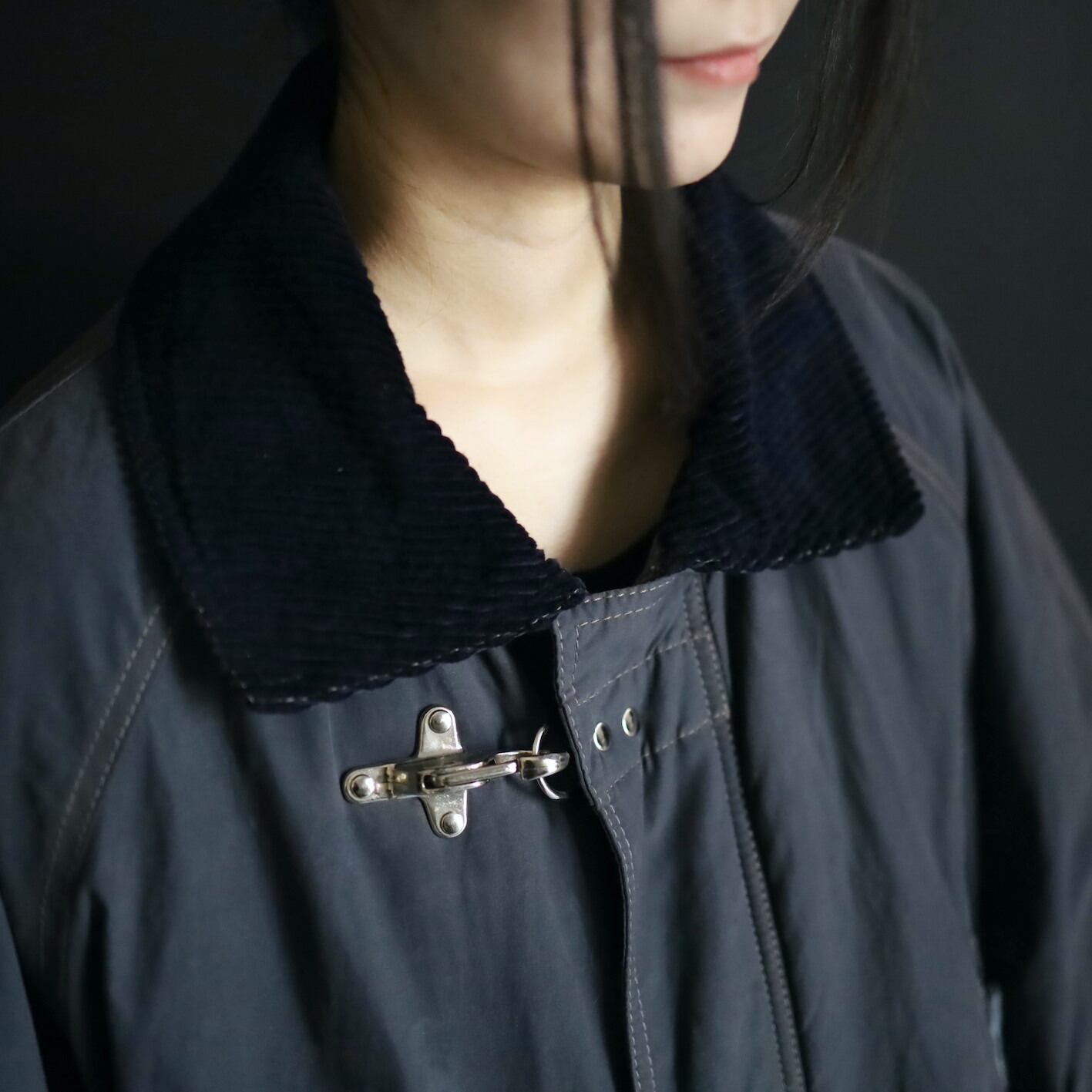 襟のコーデュロイ切替,前立てのメタルバックルボタン.