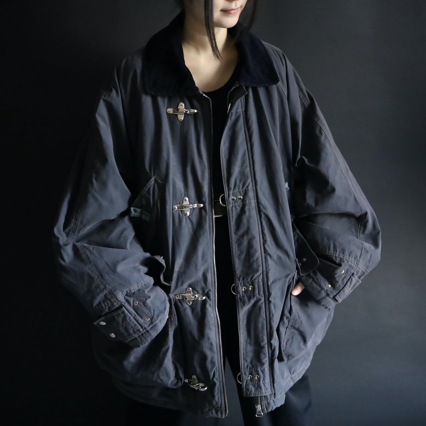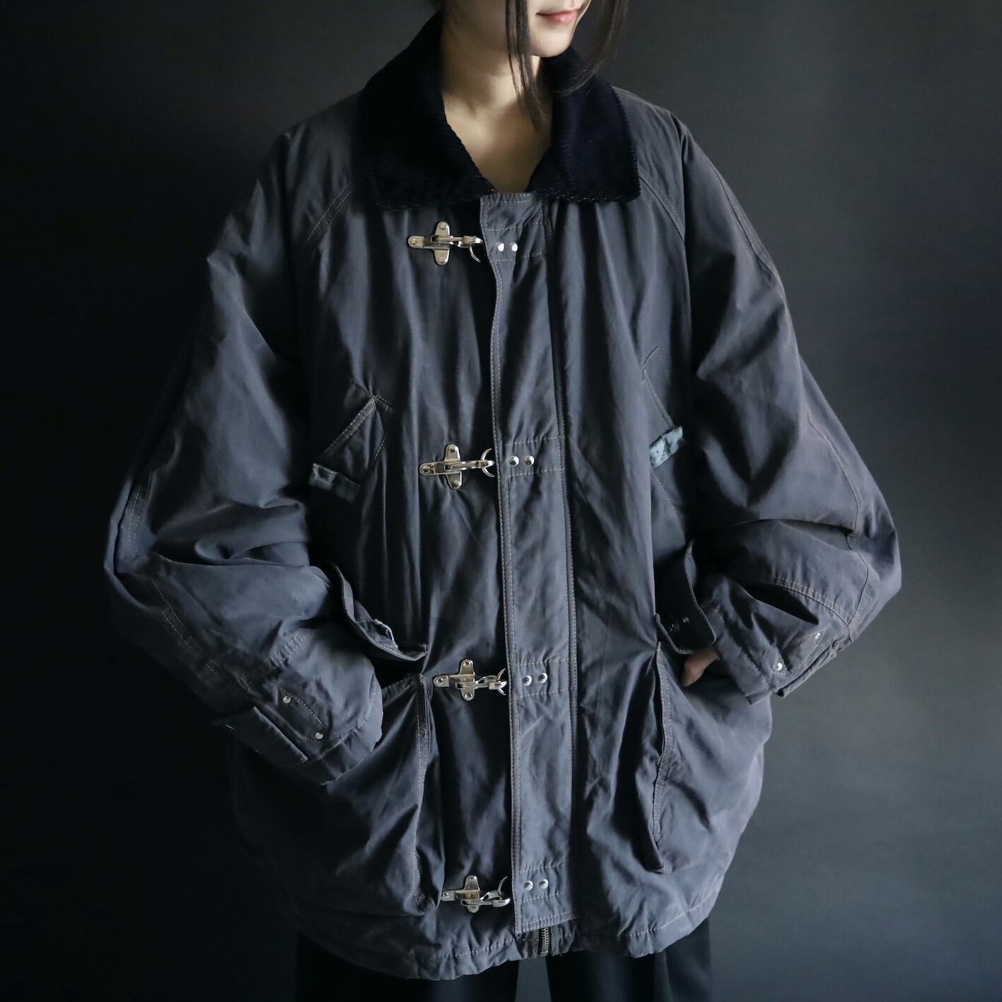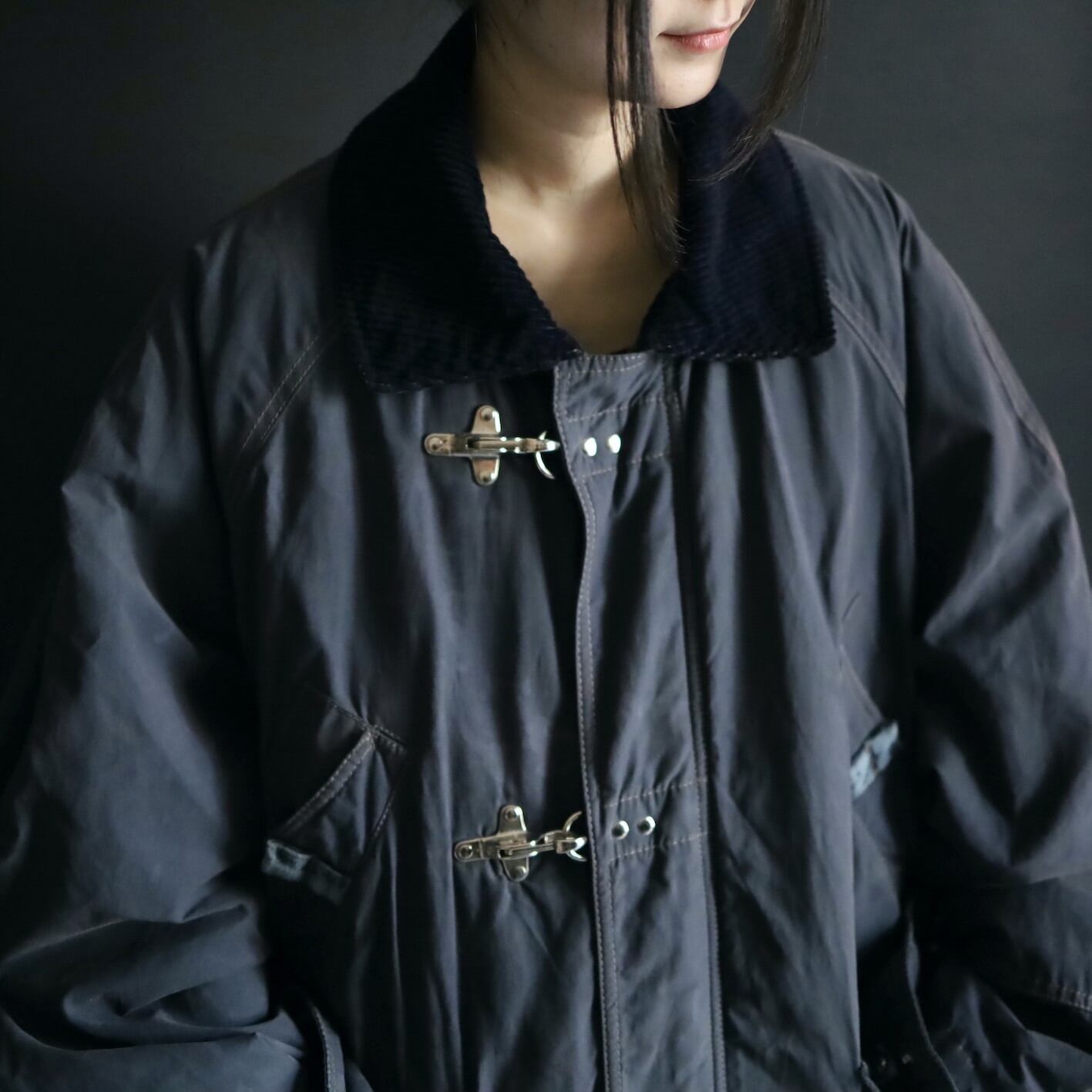 襟のコーデュロイ切替,前立てのメタルバックルボタン.