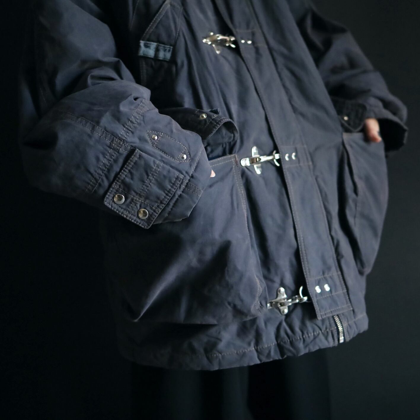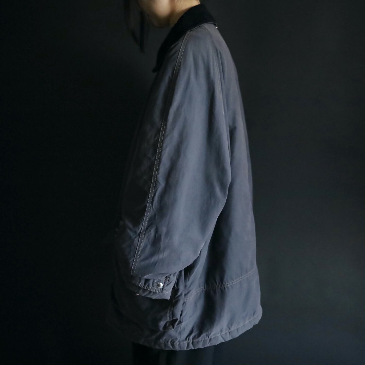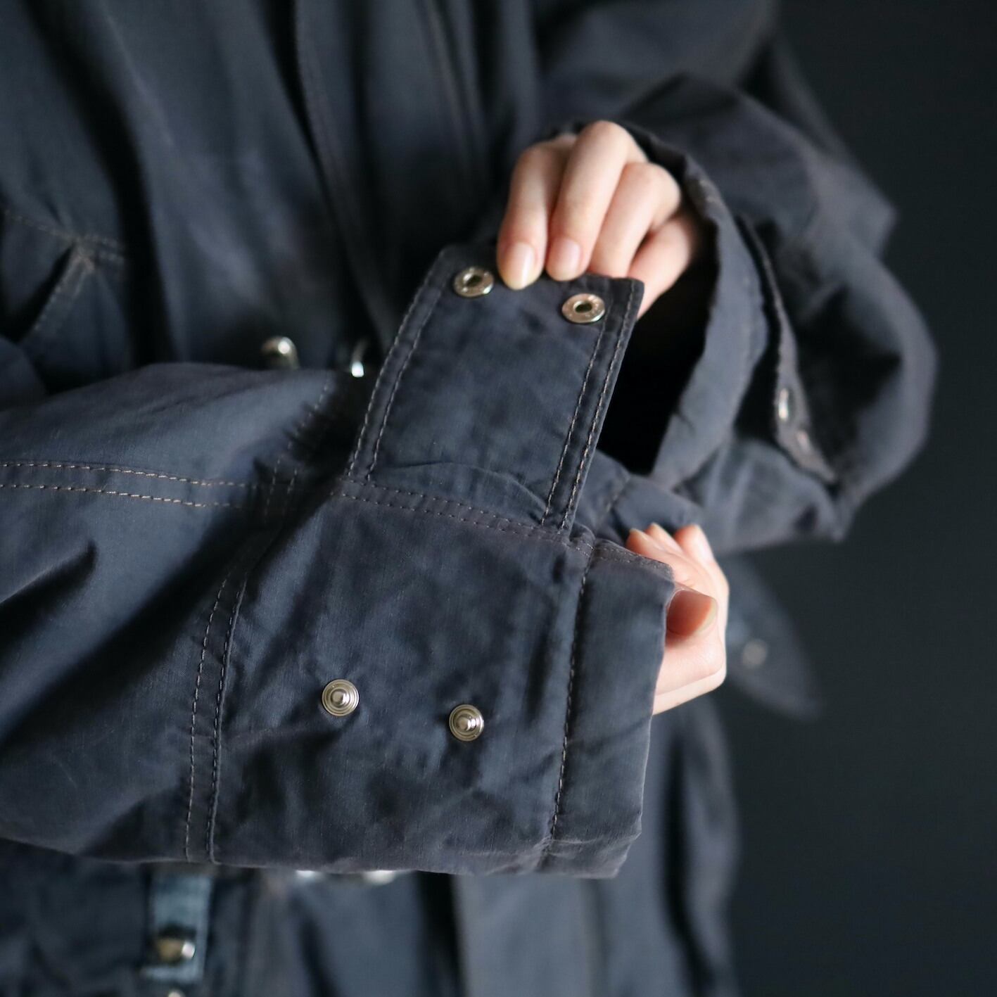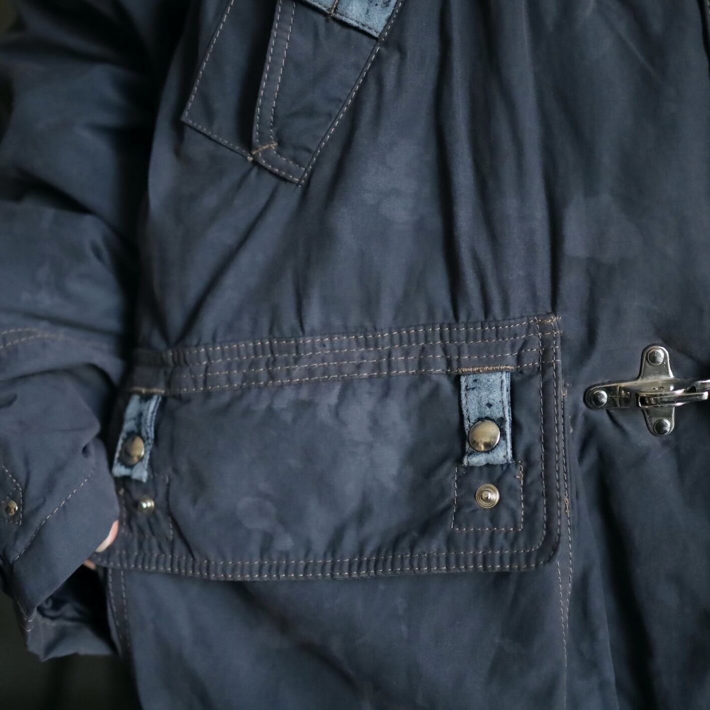襟のコーデュロイ切替,前立てのメタルバックルボタン.