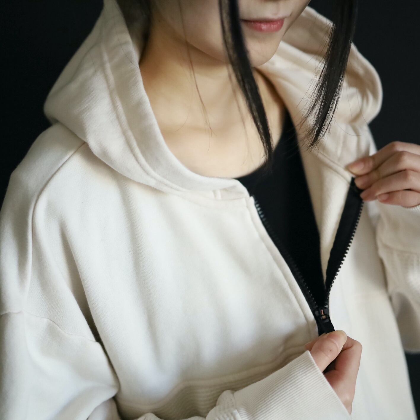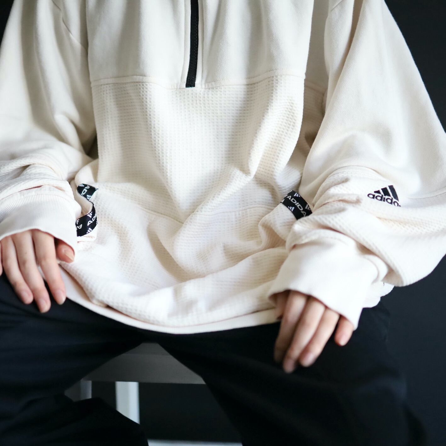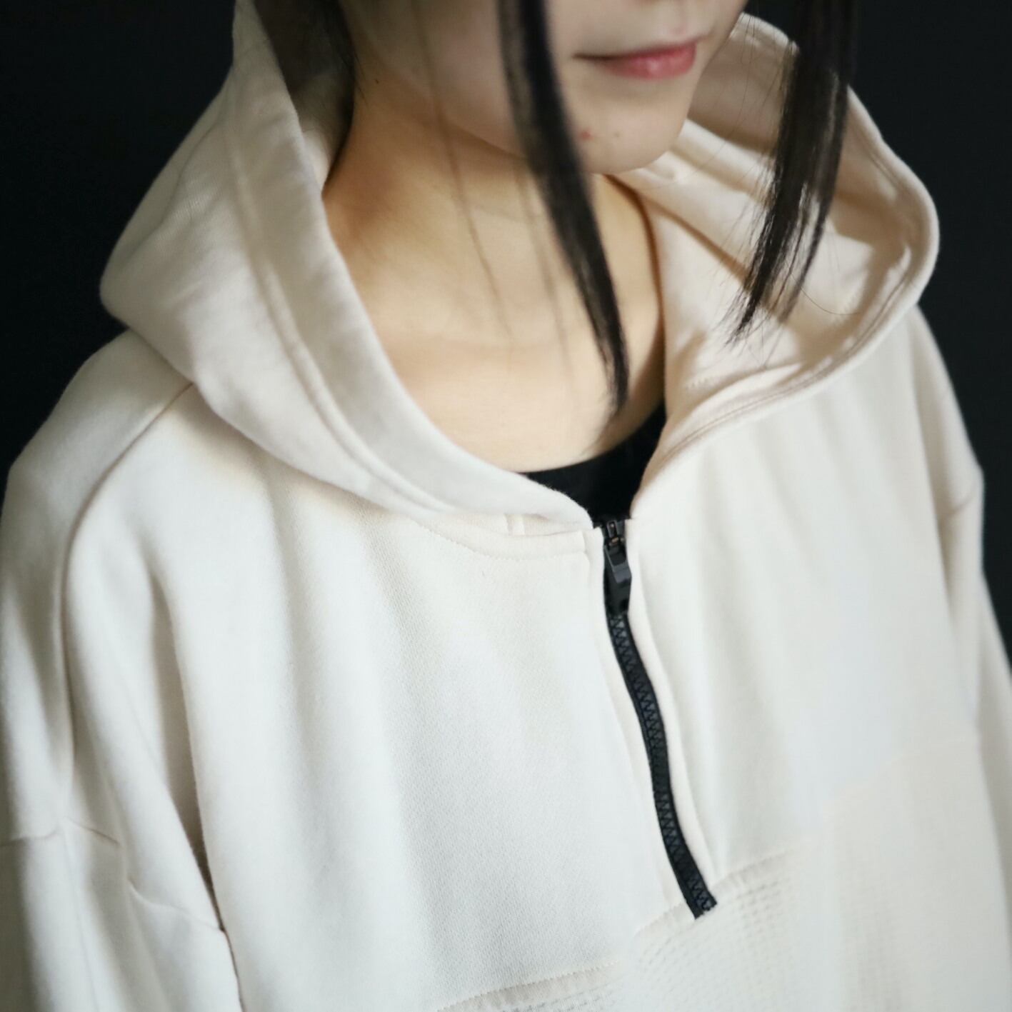 ハーフジッププルオーバータイプで,ジッパーはブラック,マフポケット口もブラックのラインデザイン.
