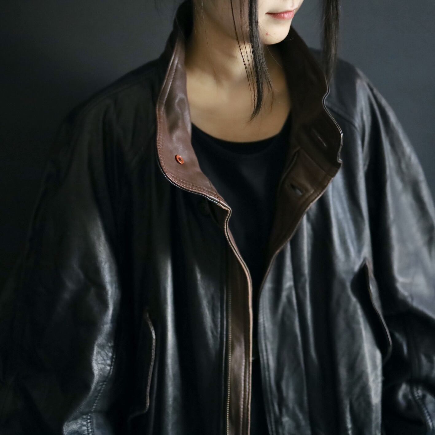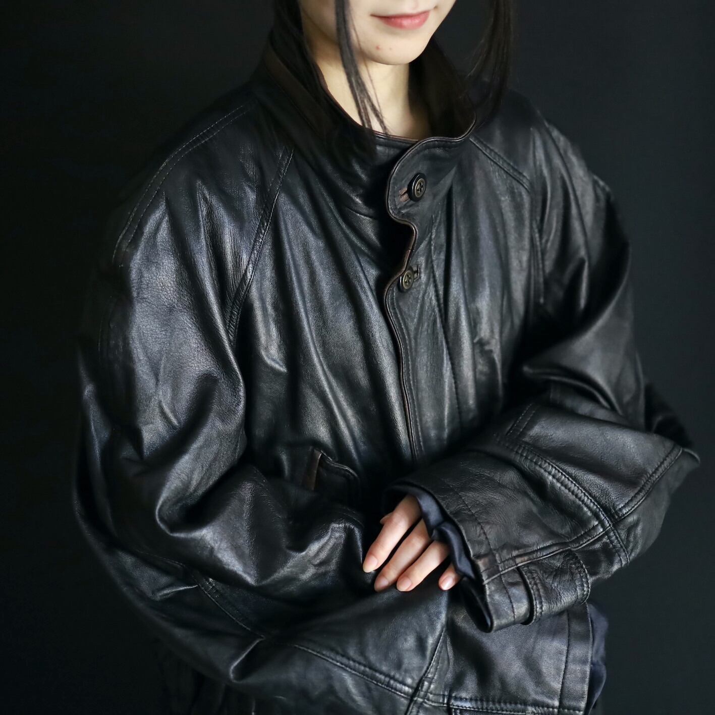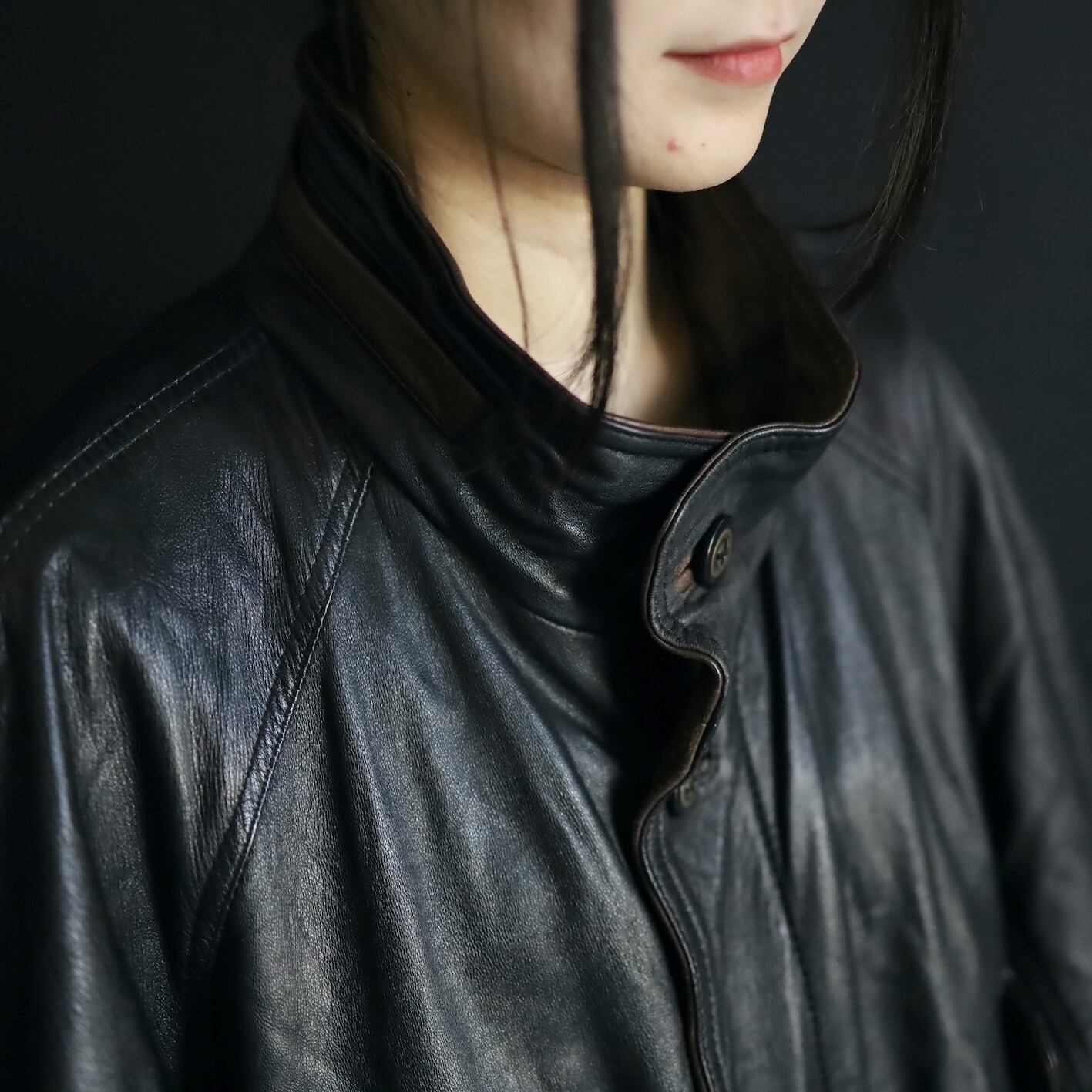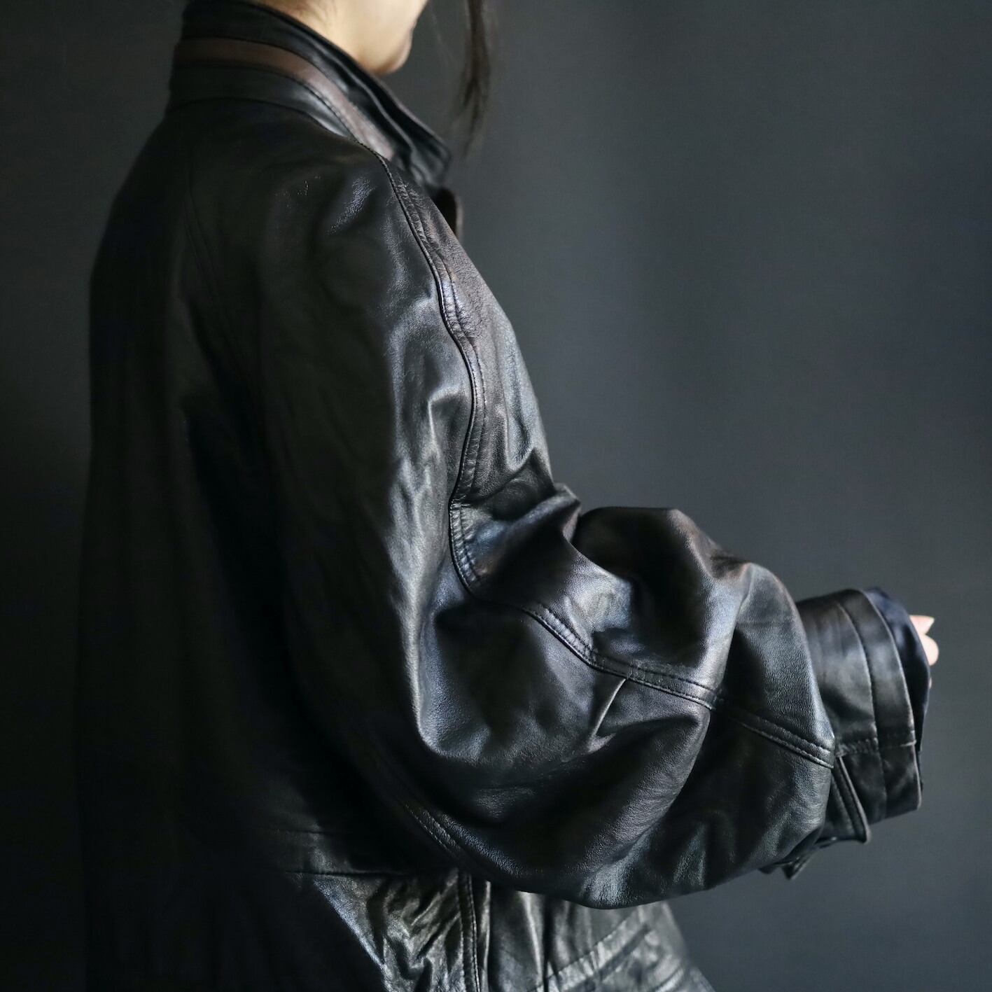 ミドル丈のレザーハイネックブルゾンの入荷です.