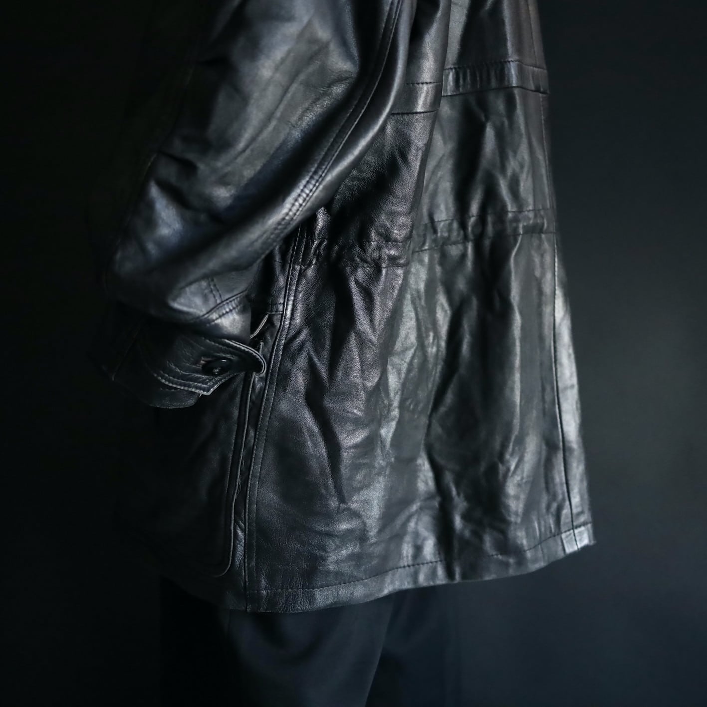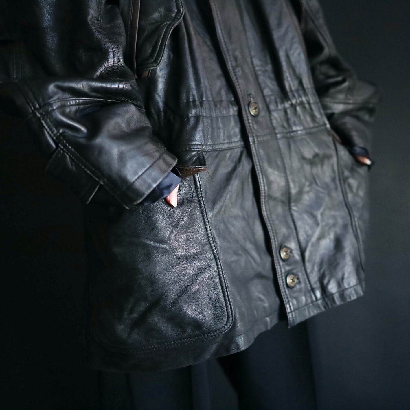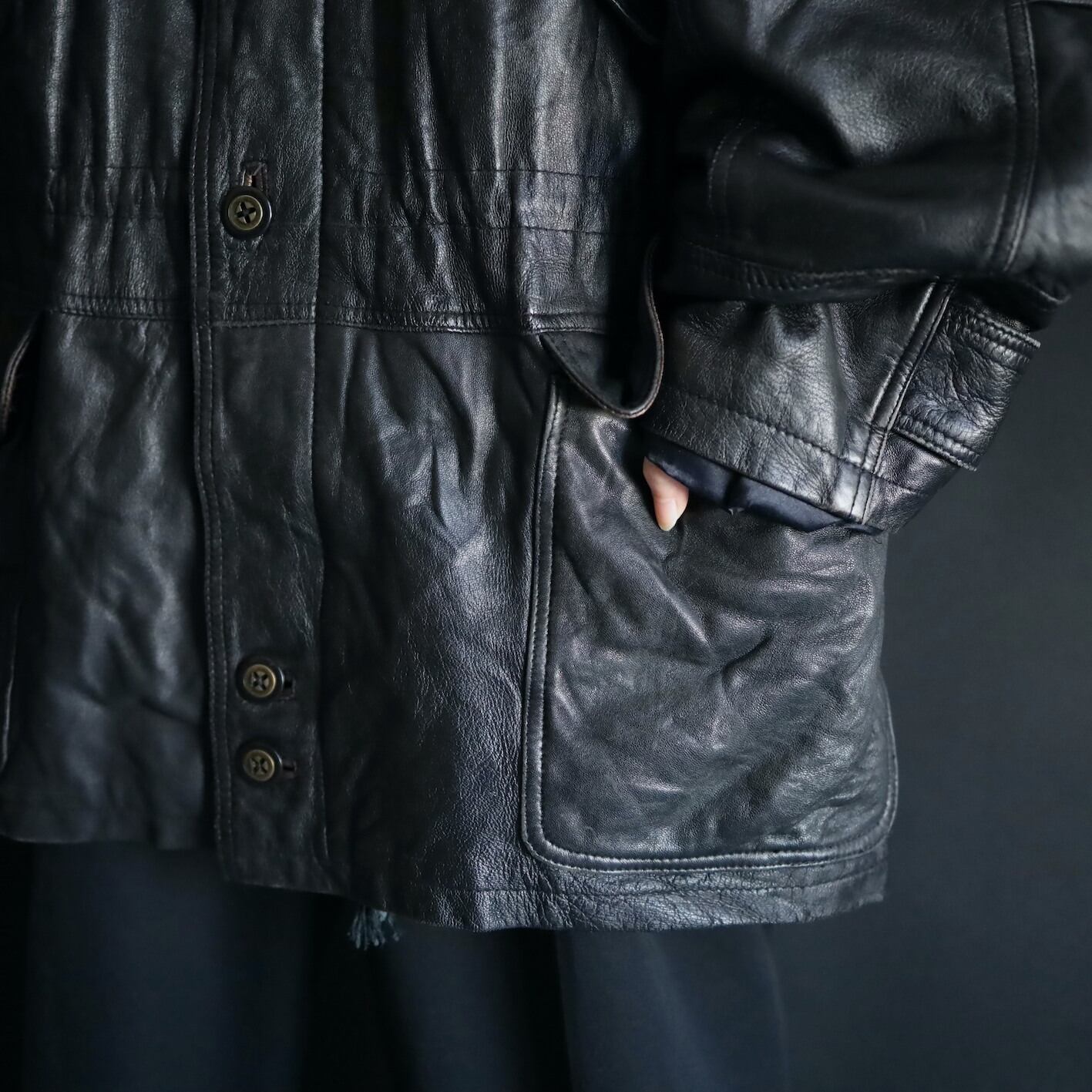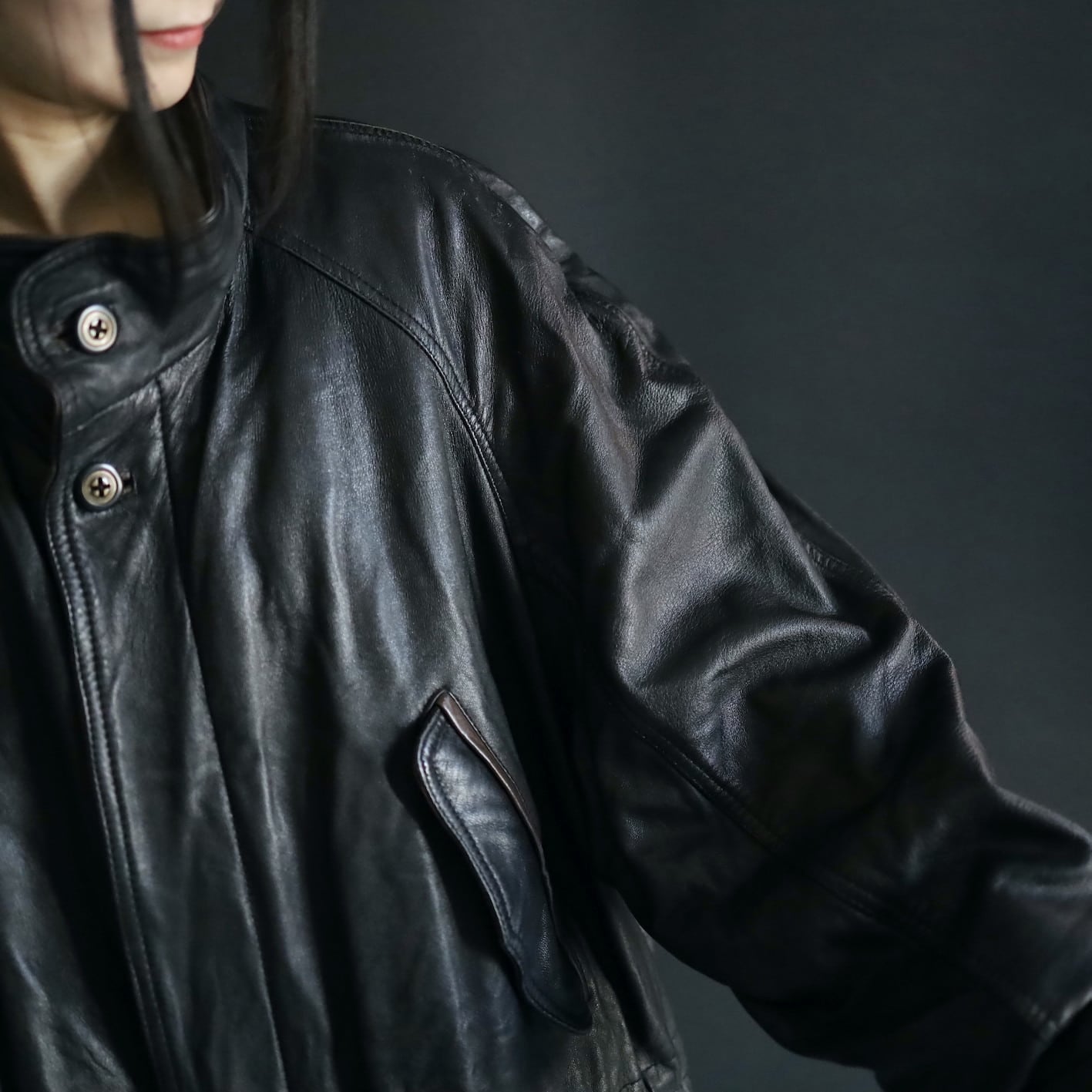 ミドル丈のレザーハイネックブルゾンの入荷です.