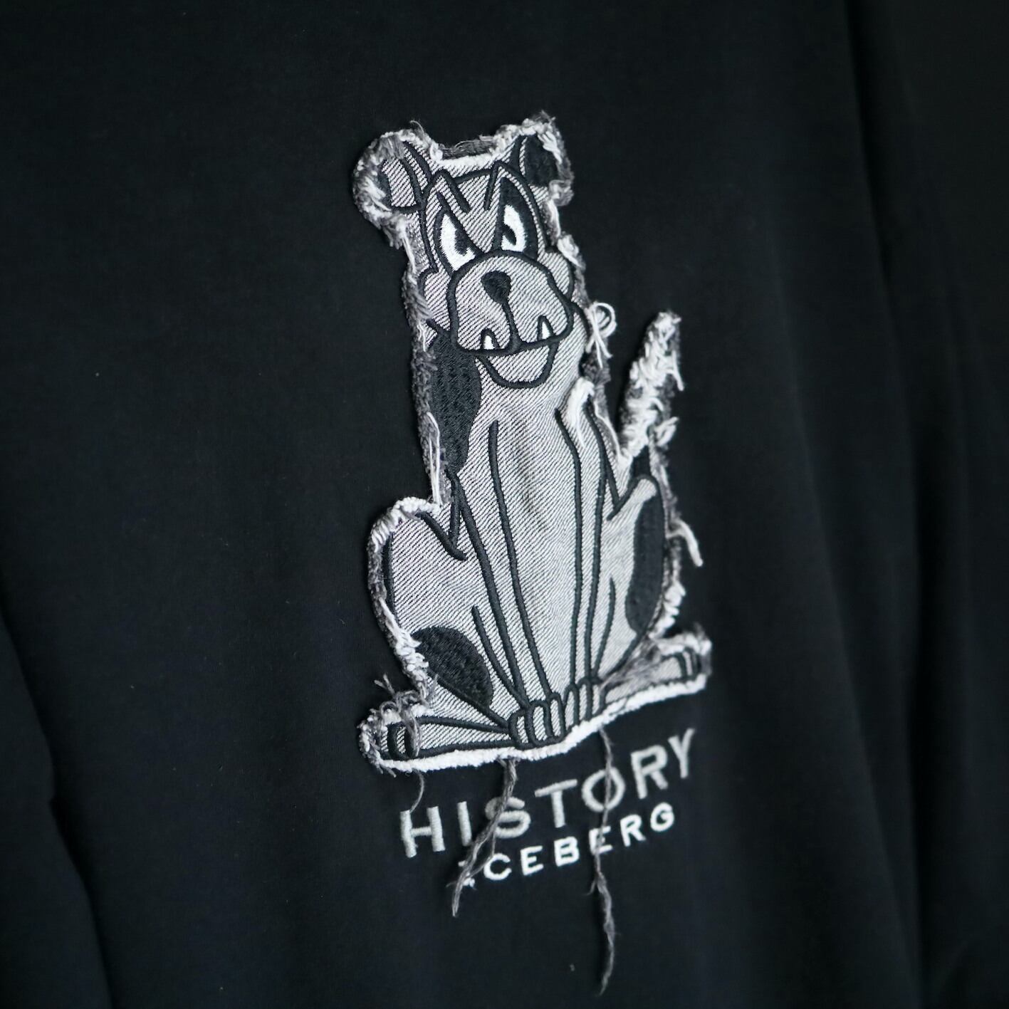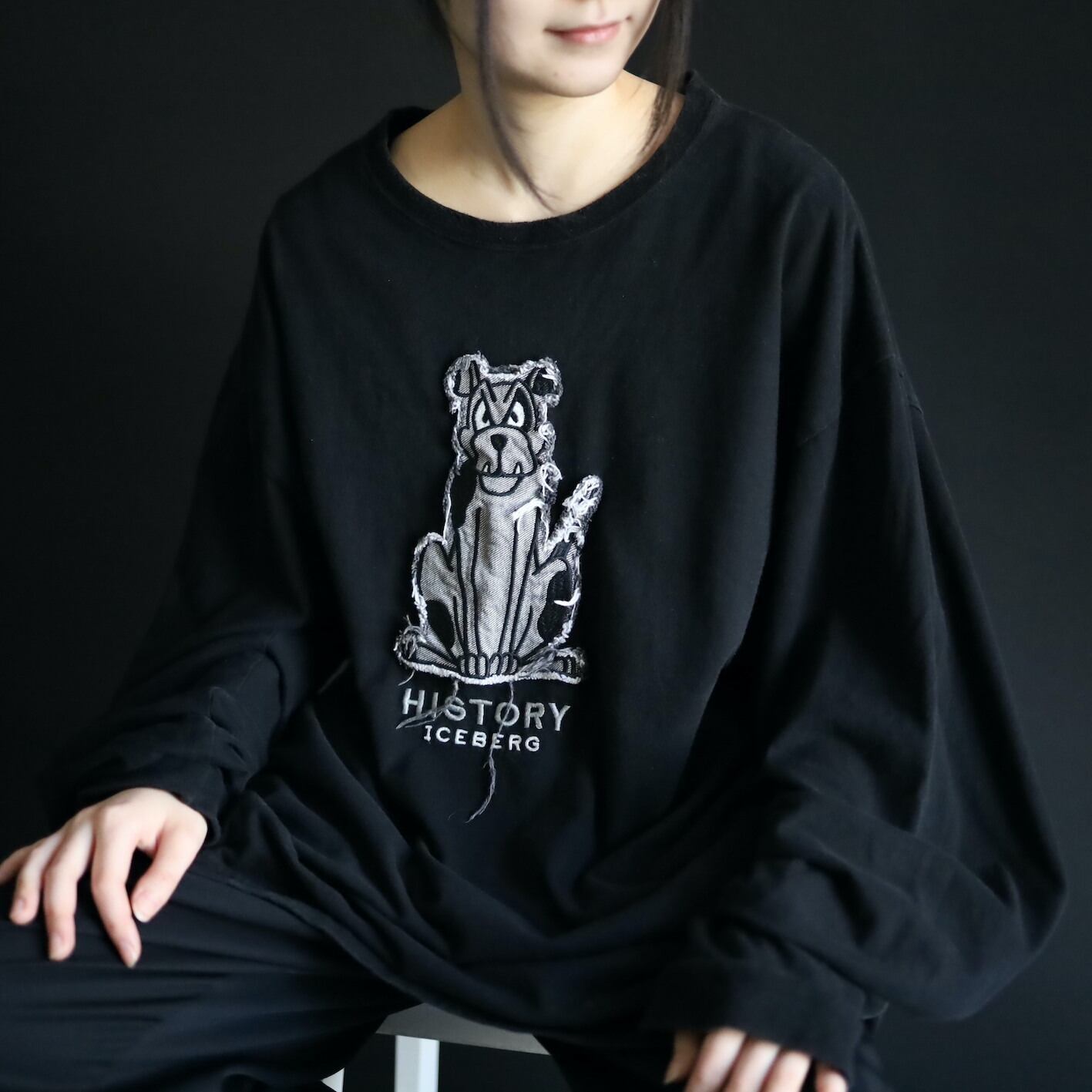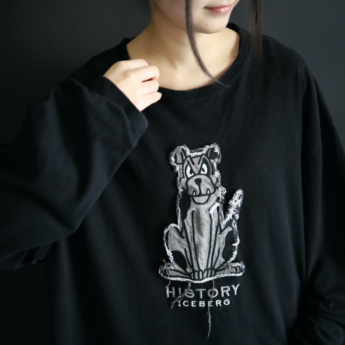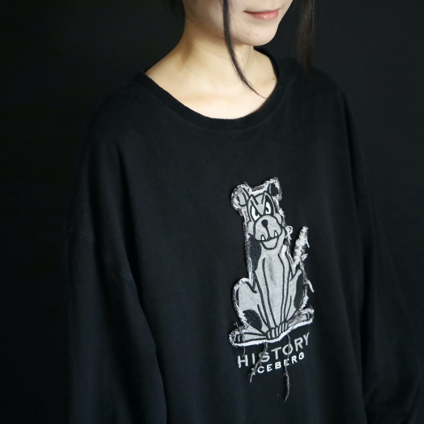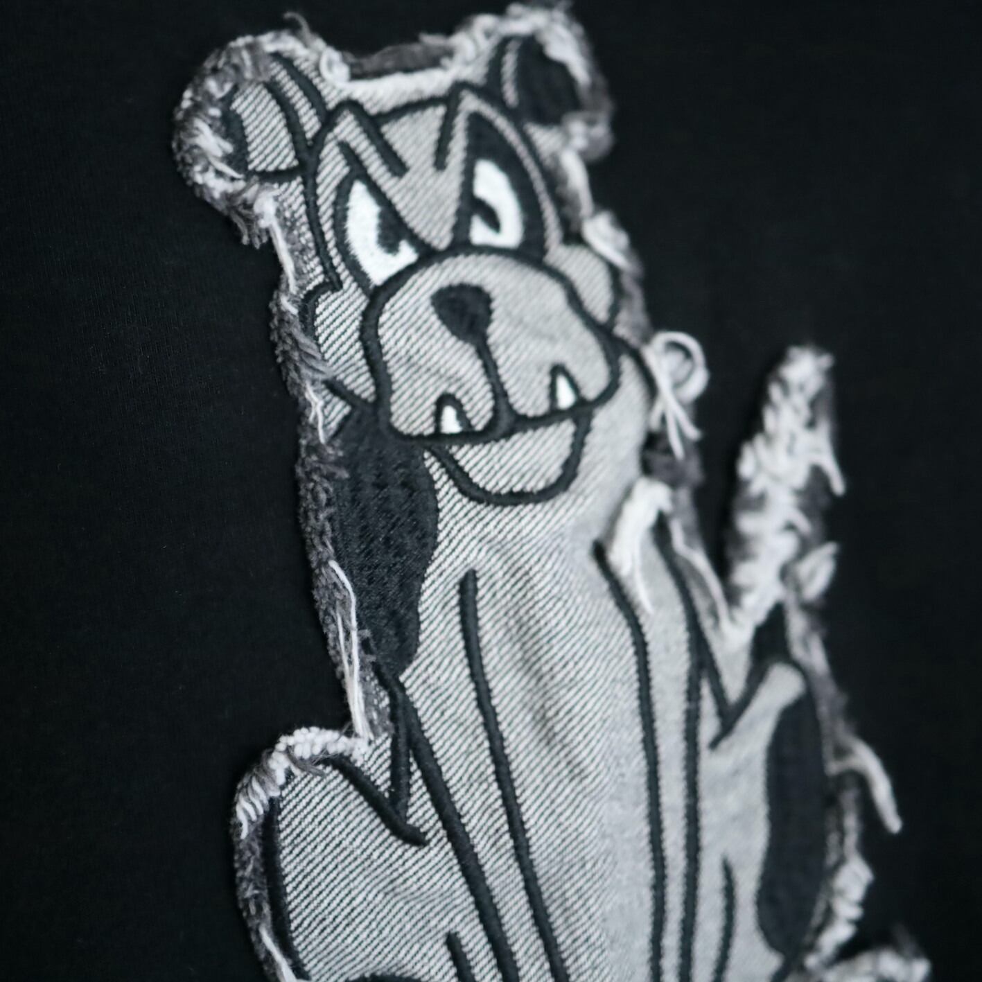 フロントにおすわりしたワンコのデニムパッチワーク.