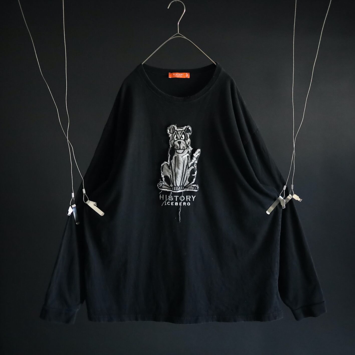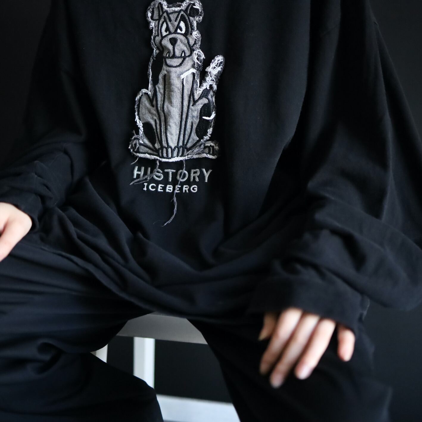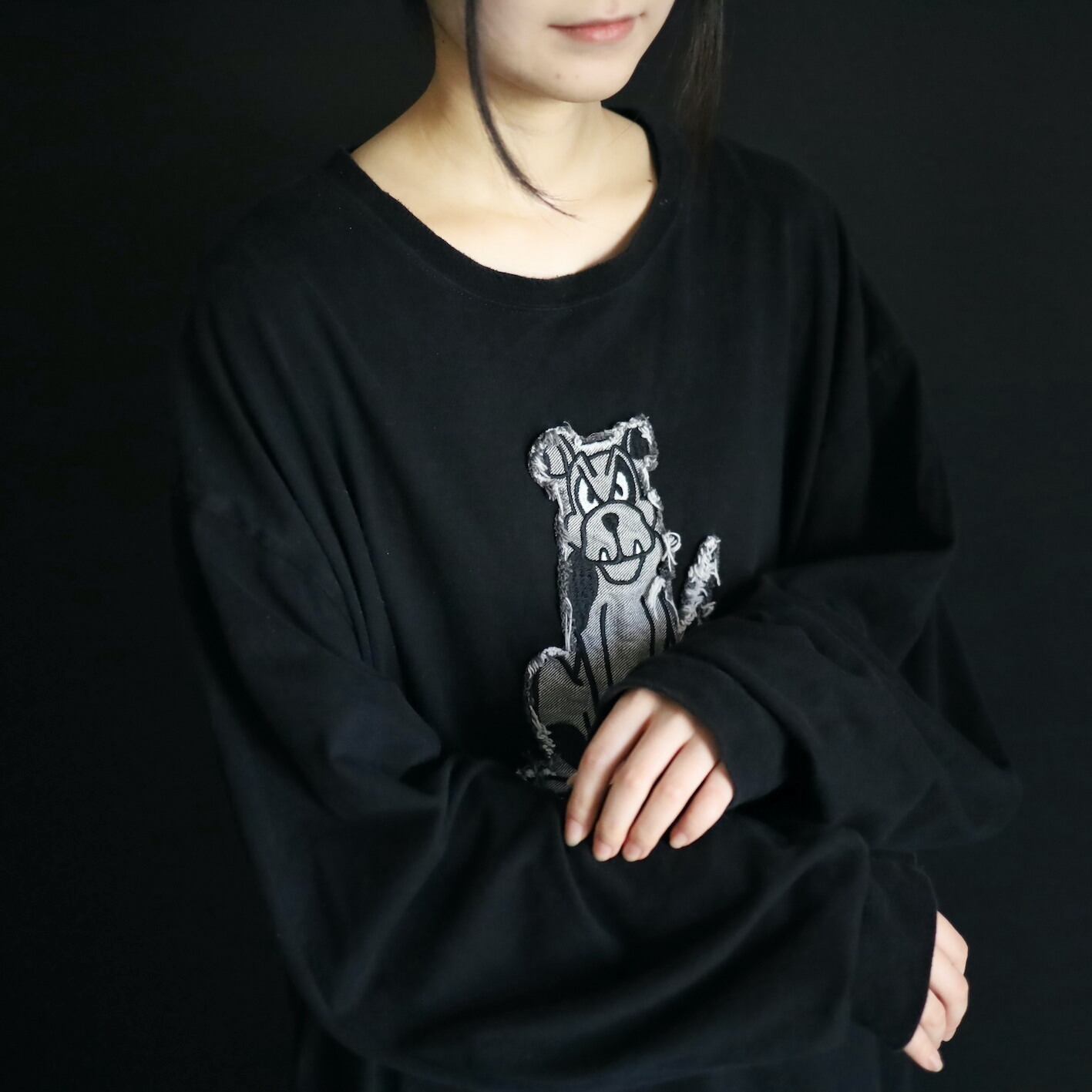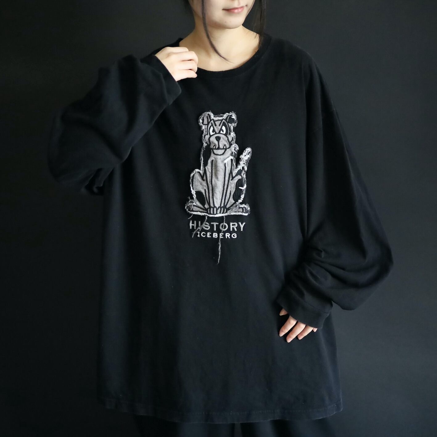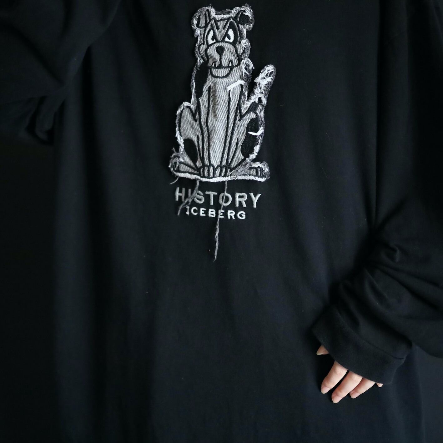 フロントにおすわりしたワンコのデニムパッチワーク.