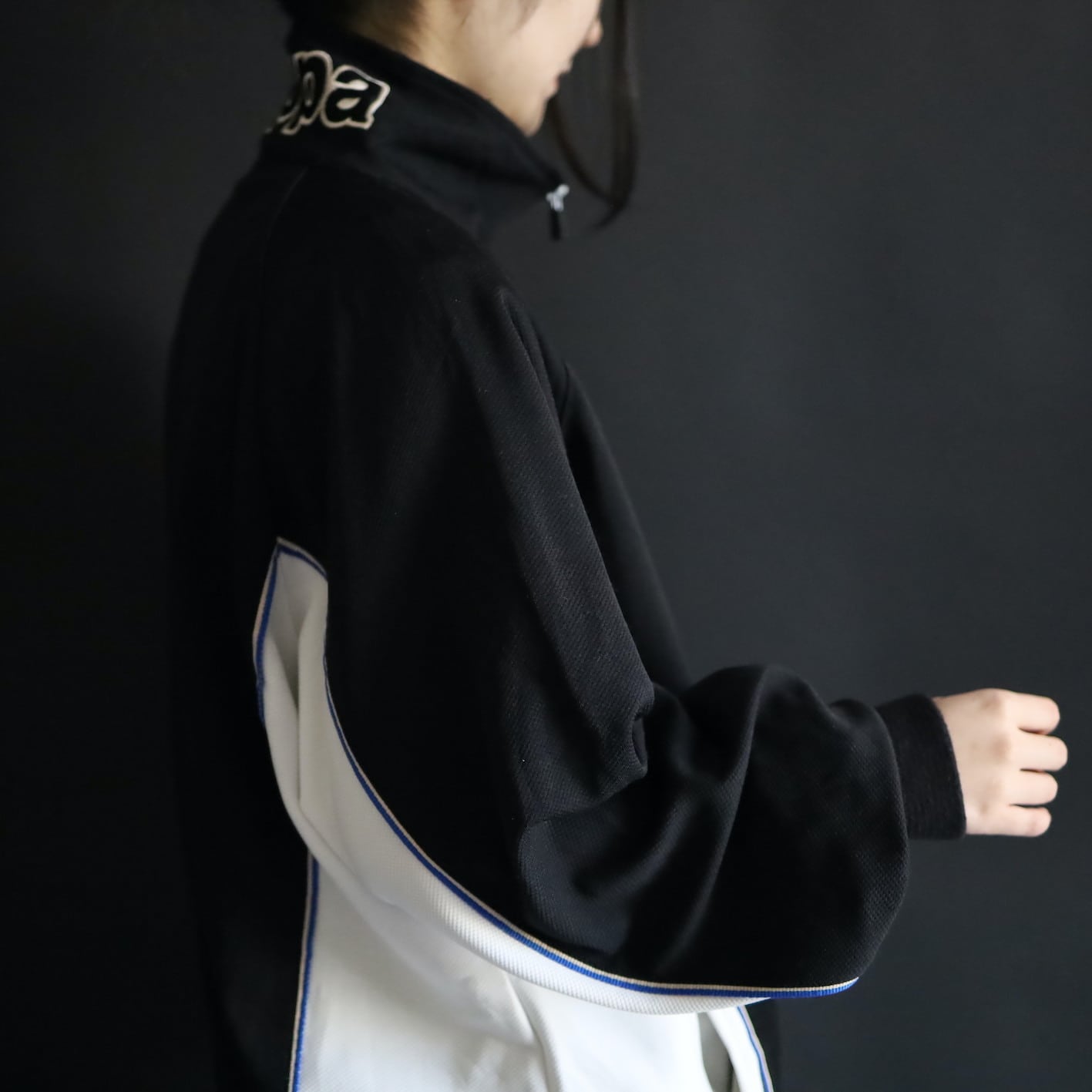 胸元にはブランドロゴ,ハイネック後にはブランドネーム.