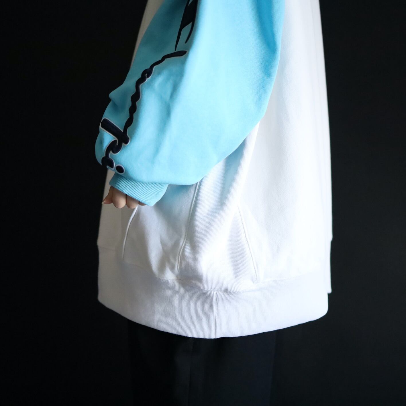 胸のビッグロゴ,袖先の目玉ロゴ刺繍に加えて,両袖に入ったブランドネーム刺繍もいいアクセント.