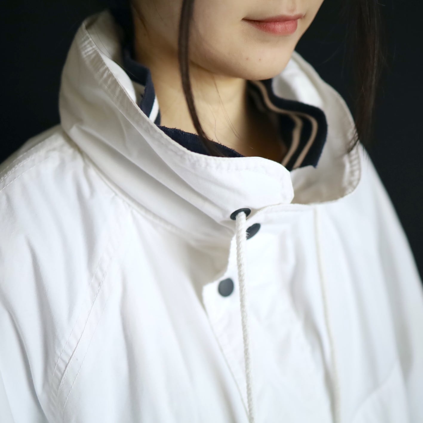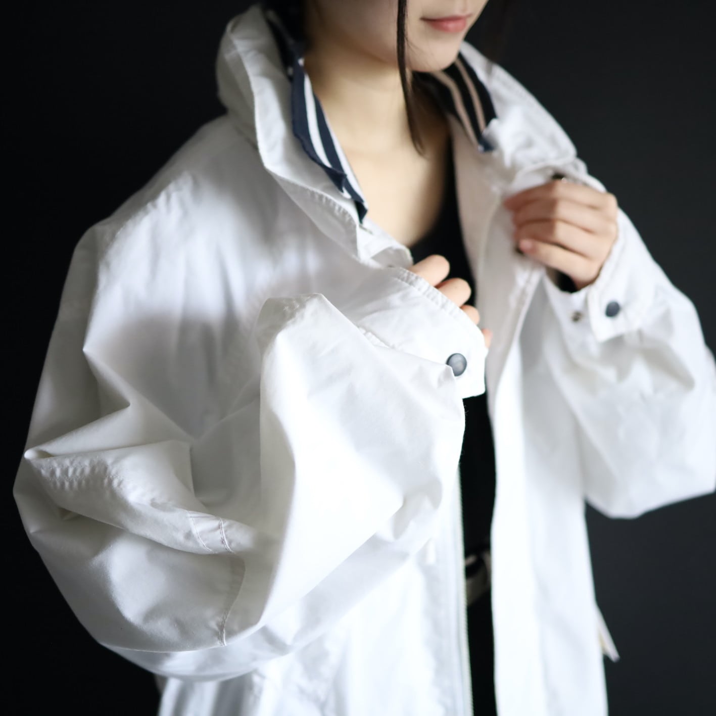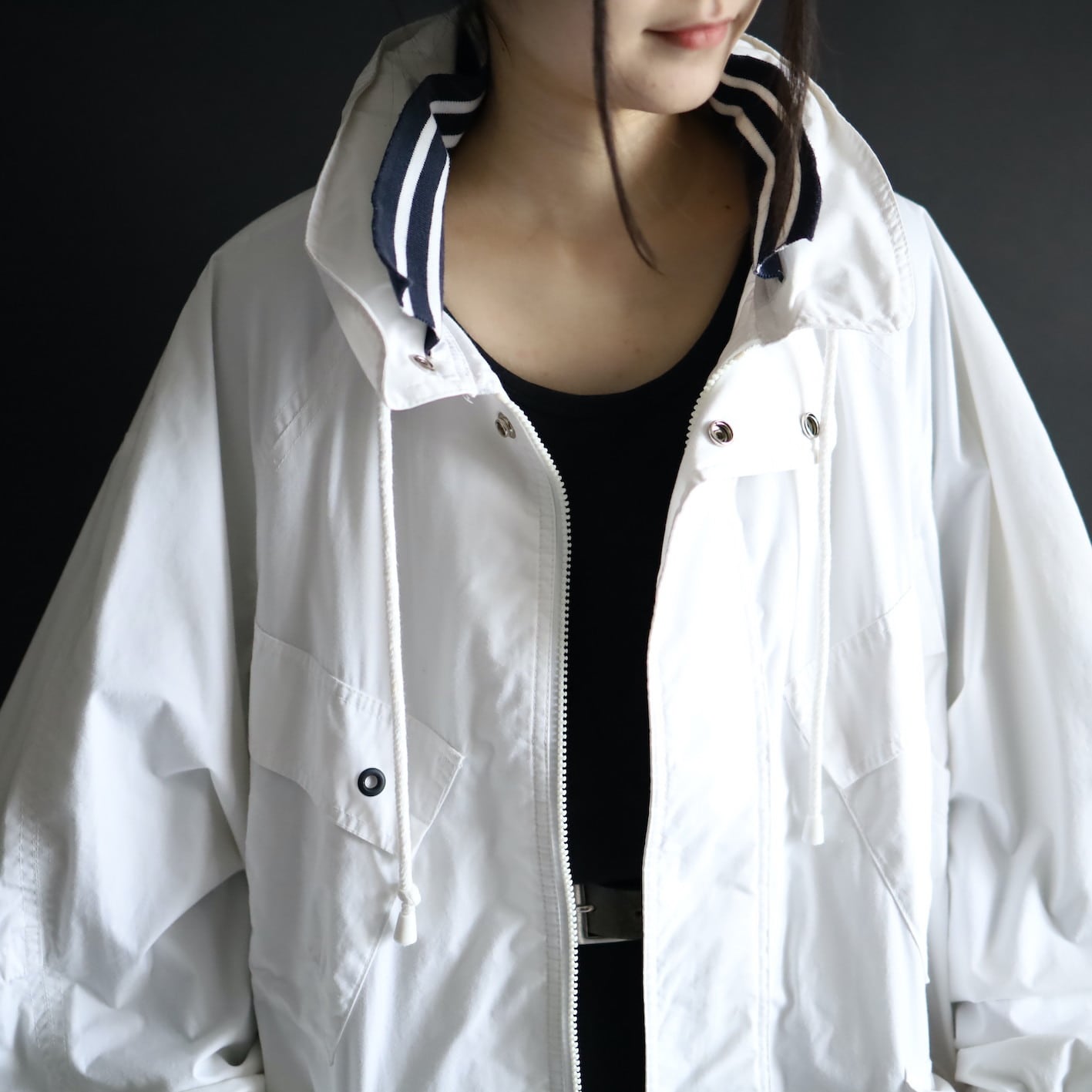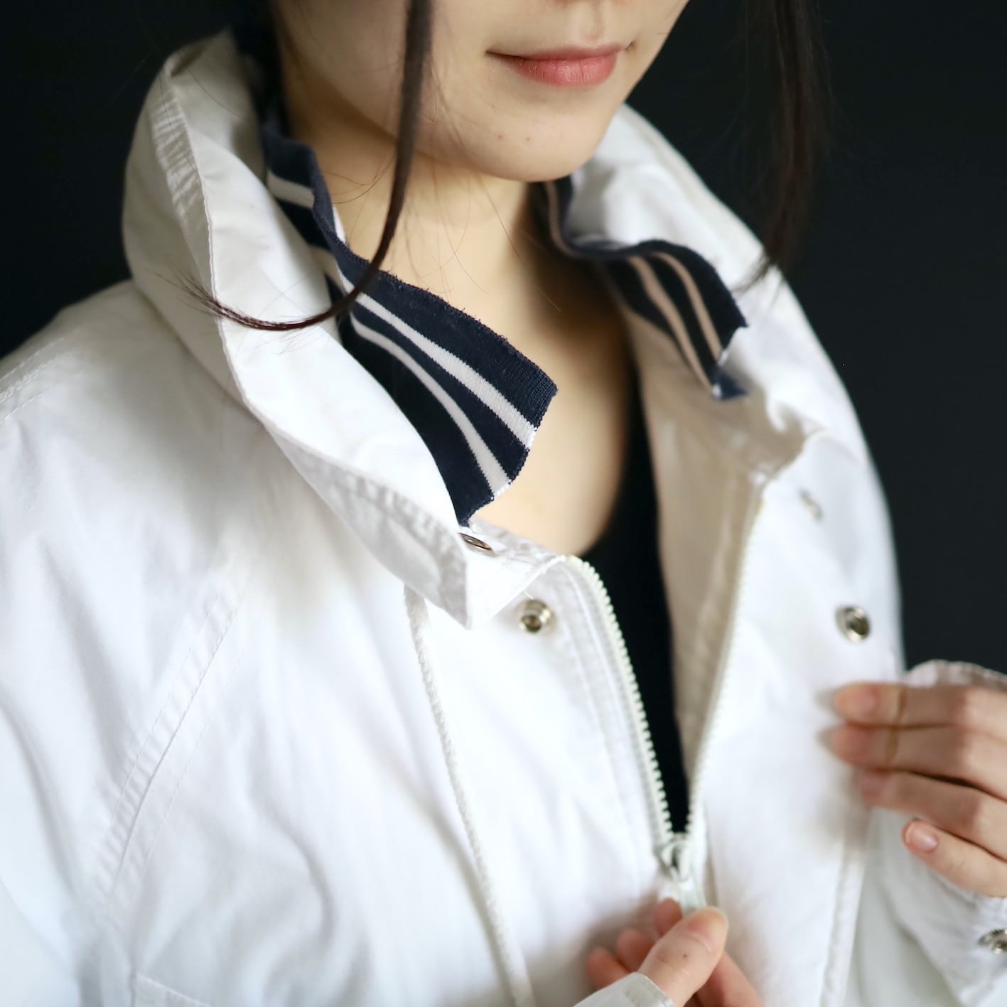 首元のネイビー×ホワイトラインのリブ切替が,淡白なボディとコントラストが効いてます.