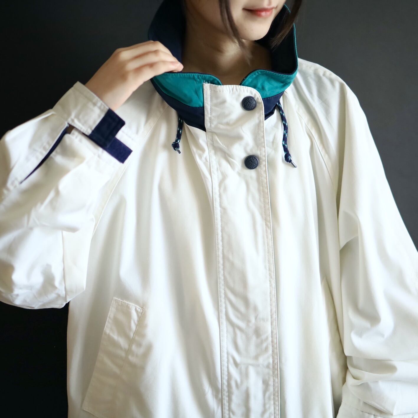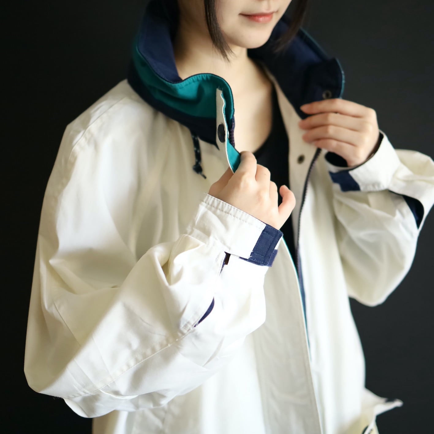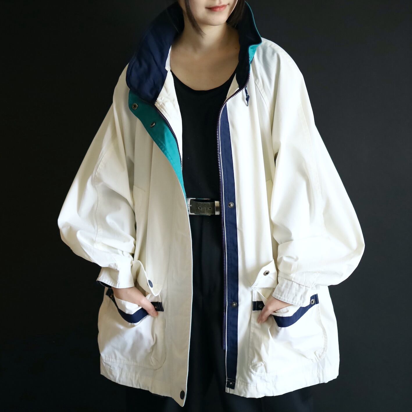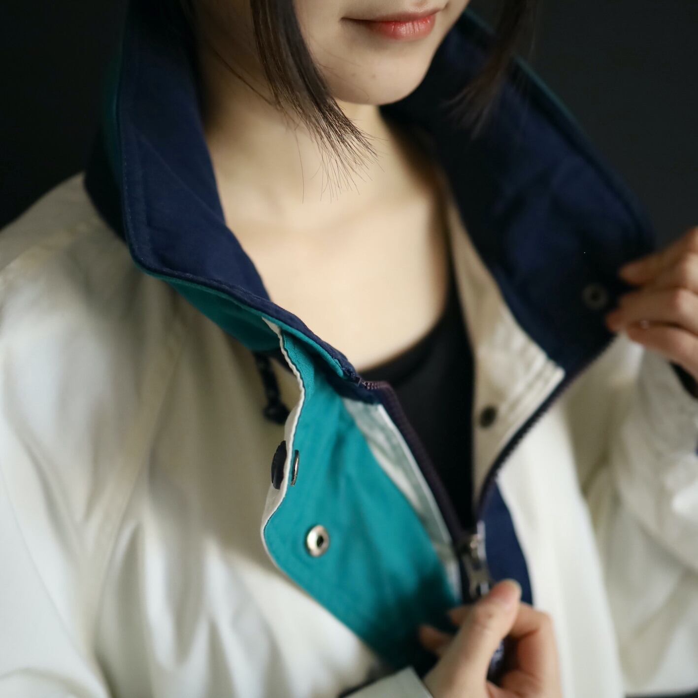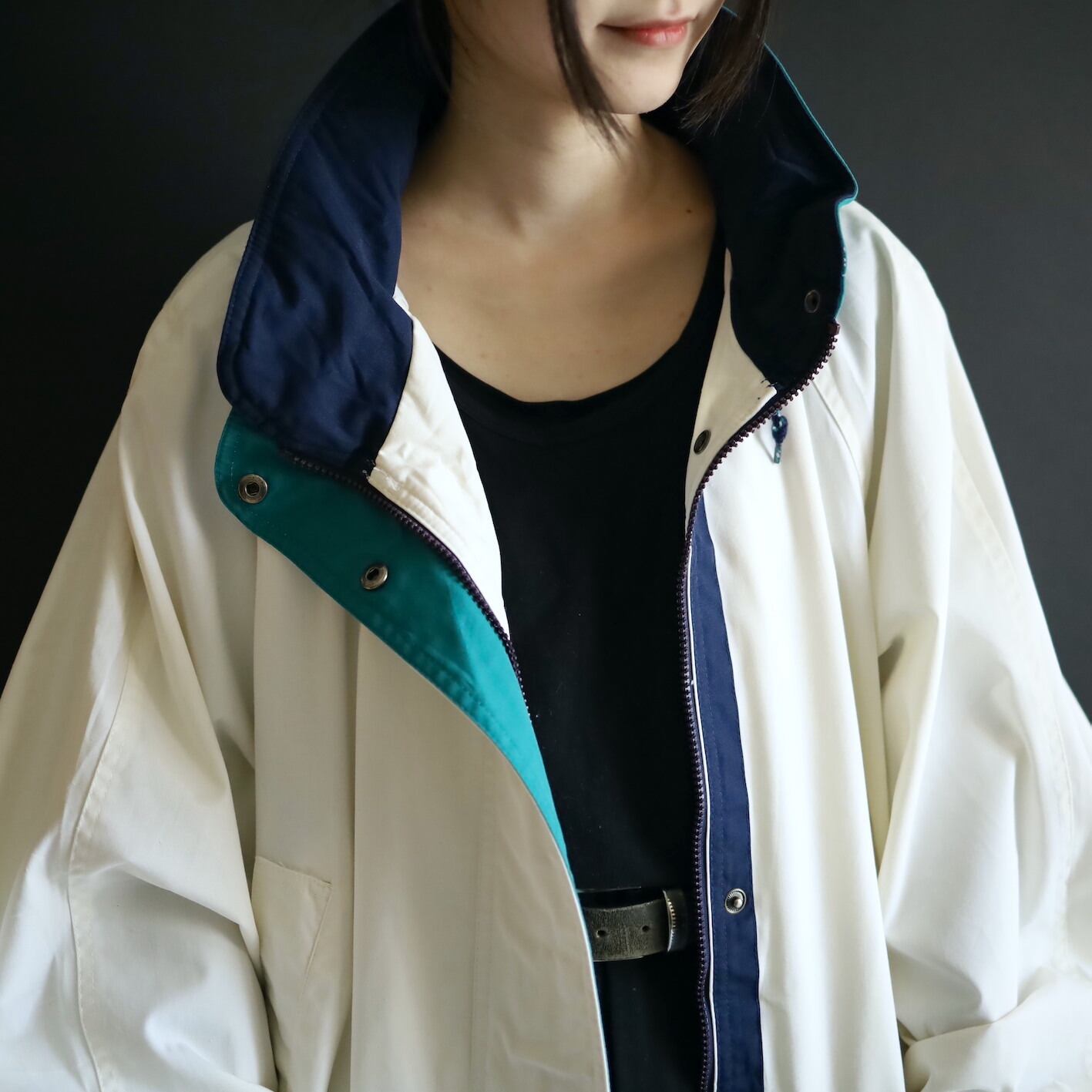ハイネック部はネイビー×エメラルドグリーン切替.