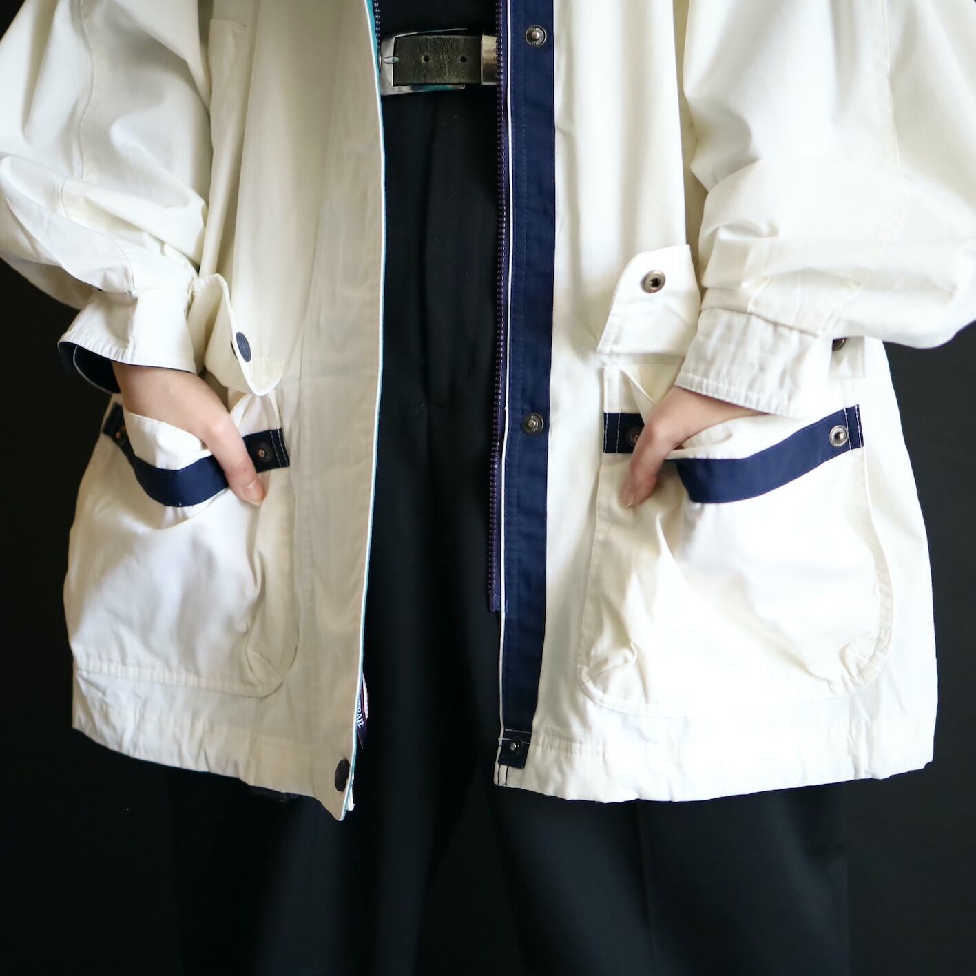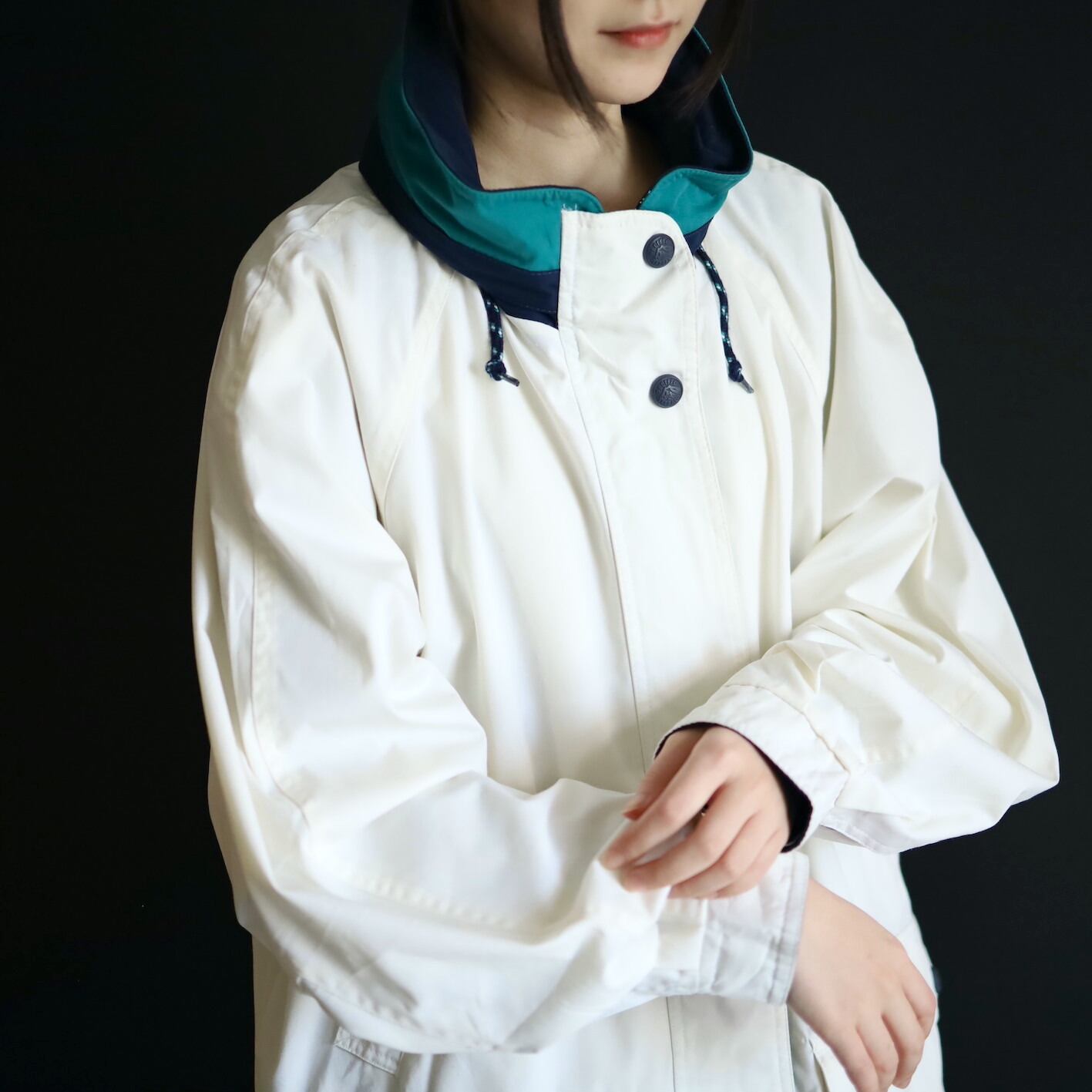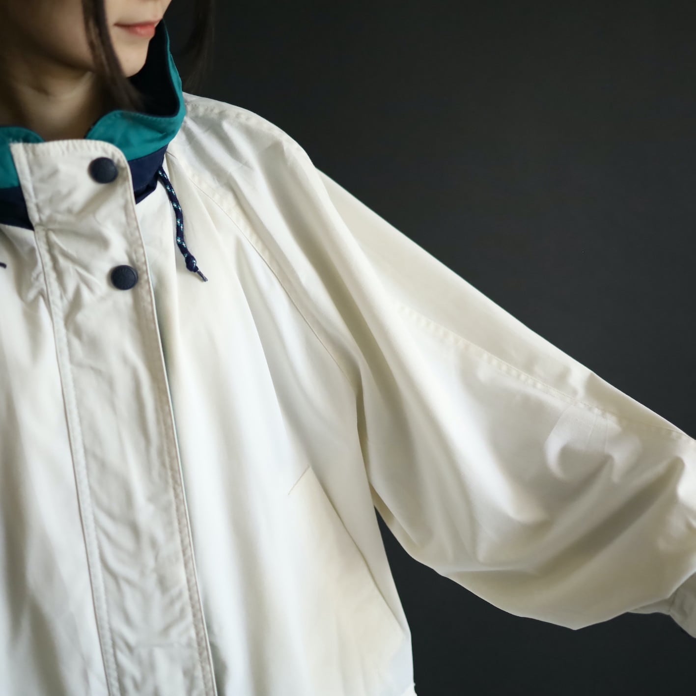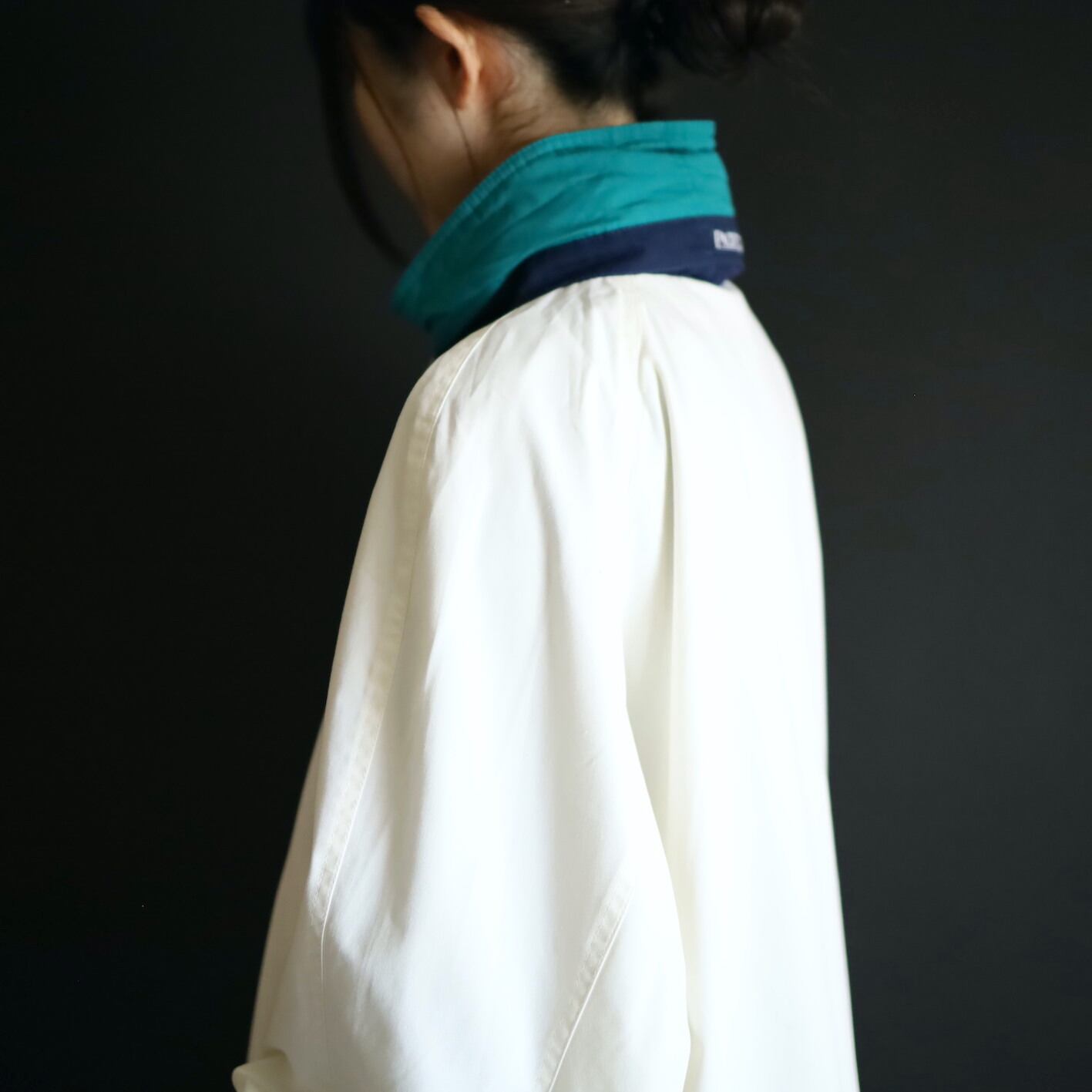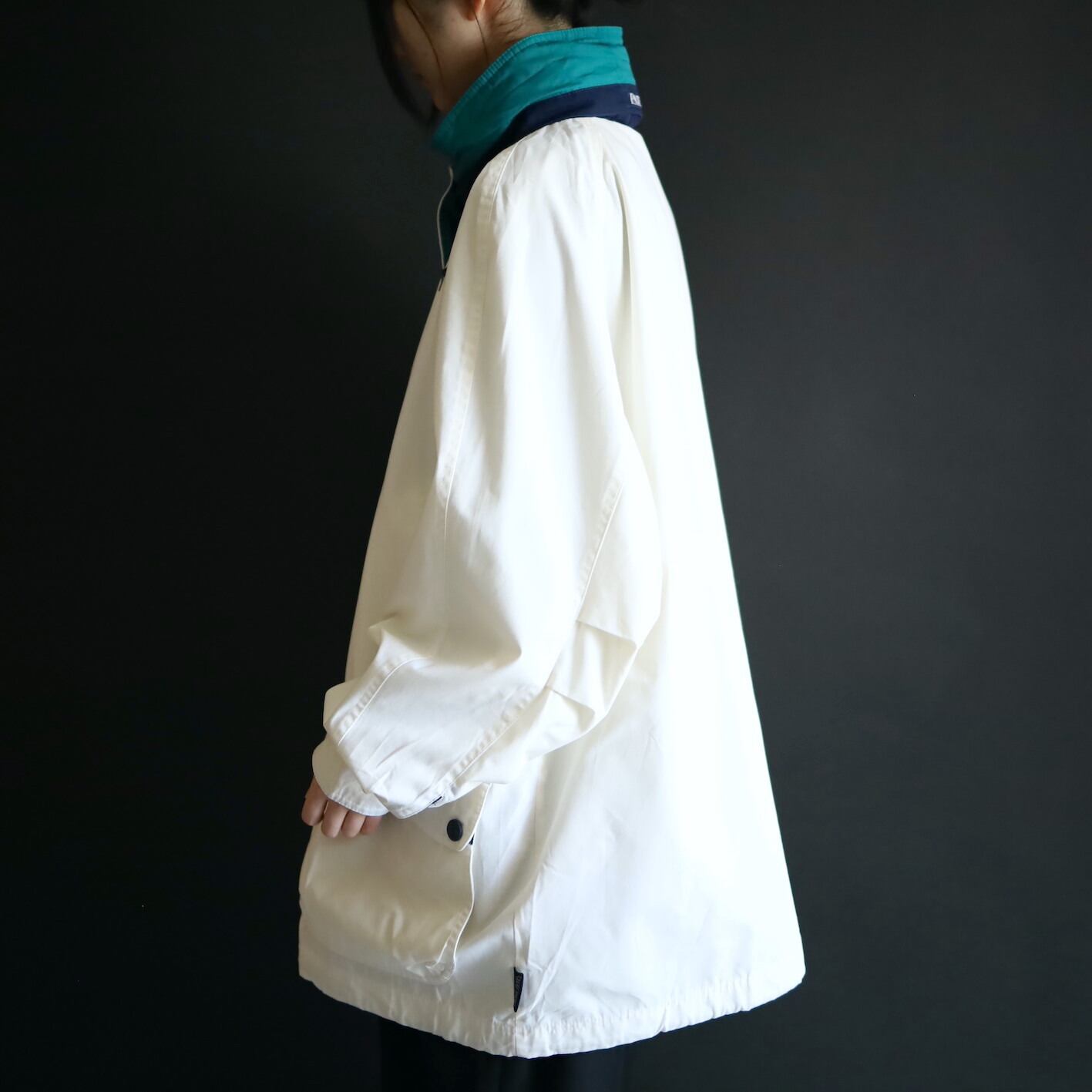 ハイネック部はネイビー×エメラルドグリーン切替.