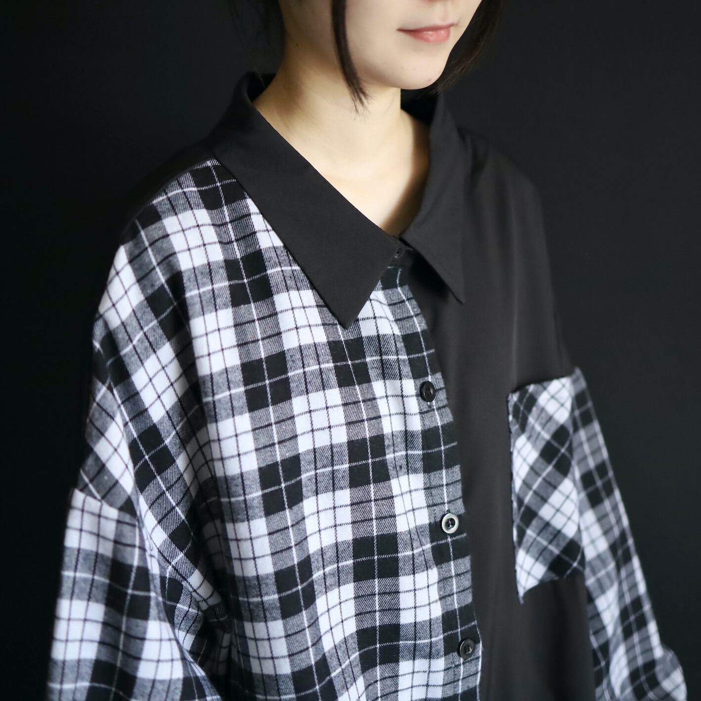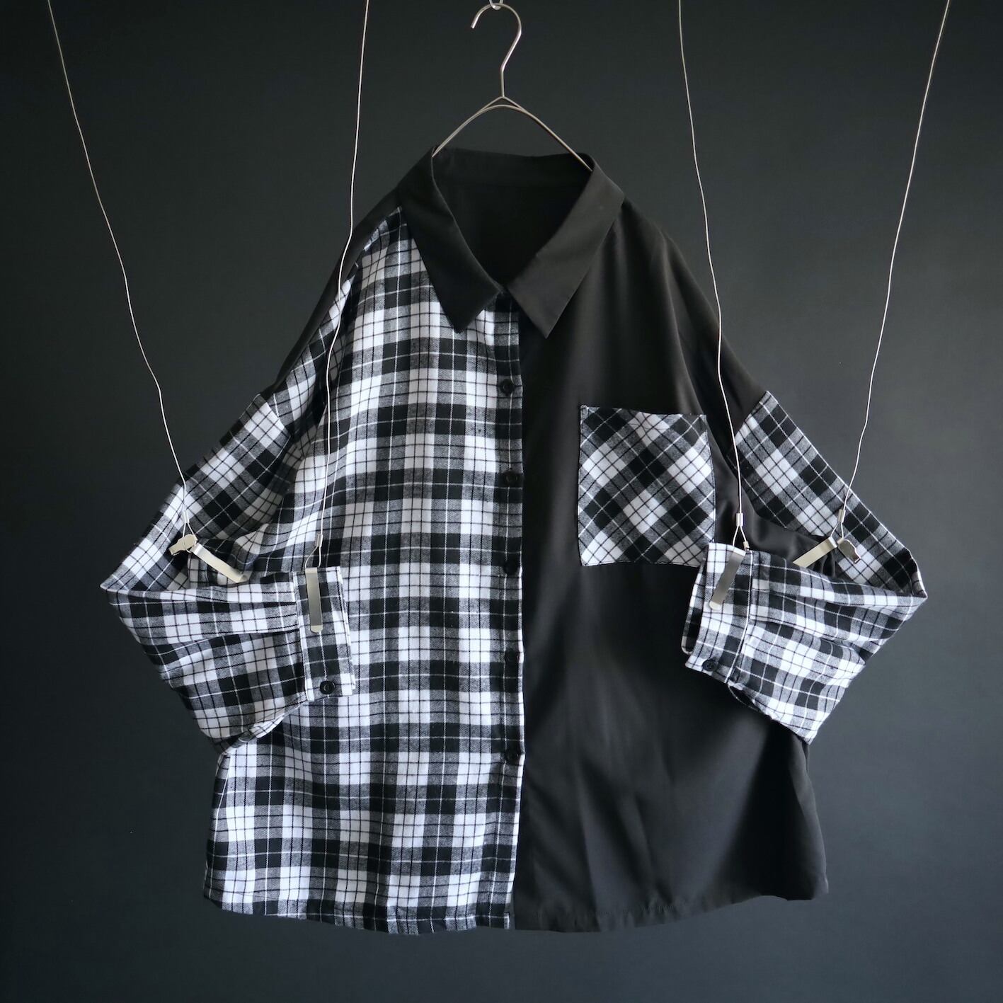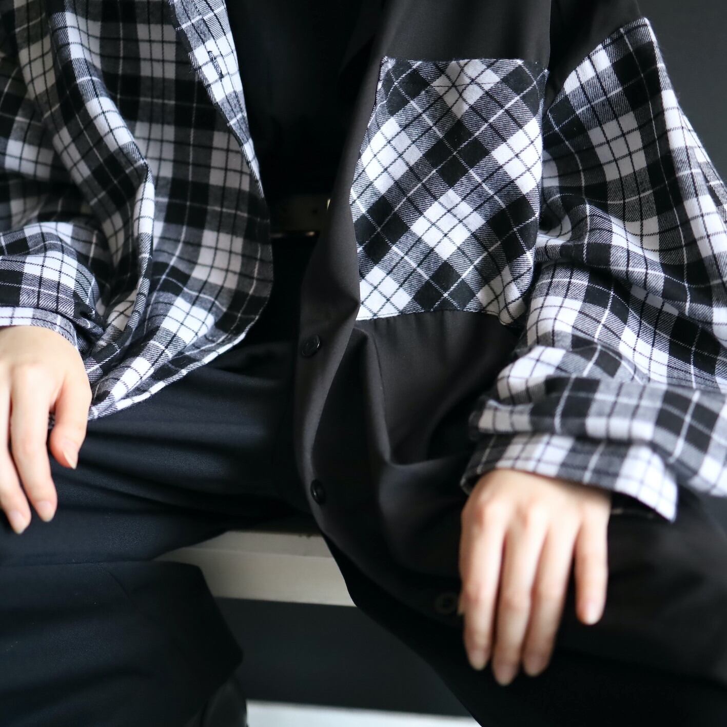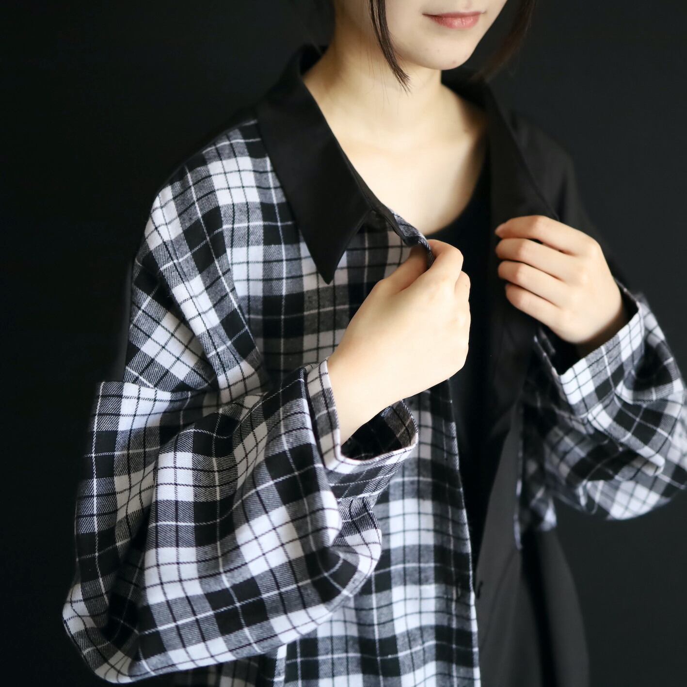 ブラック×ホワイトのモノクロチェックのフランネルと,ハリツヤのあるブラック生地の切替.