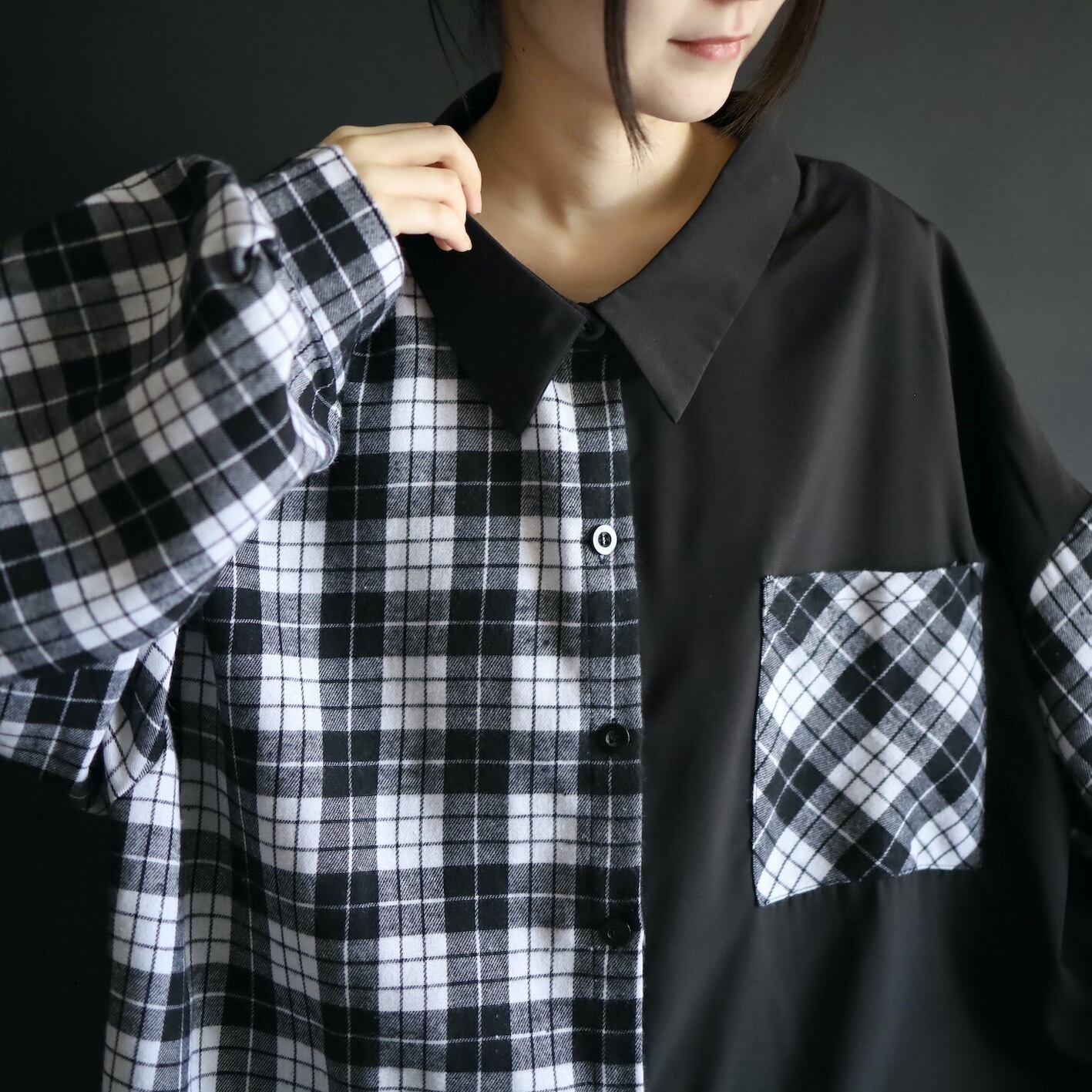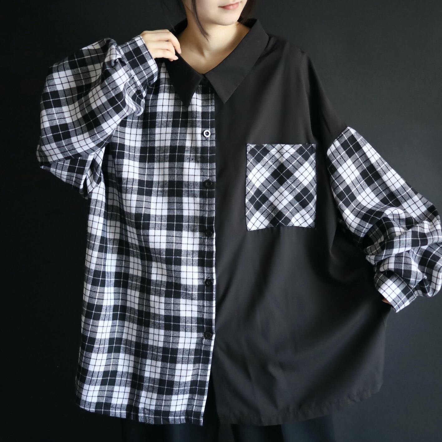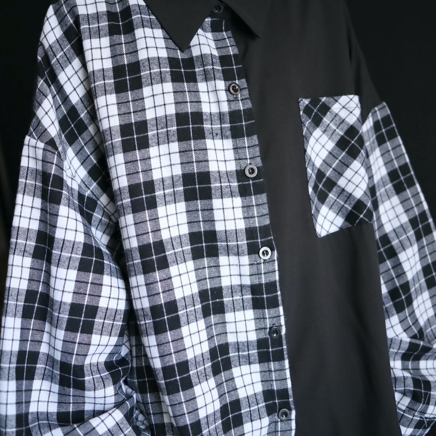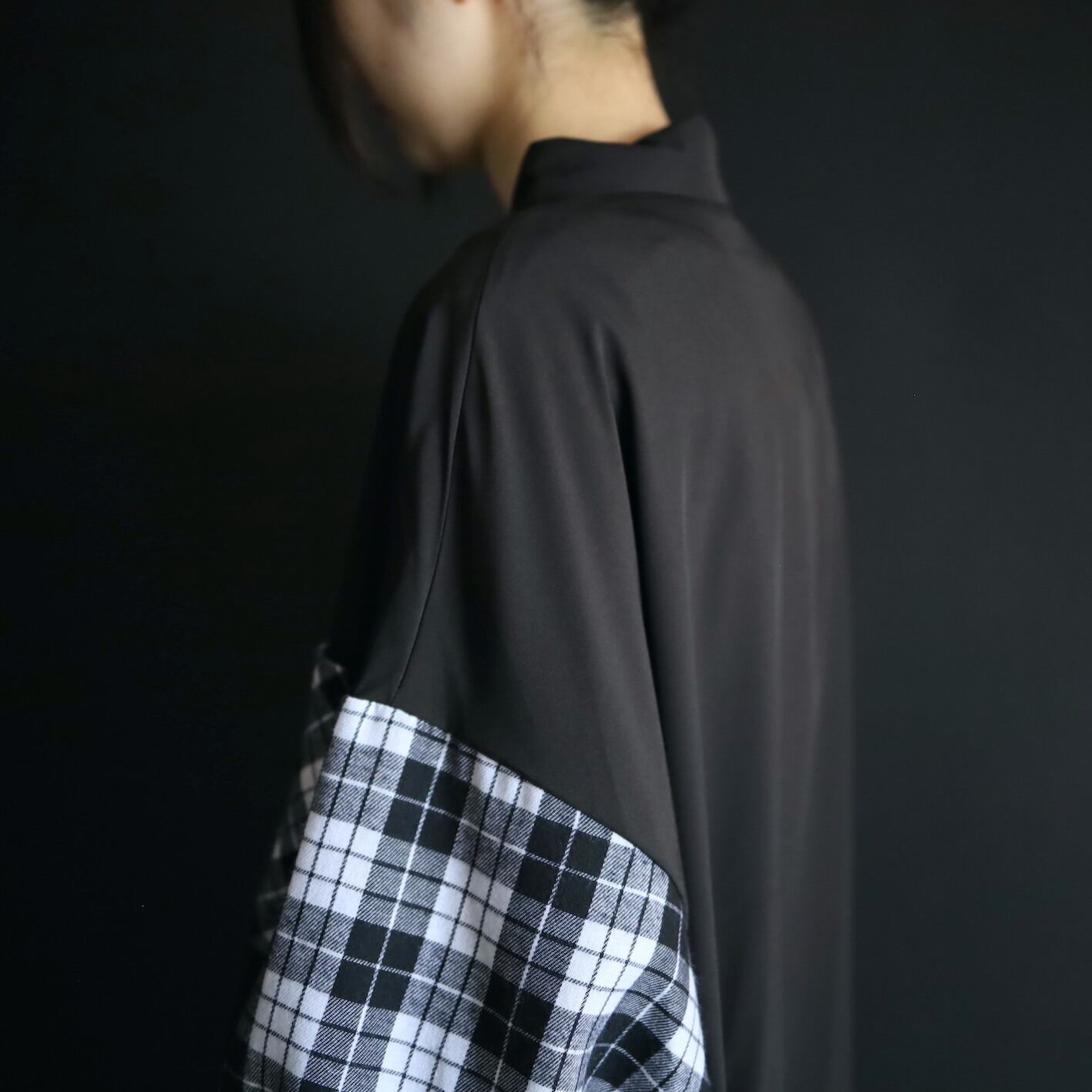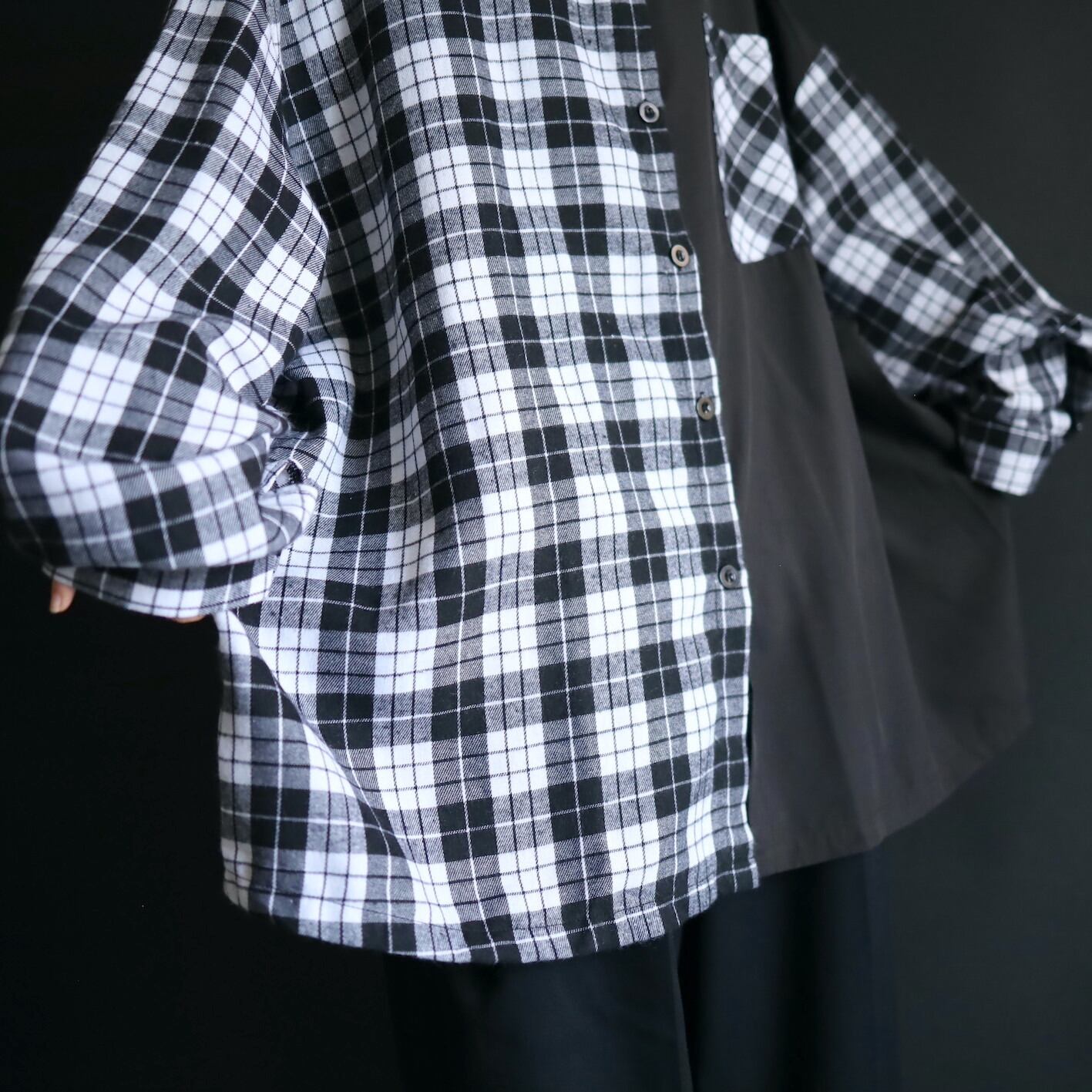 ブラック×ホワイトのモノクロチェックのフランネルと,ハリツヤのあるブラック生地の切替.