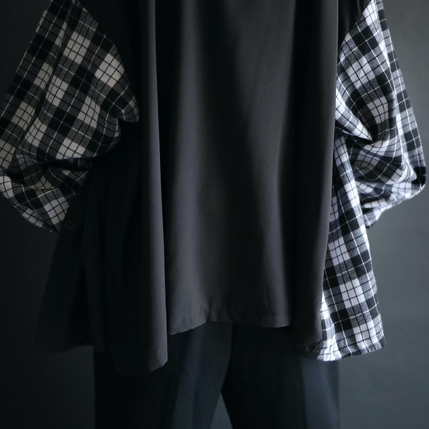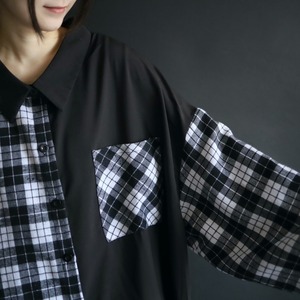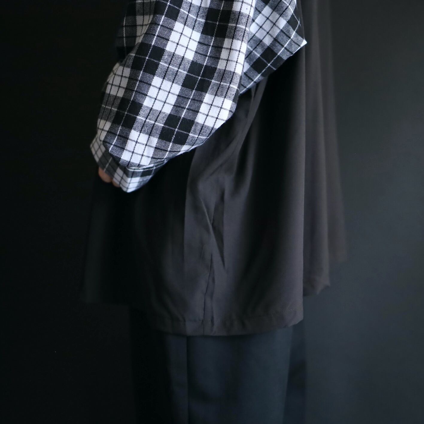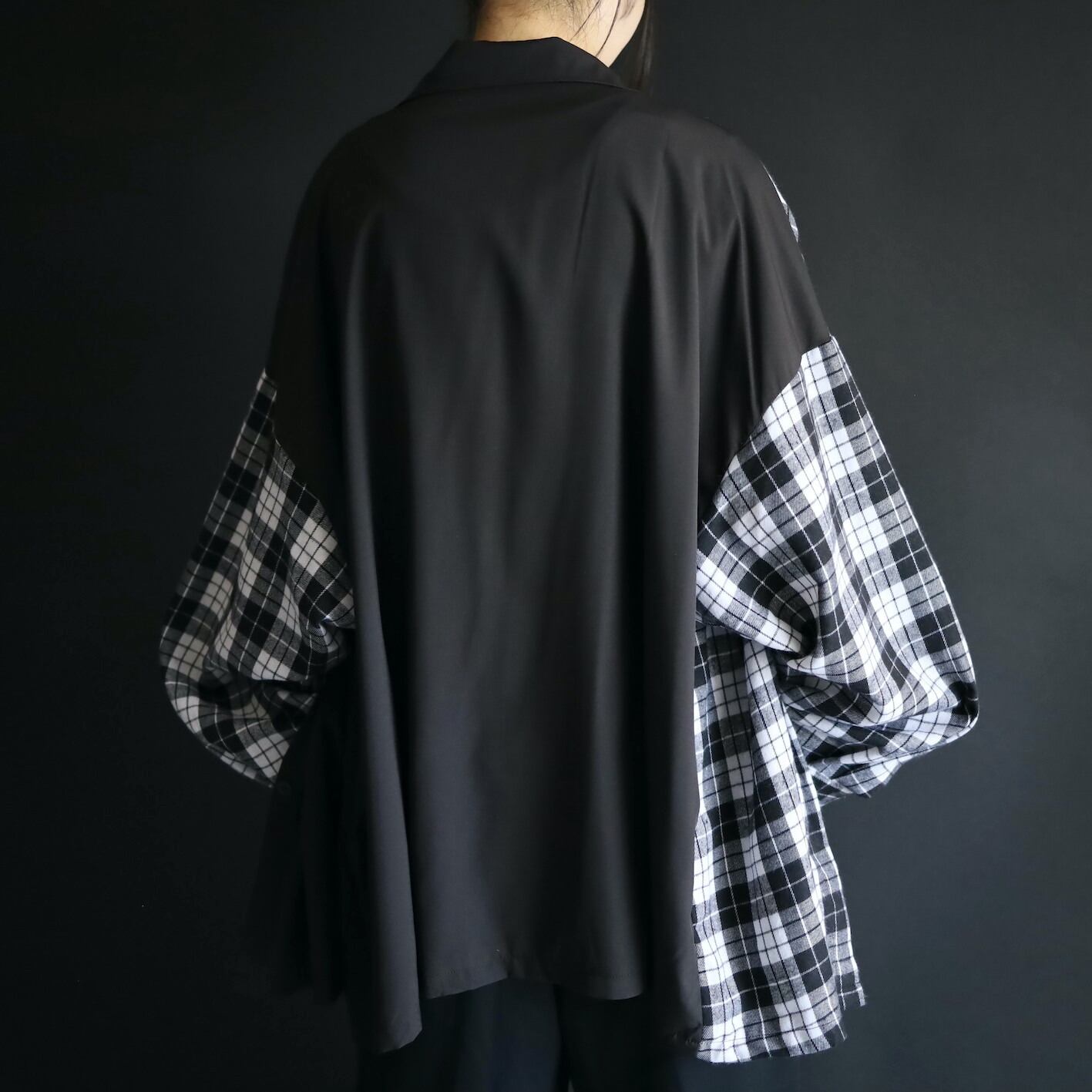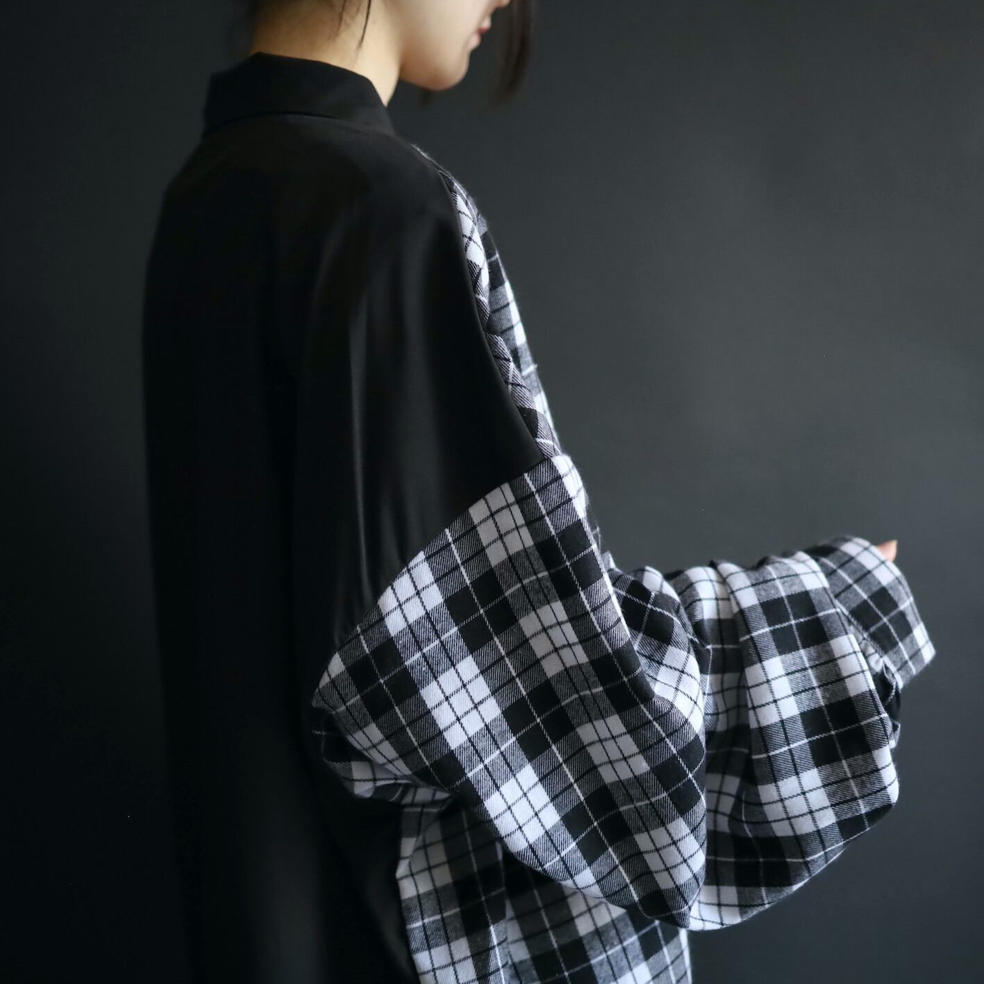 ブラック×ホワイトのモノクロチェックのフランネルと,ハリツヤのあるブラック生地の切替.