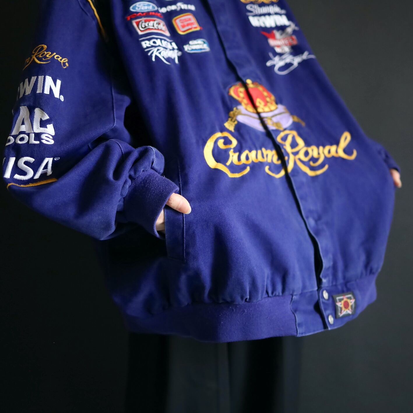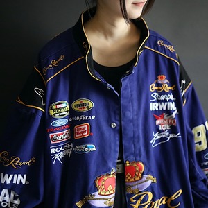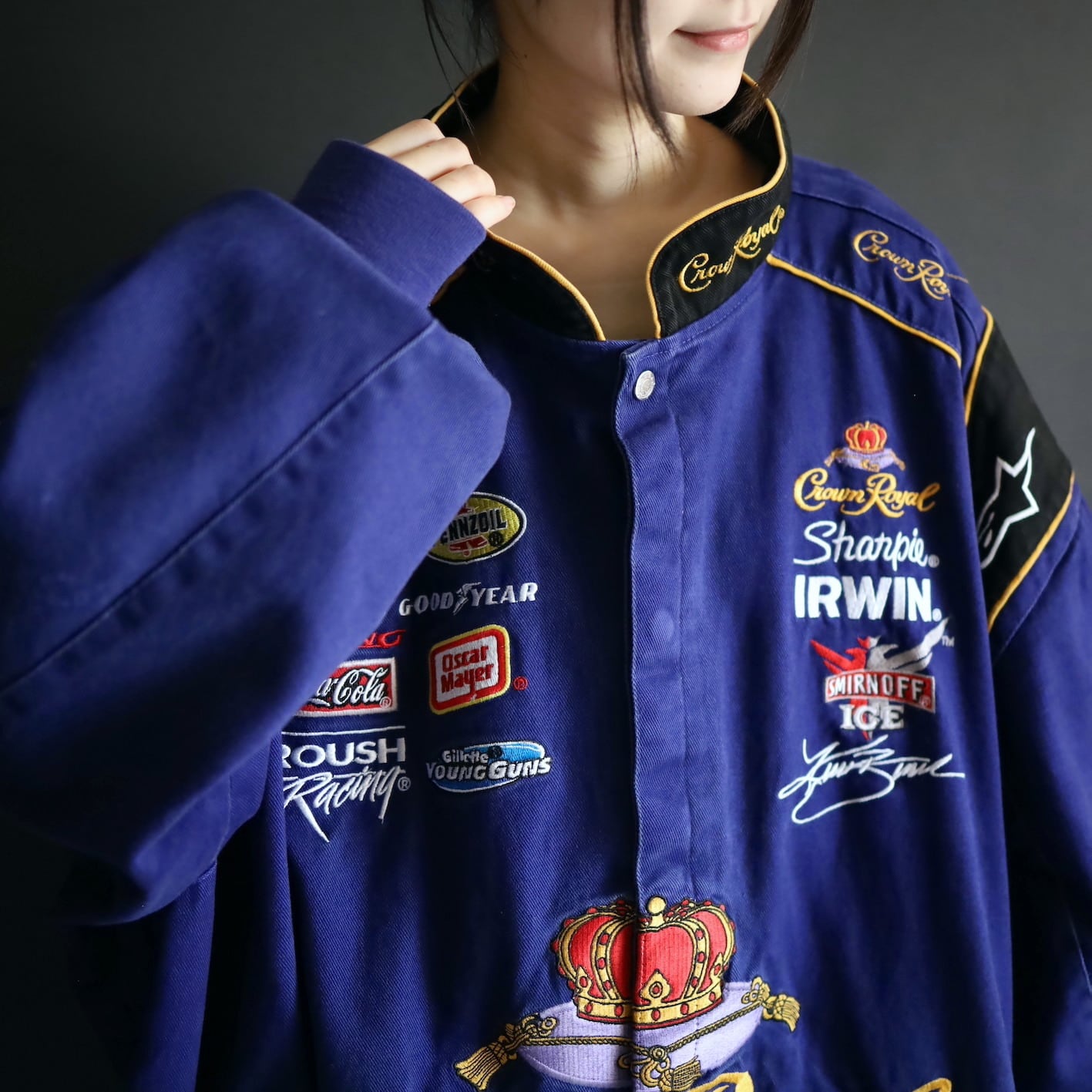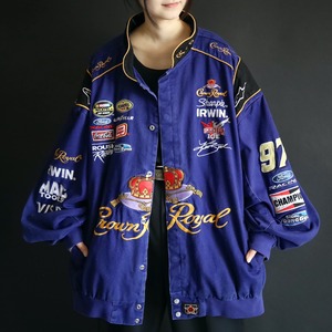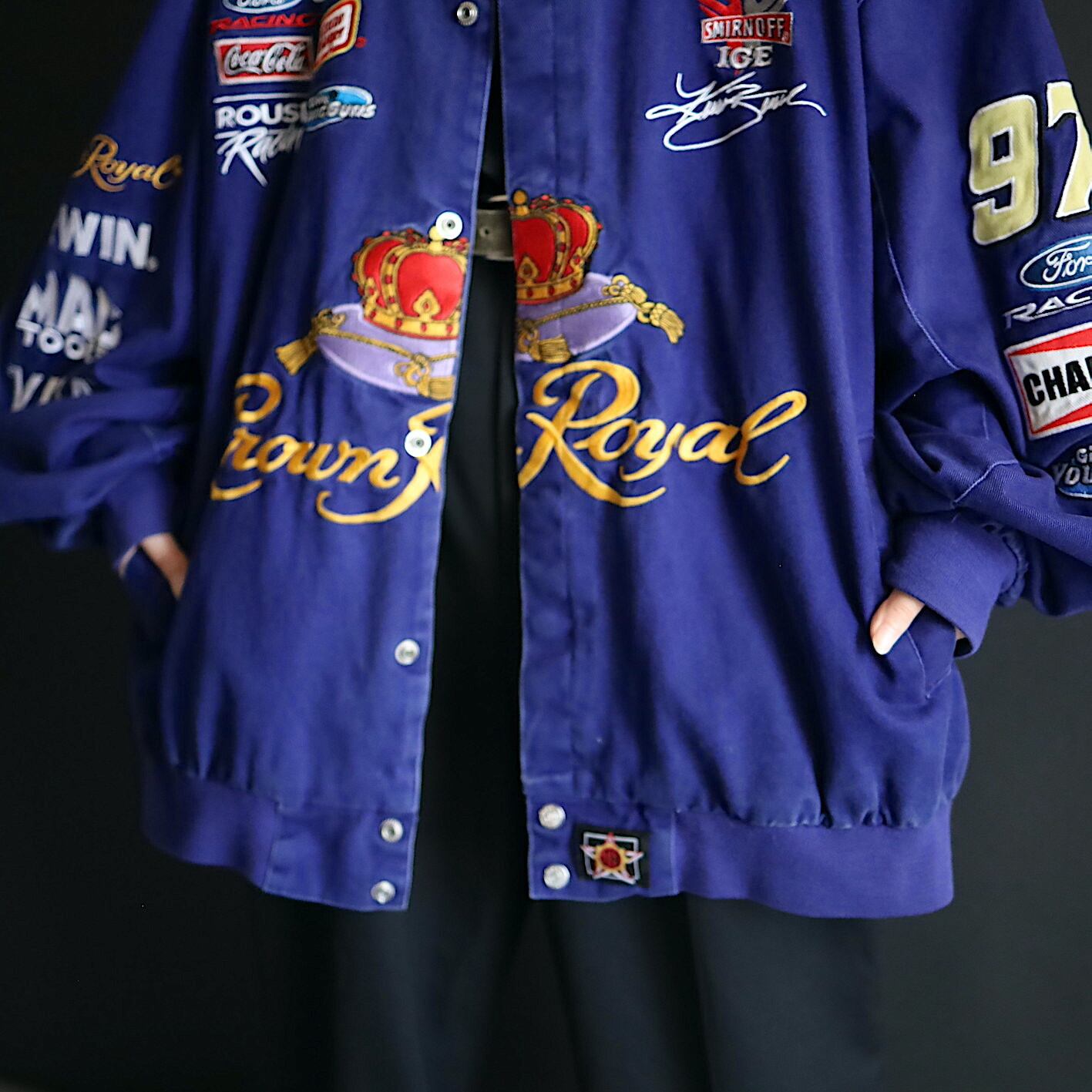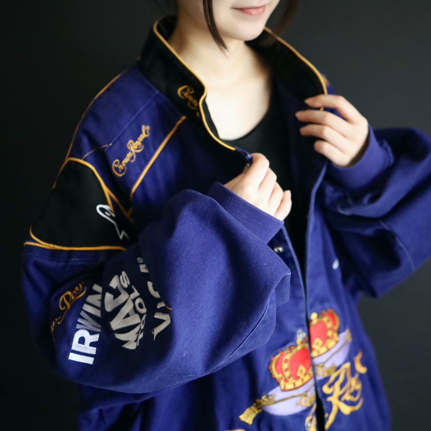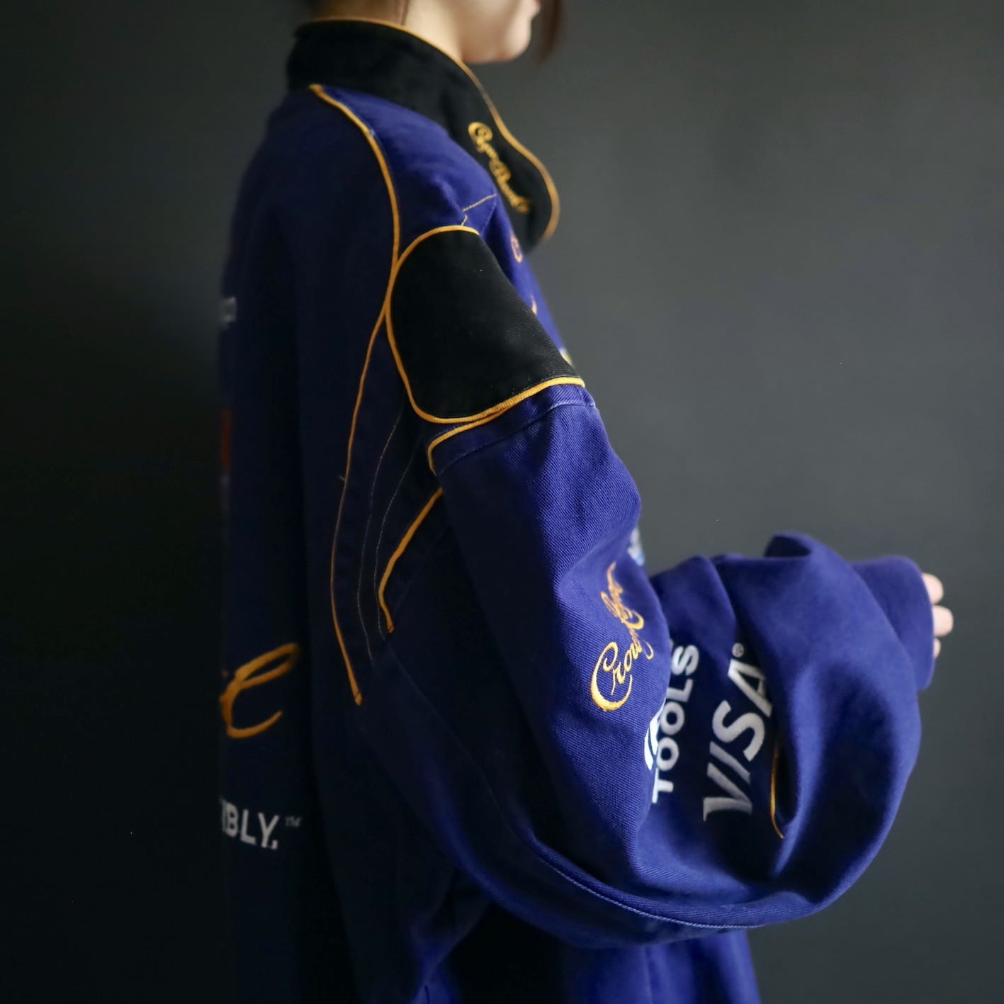 鮮やかなネイビーのコットンボディに加えて,なんといっても特徴的なのは数多くの有名企業の刺繍やワッペン.