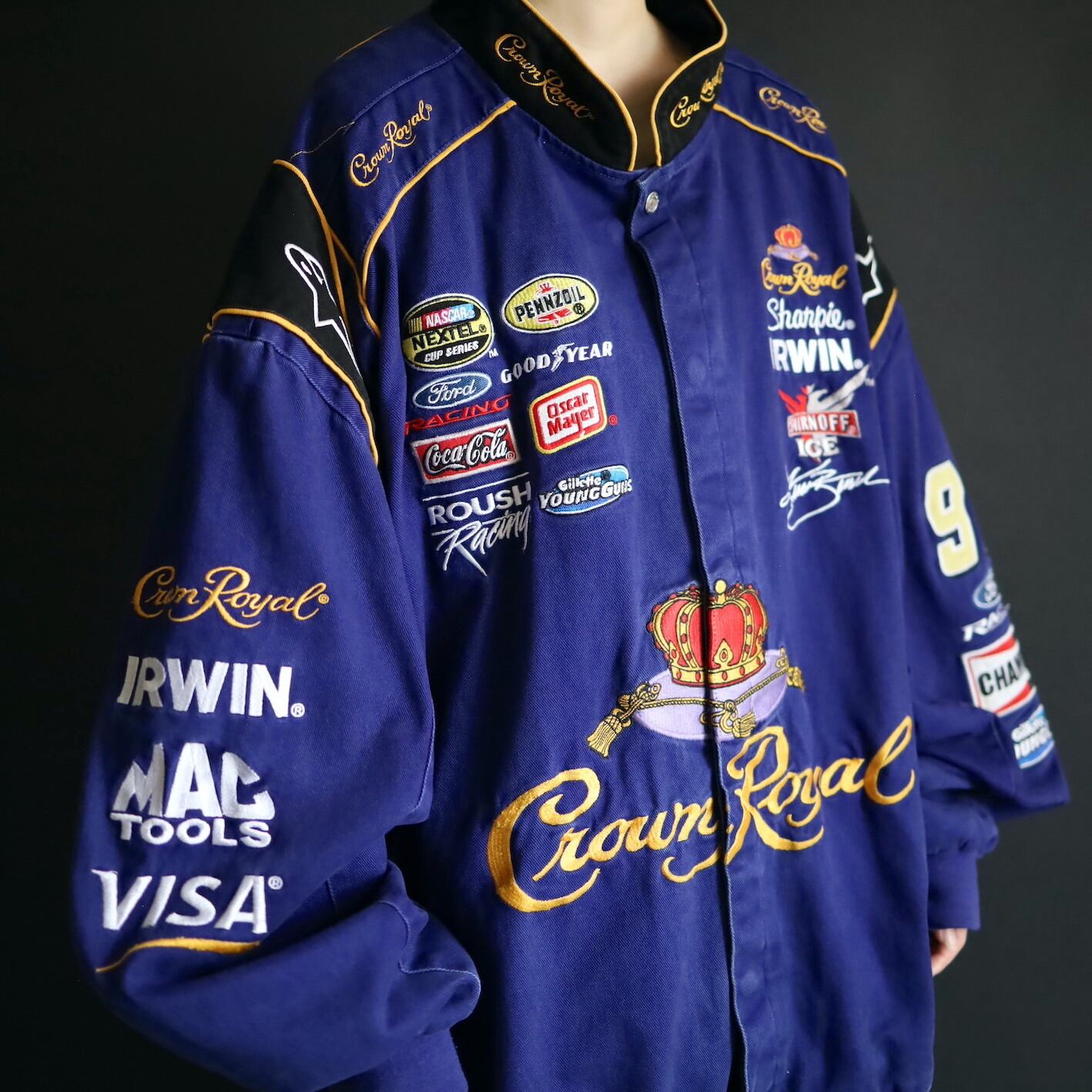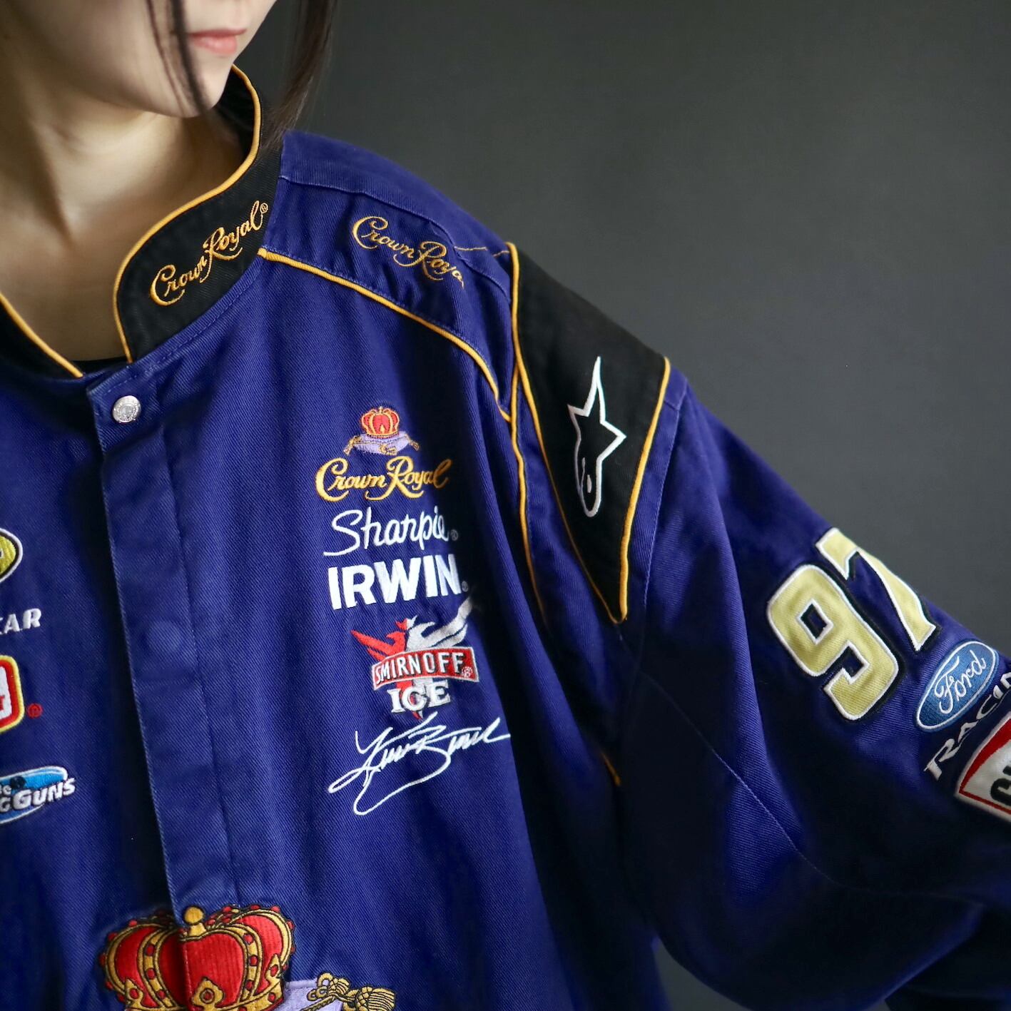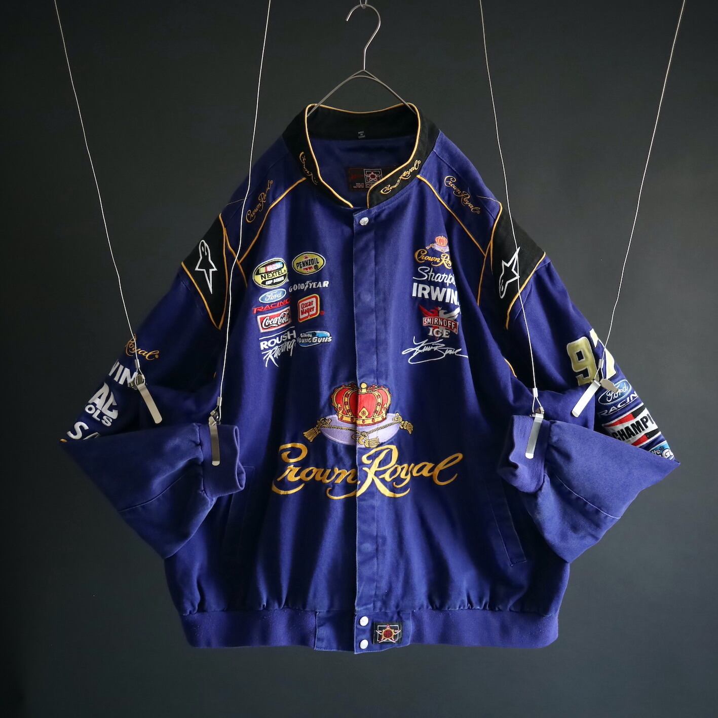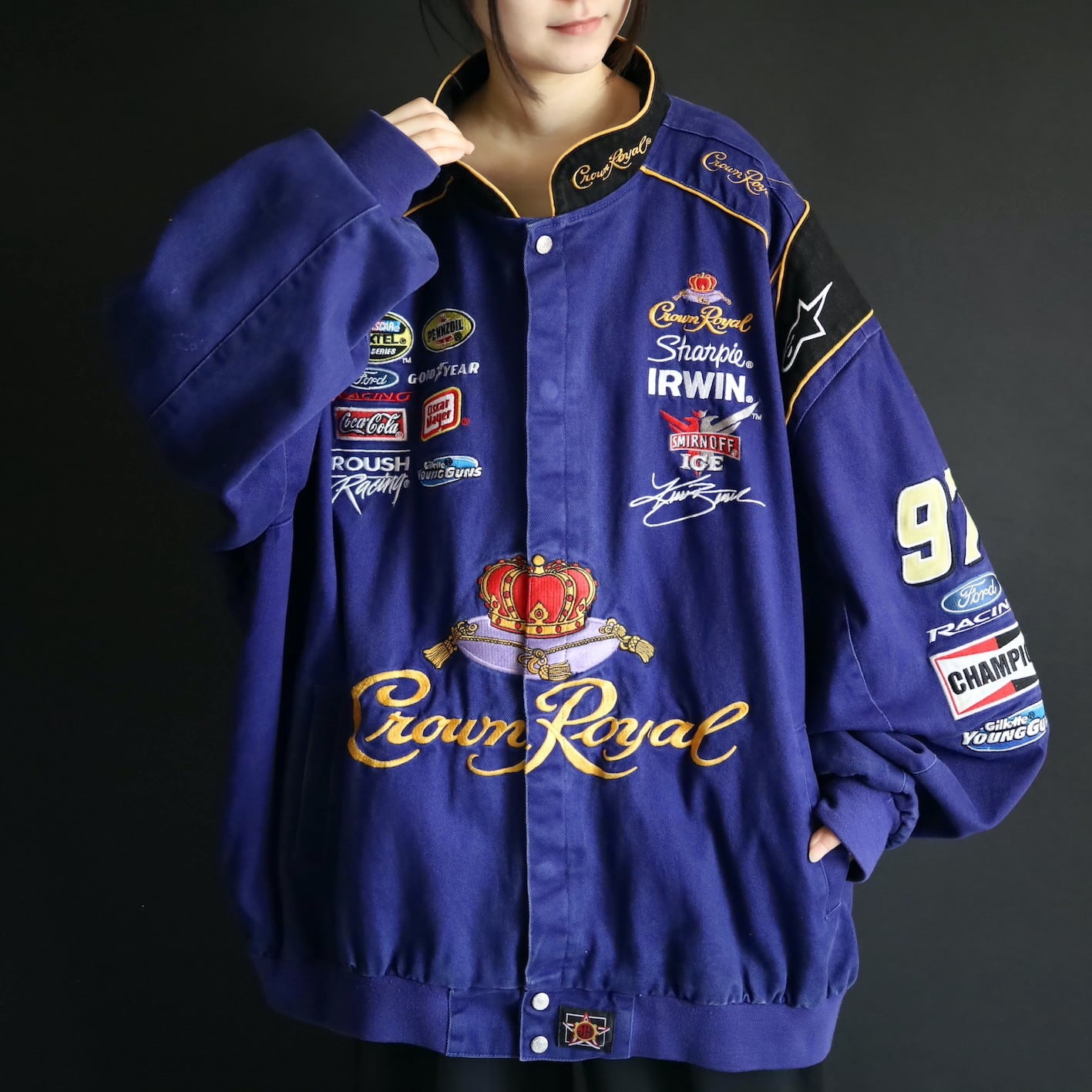 鮮やかなネイビーのコットンボディに加えて,なんといっても特徴的なのは数多くの有名企業の刺繍やワッペン.