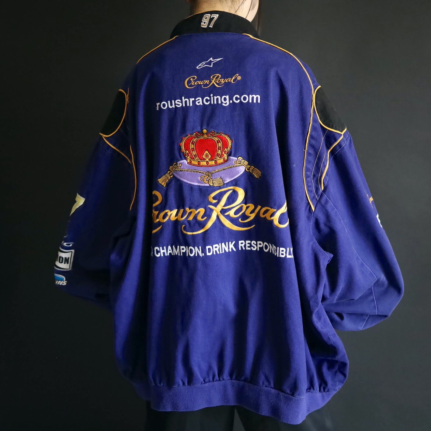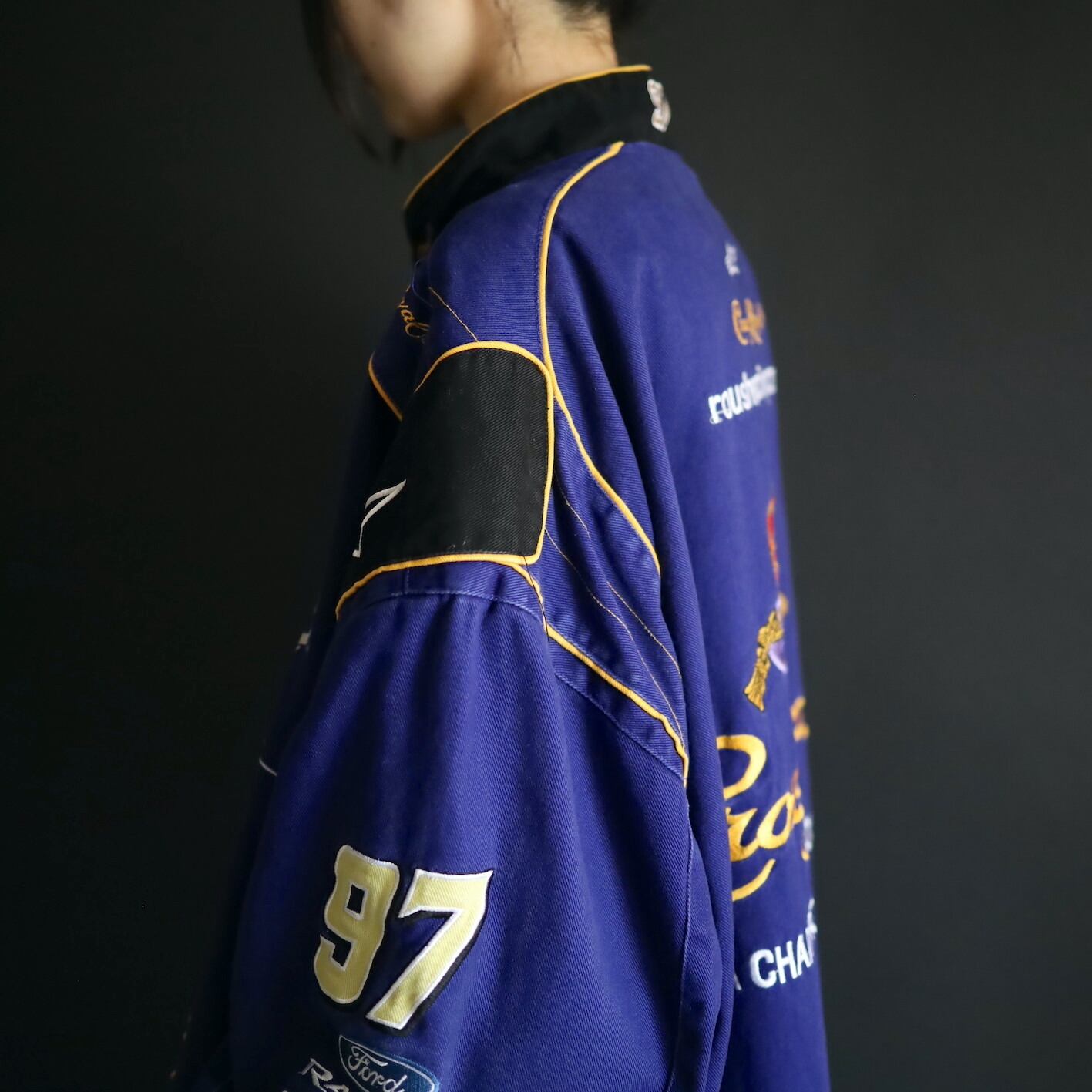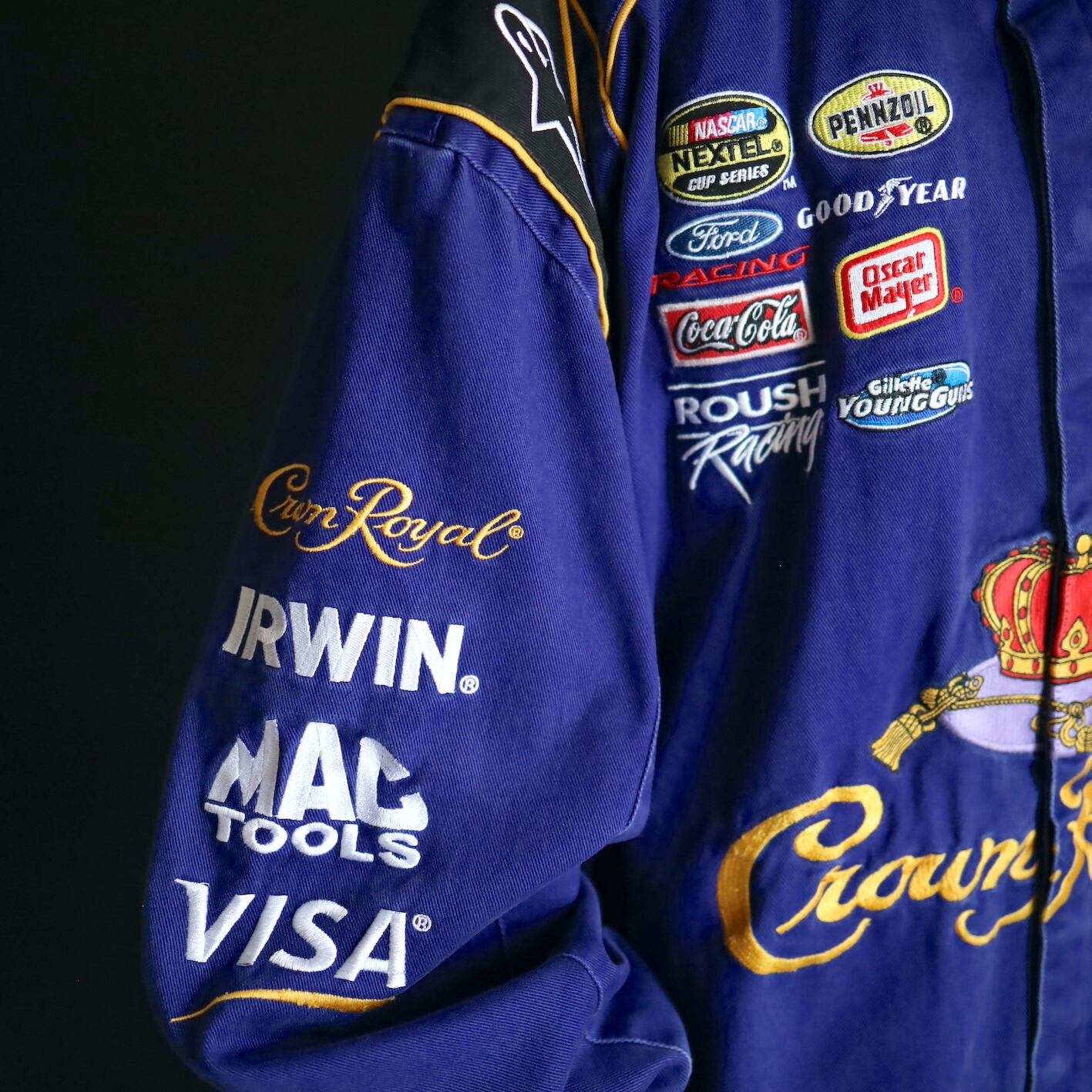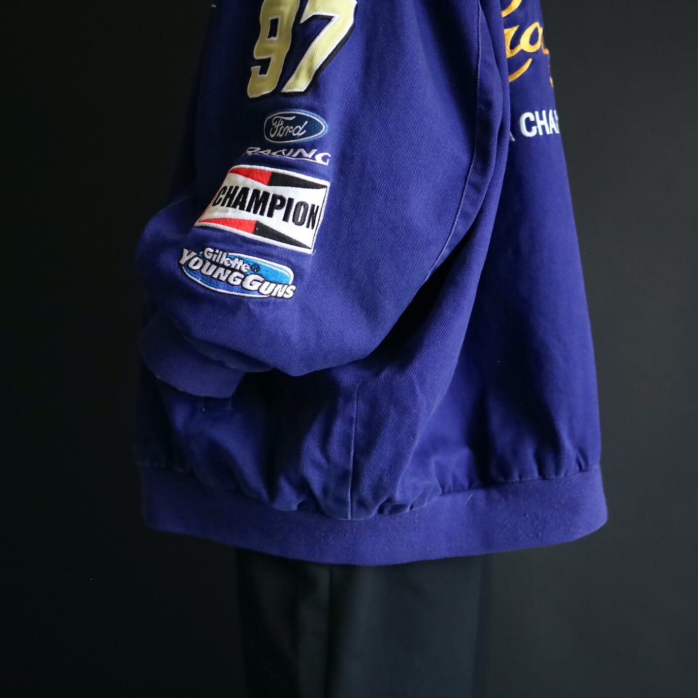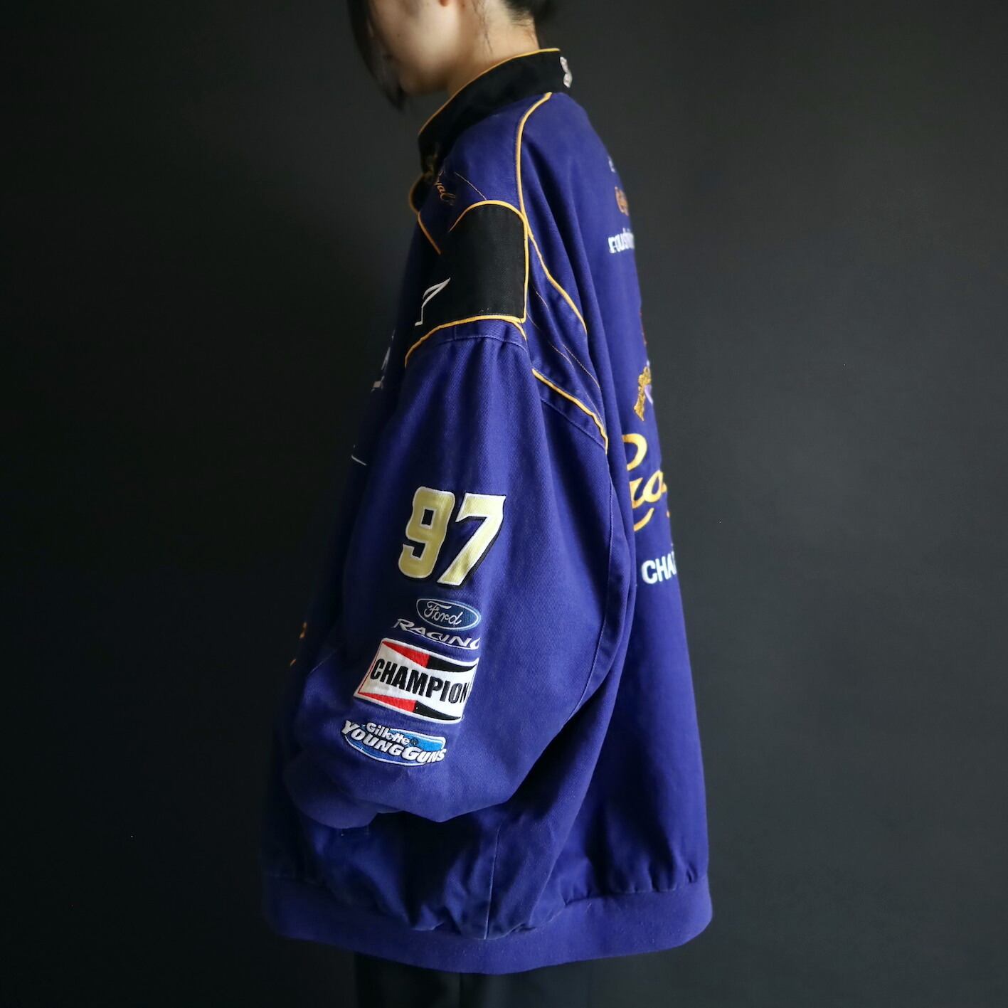 鮮やかなネイビーのコットンボディに加えて,なんといっても特徴的なのは数多くの有名企業の刺繍やワッペン.