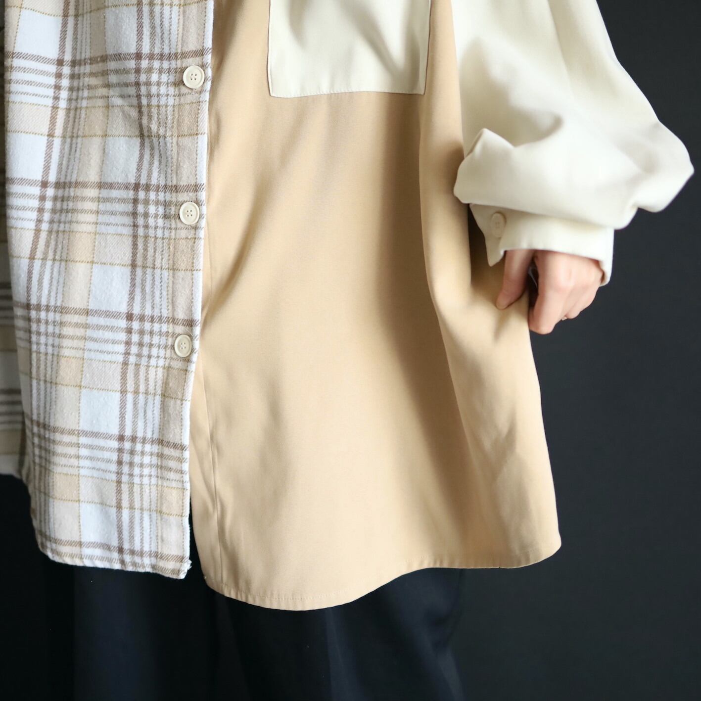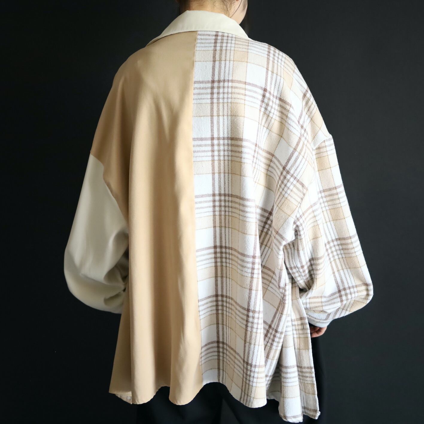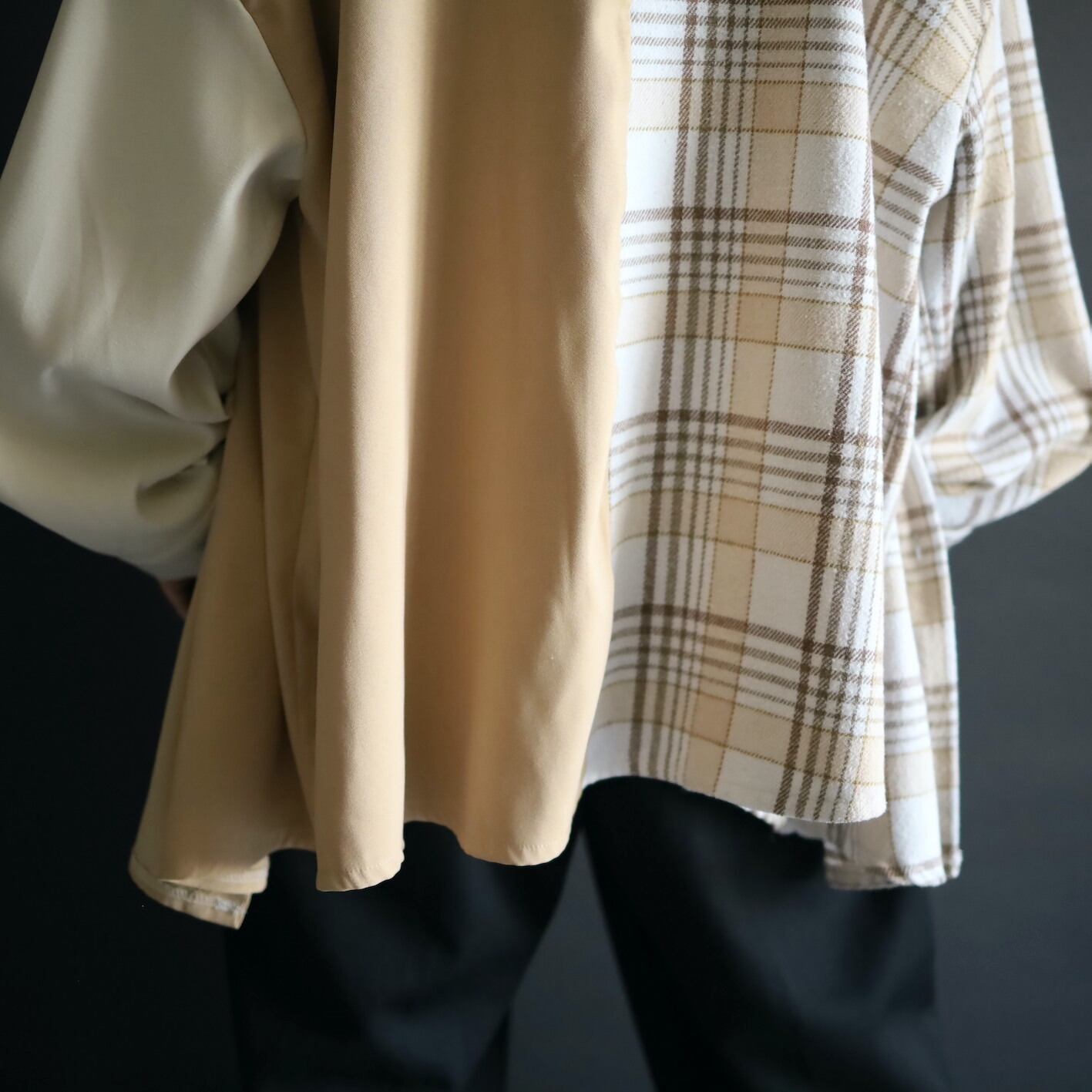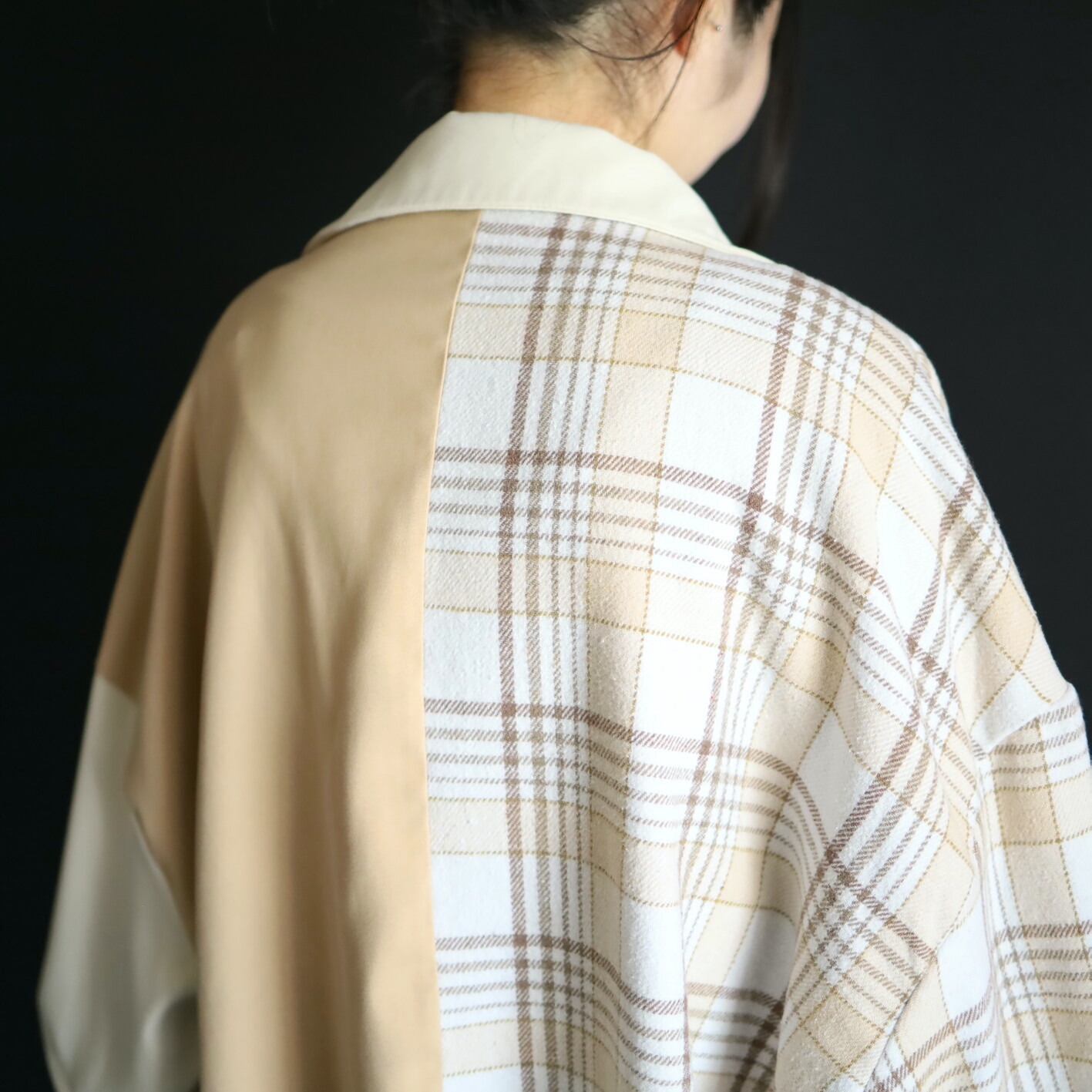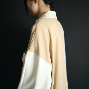 左半身はベージュとオフホワイトのハリツヤのある品のいいポリ生地.