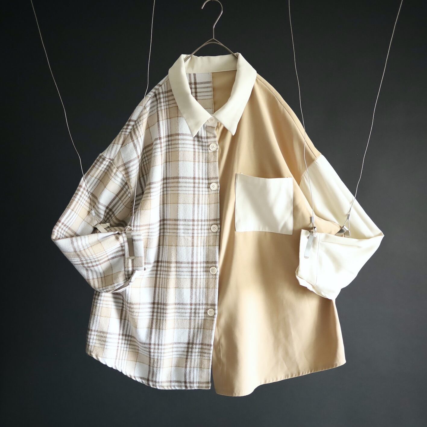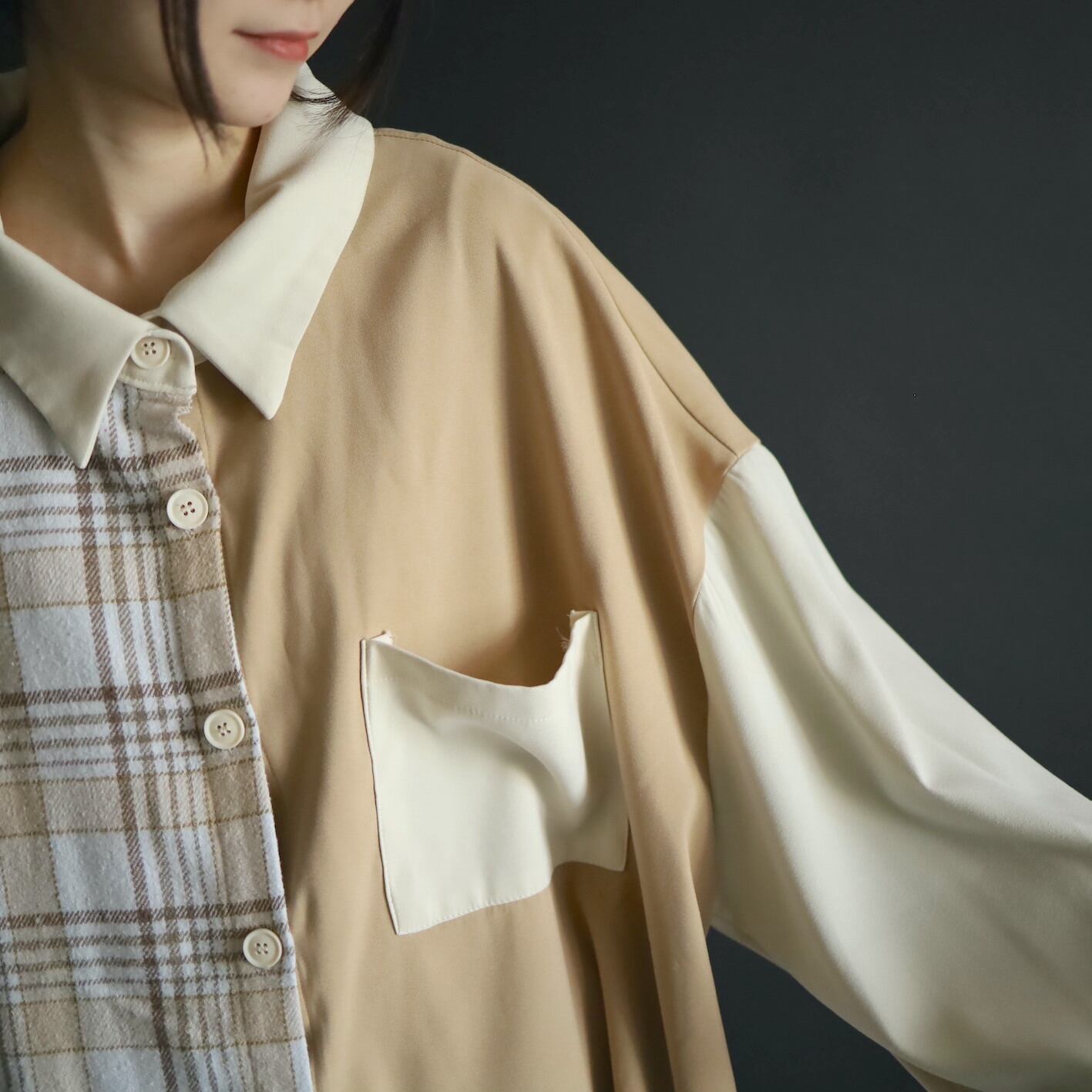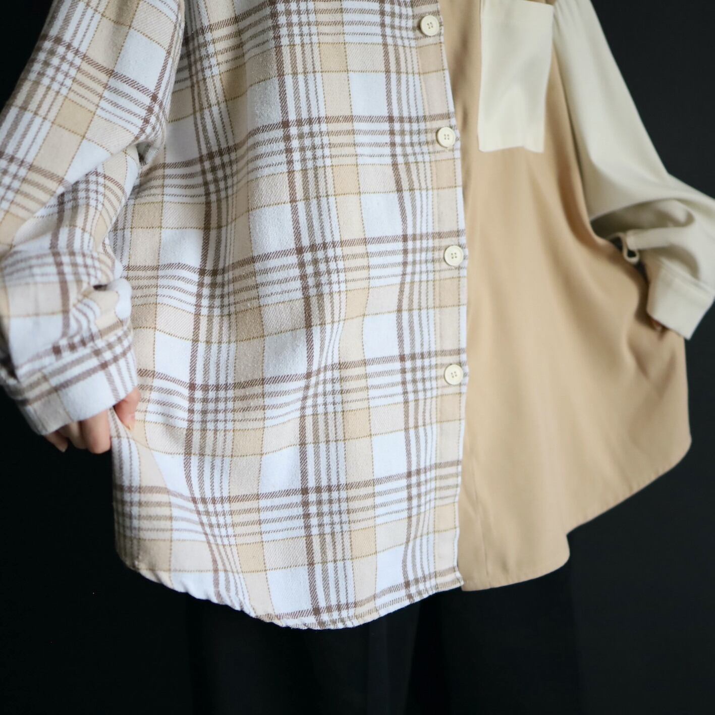 左半身はベージュとオフホワイトのハリツヤのある品のいいポリ生地.