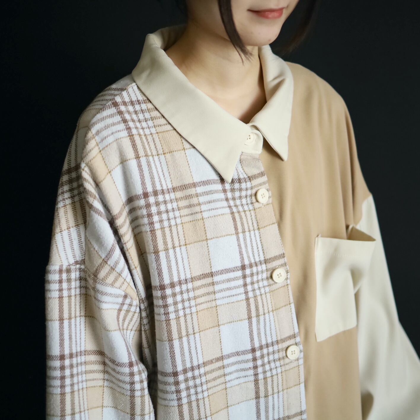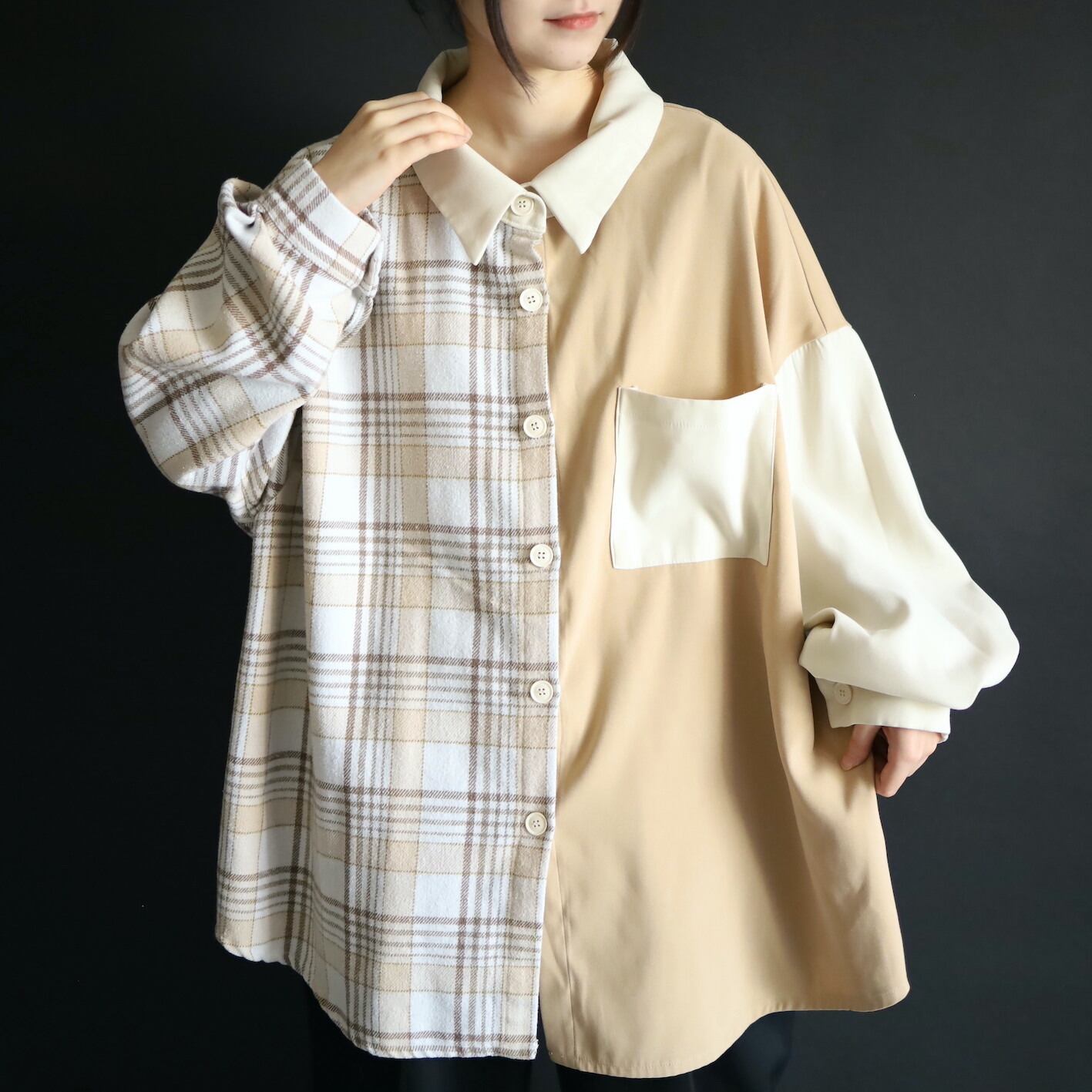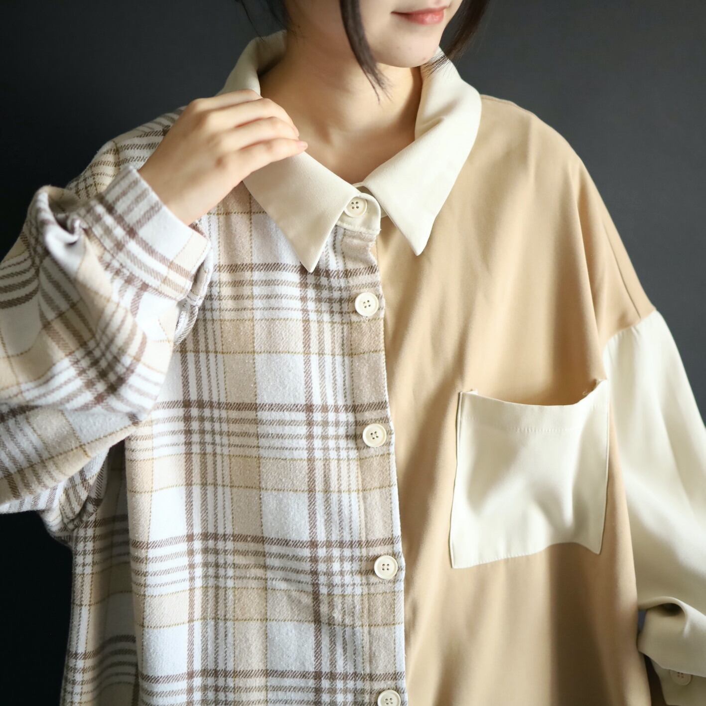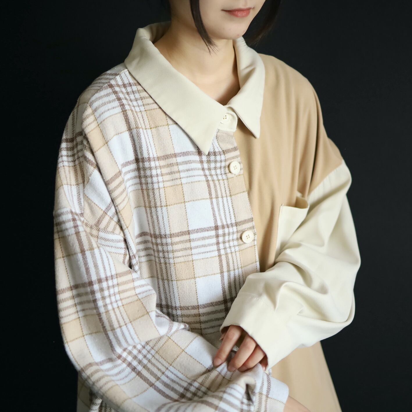 左半身はベージュとオフホワイトのハリツヤのある品のいいポリ生地.
