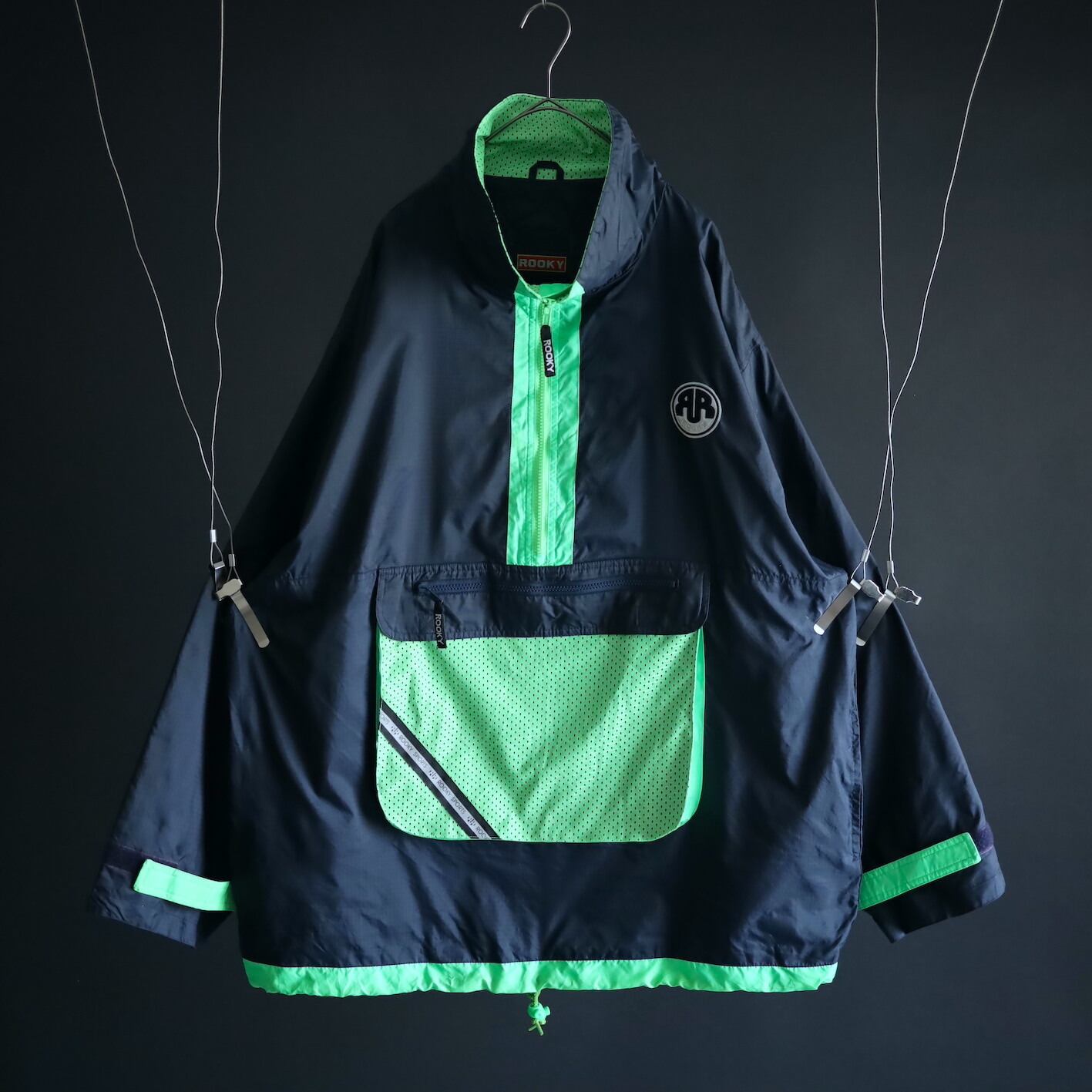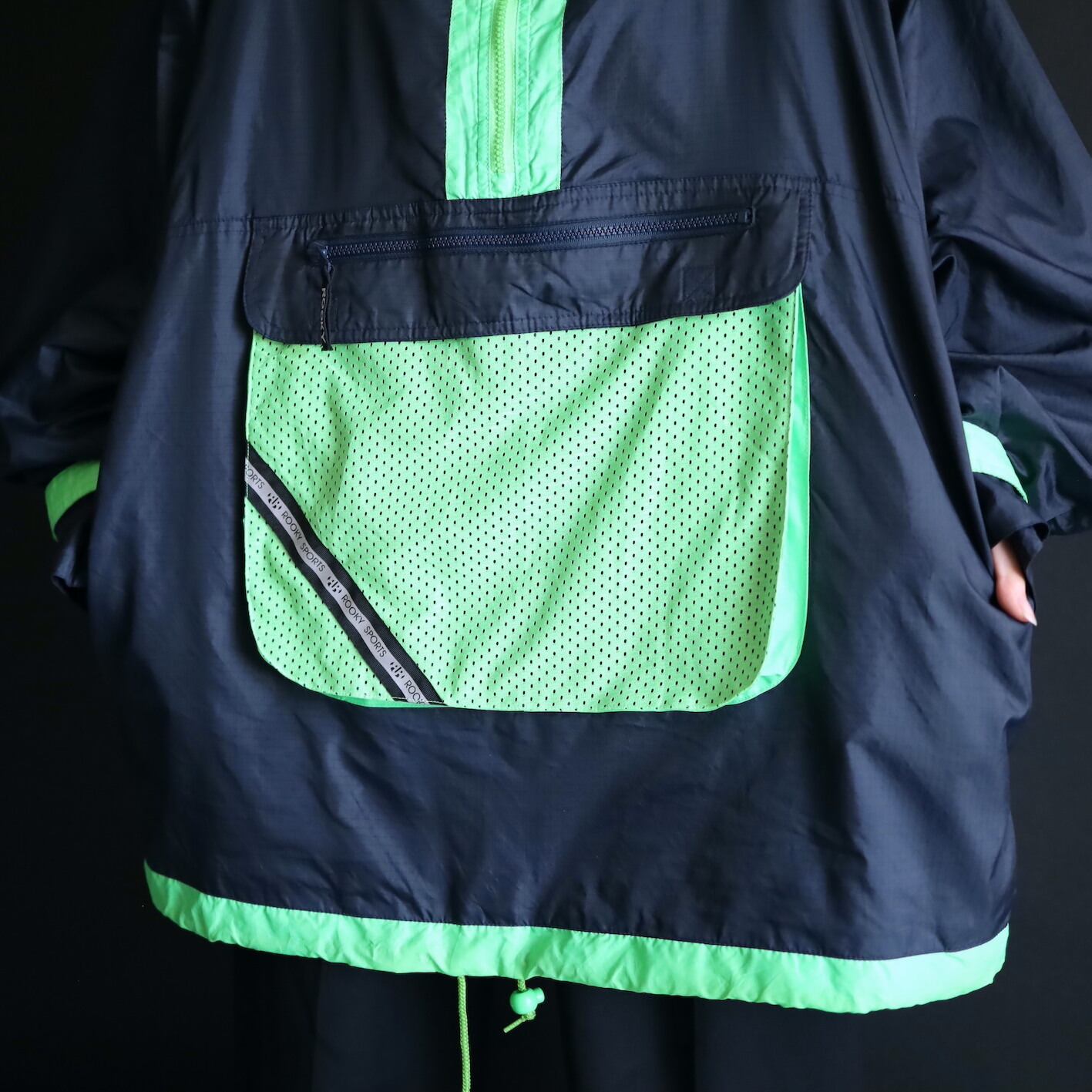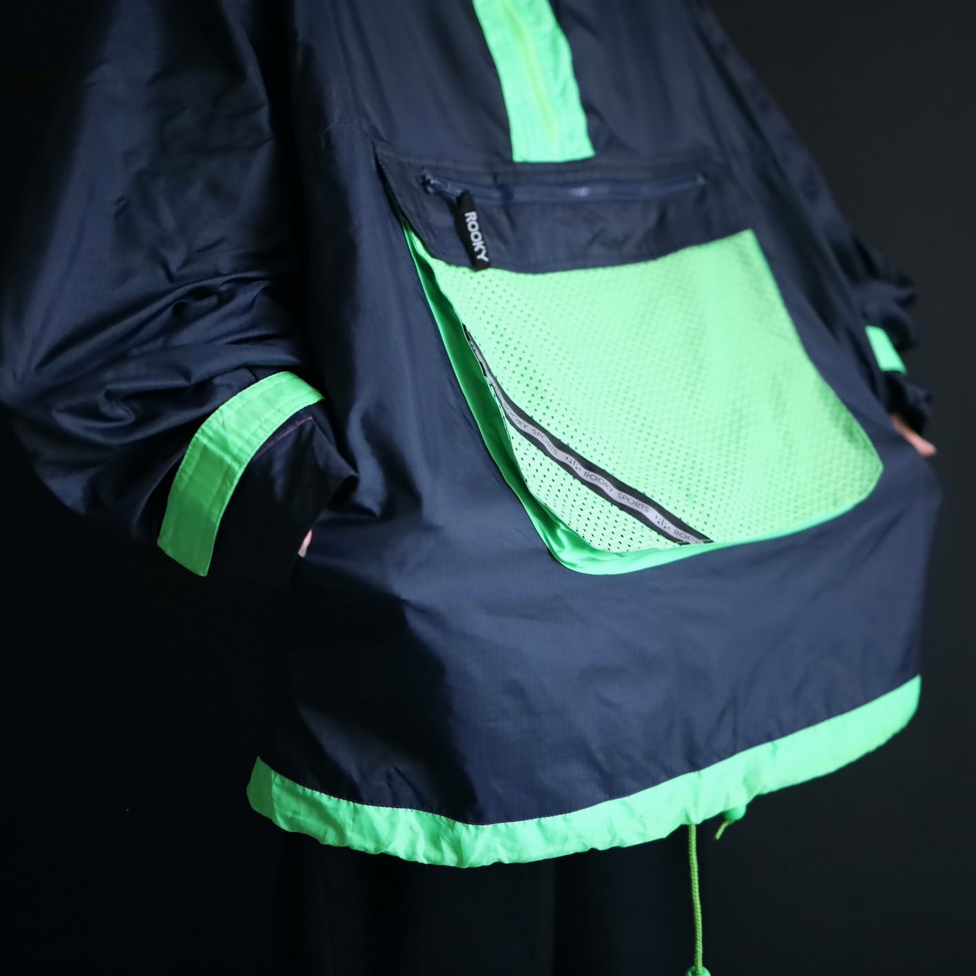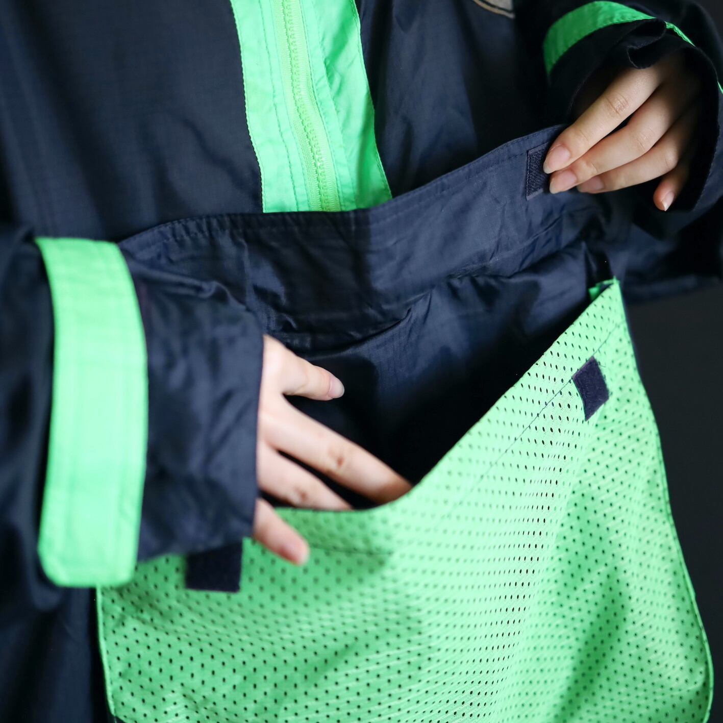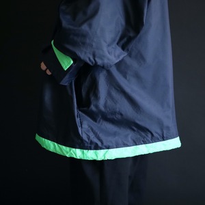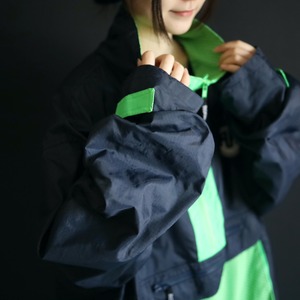 ネイビーのボディをベースに,ジップライン,袖際マジックテープ,マフポケットなどが蛍光グリーンに切り替わった一枚.
