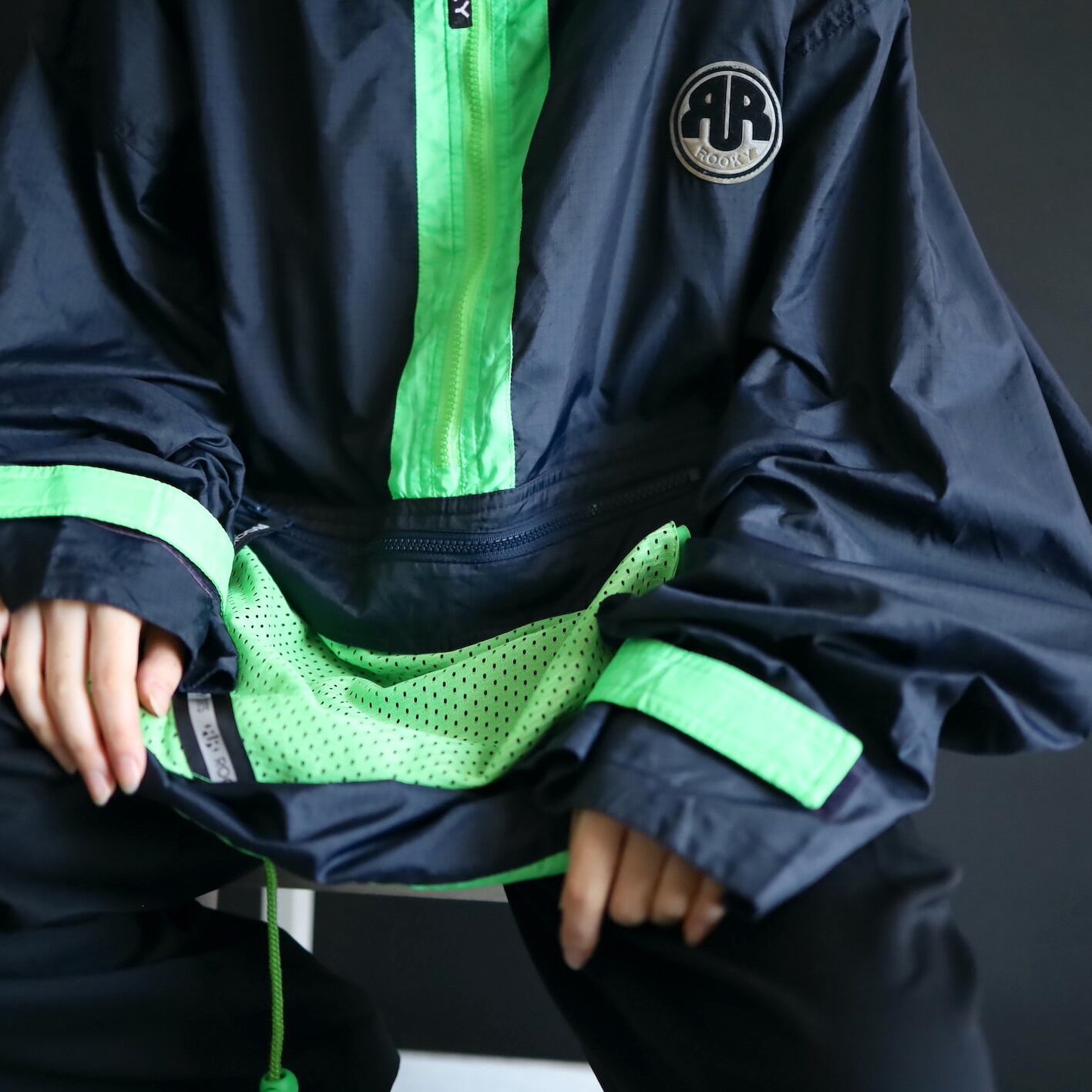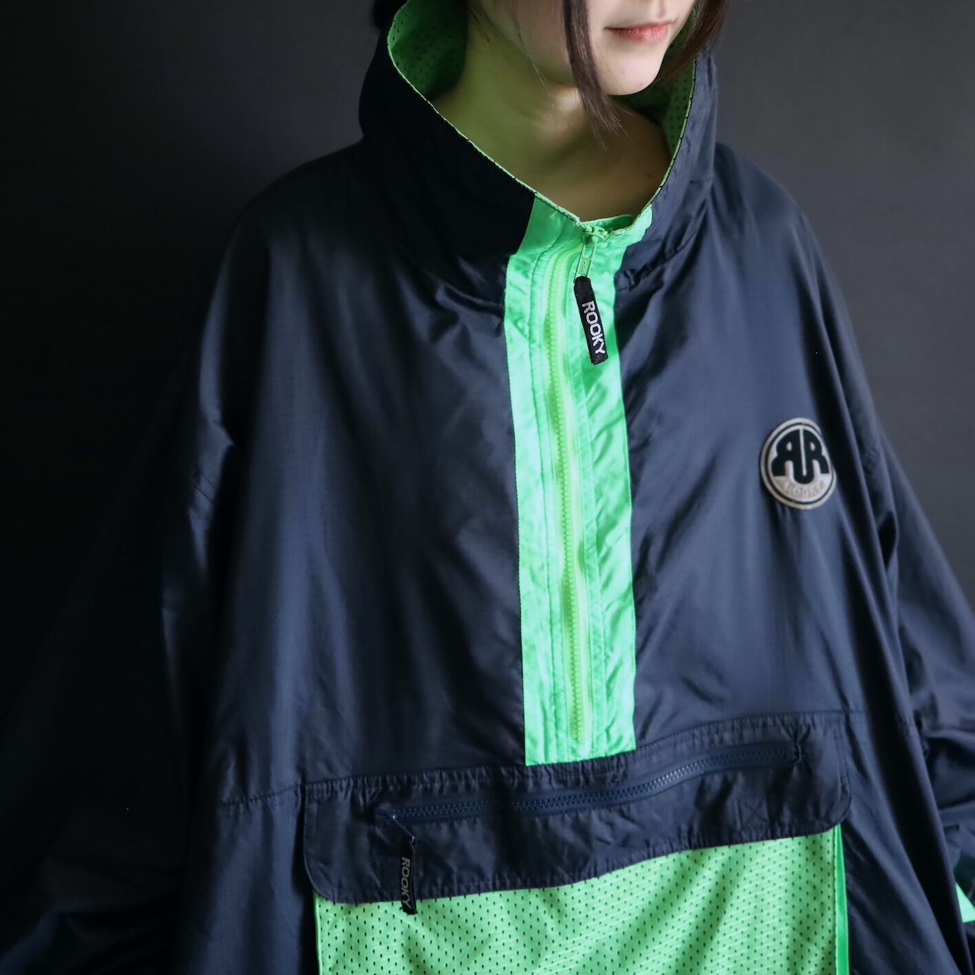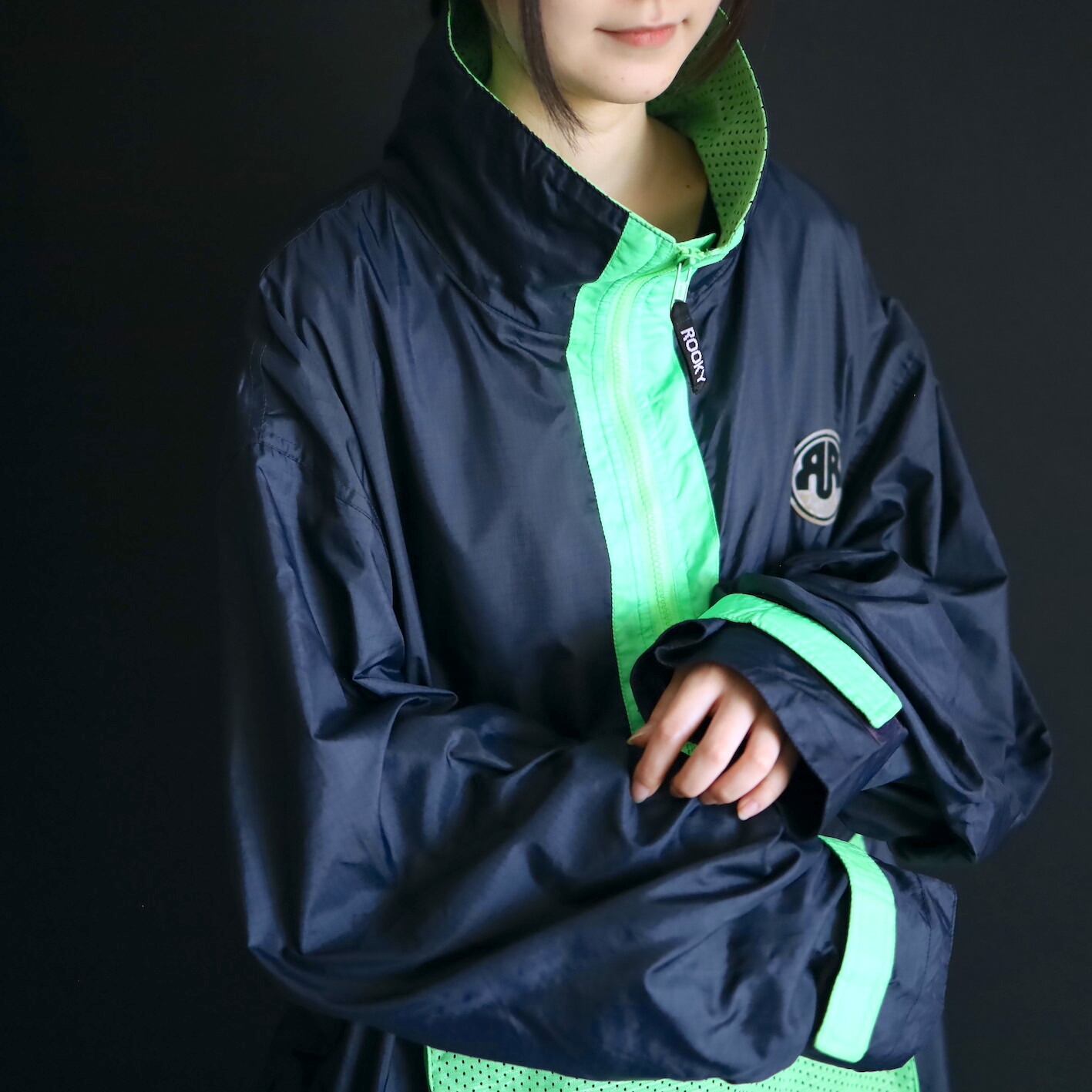 ネイビーのボディをベースに,ジップライン,袖際マジックテープ,マフポケットなどが蛍光グリーンに切り替わった一枚.
