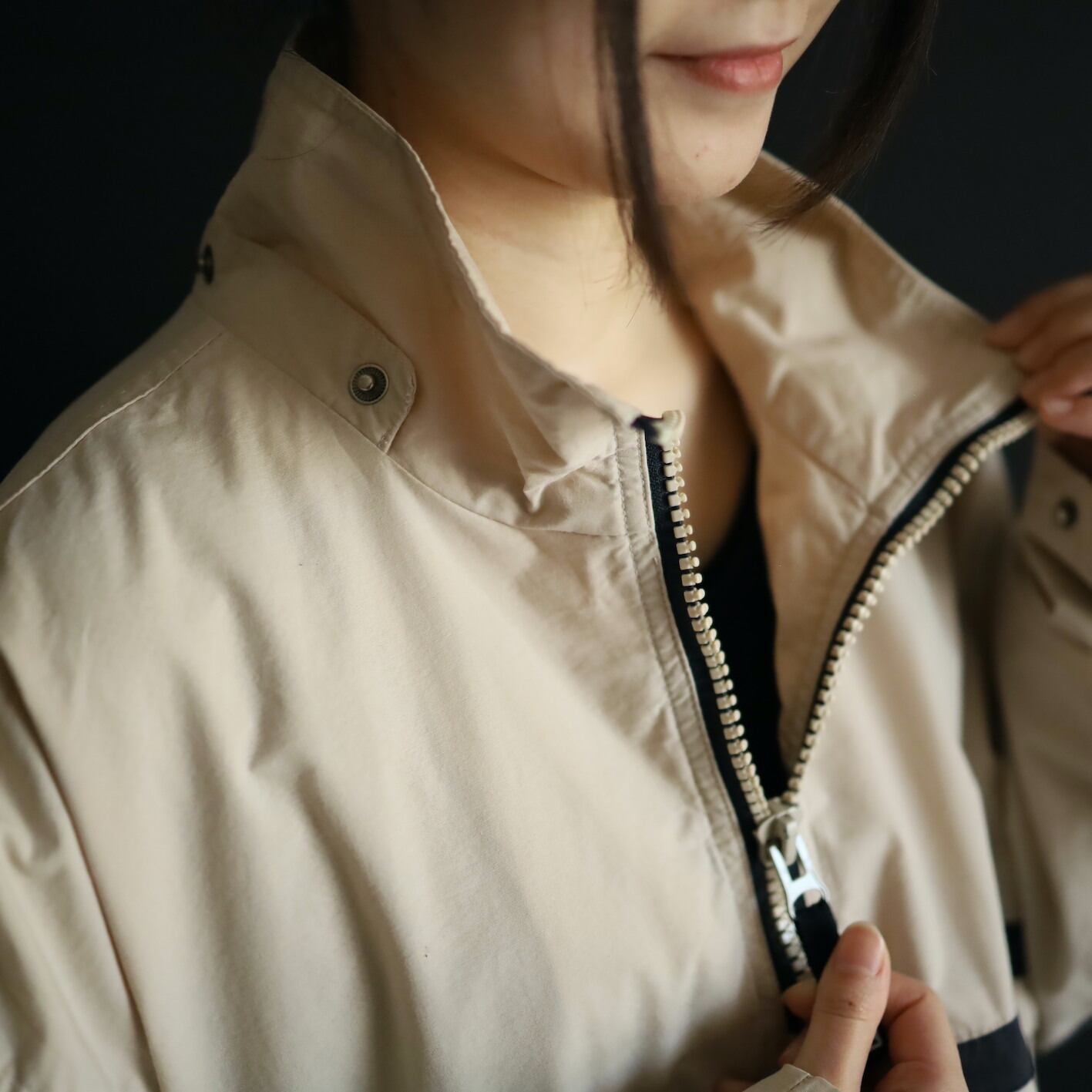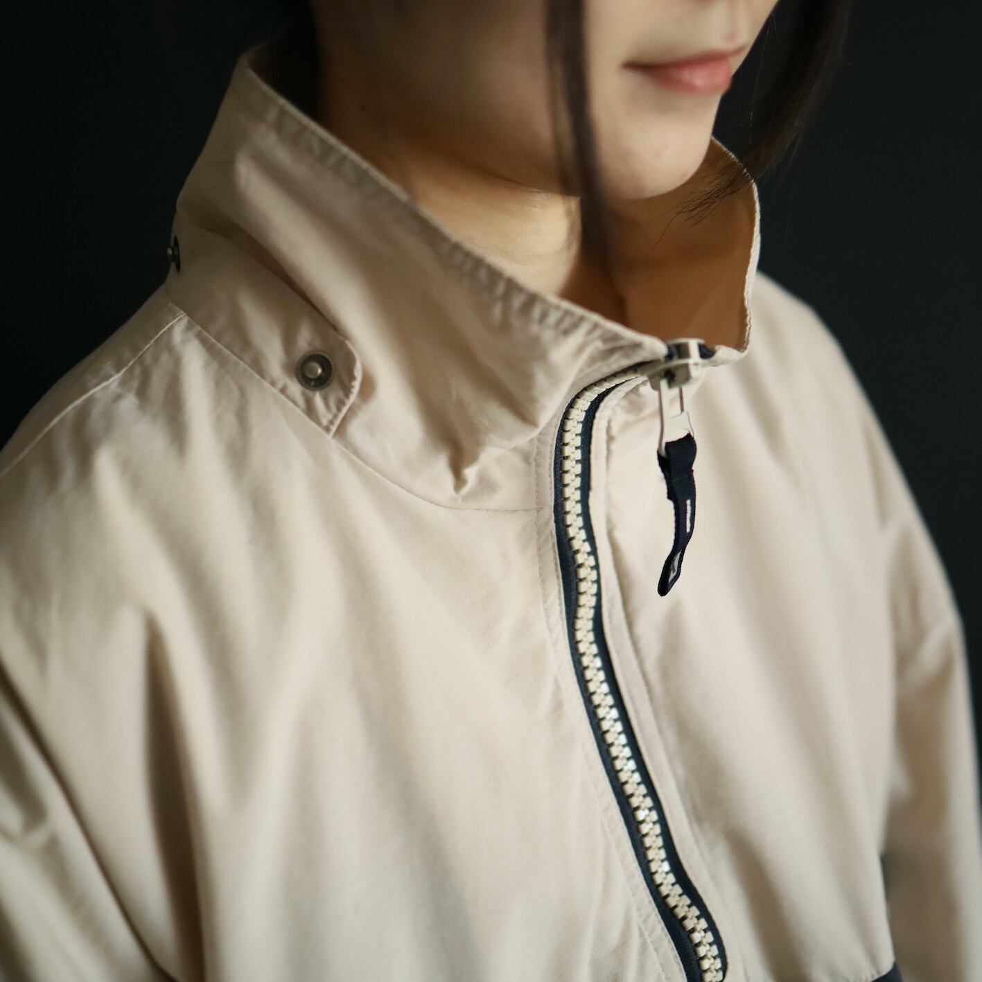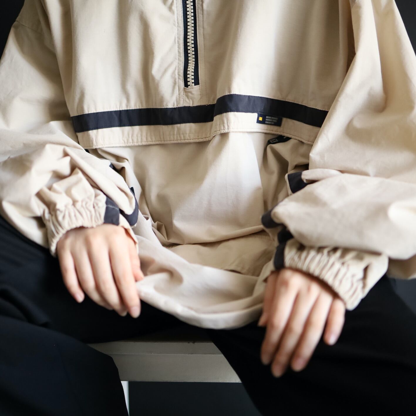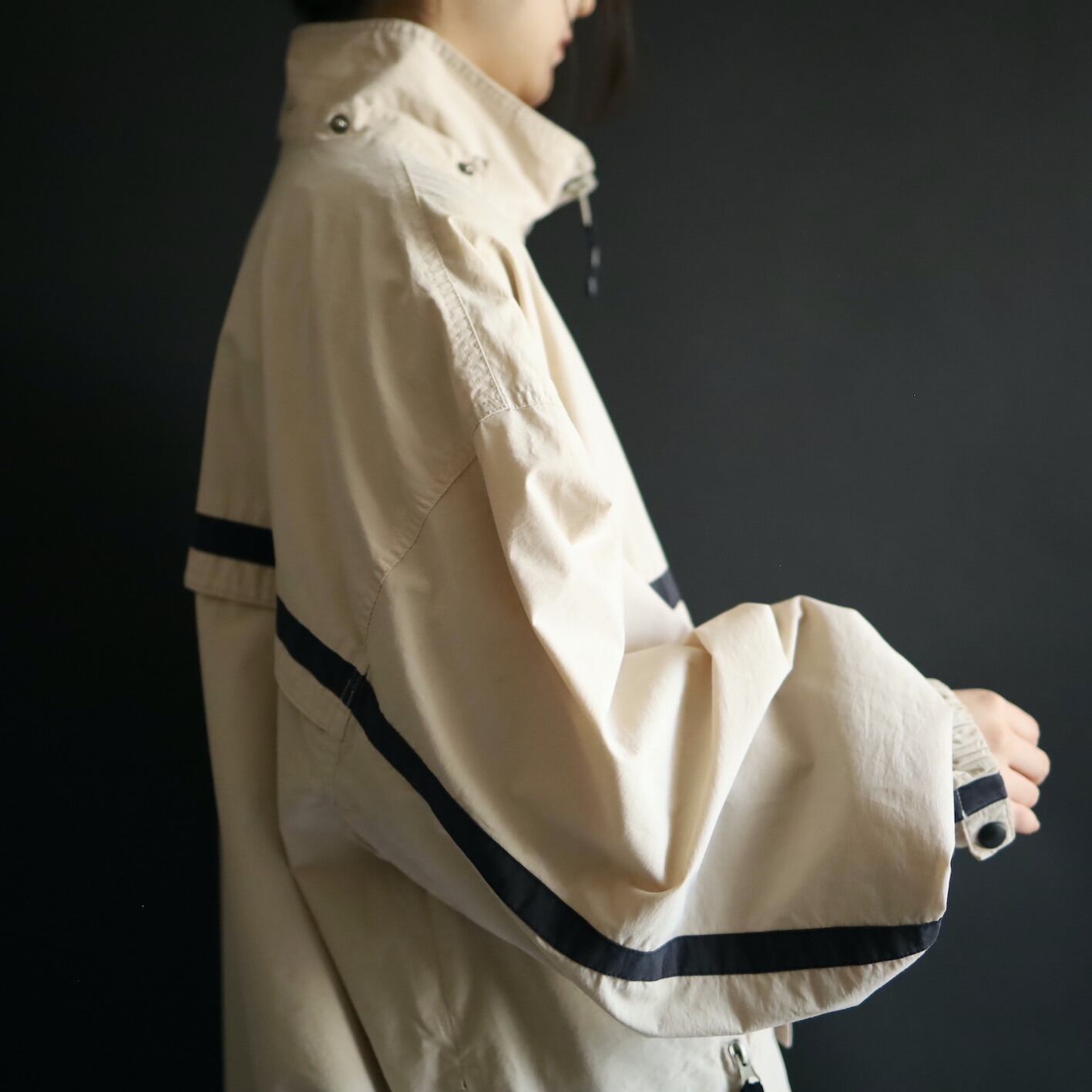 温かみのあるアイボリーカラーをベースに,袖と胸元を横切るチャコールグレーのライン.