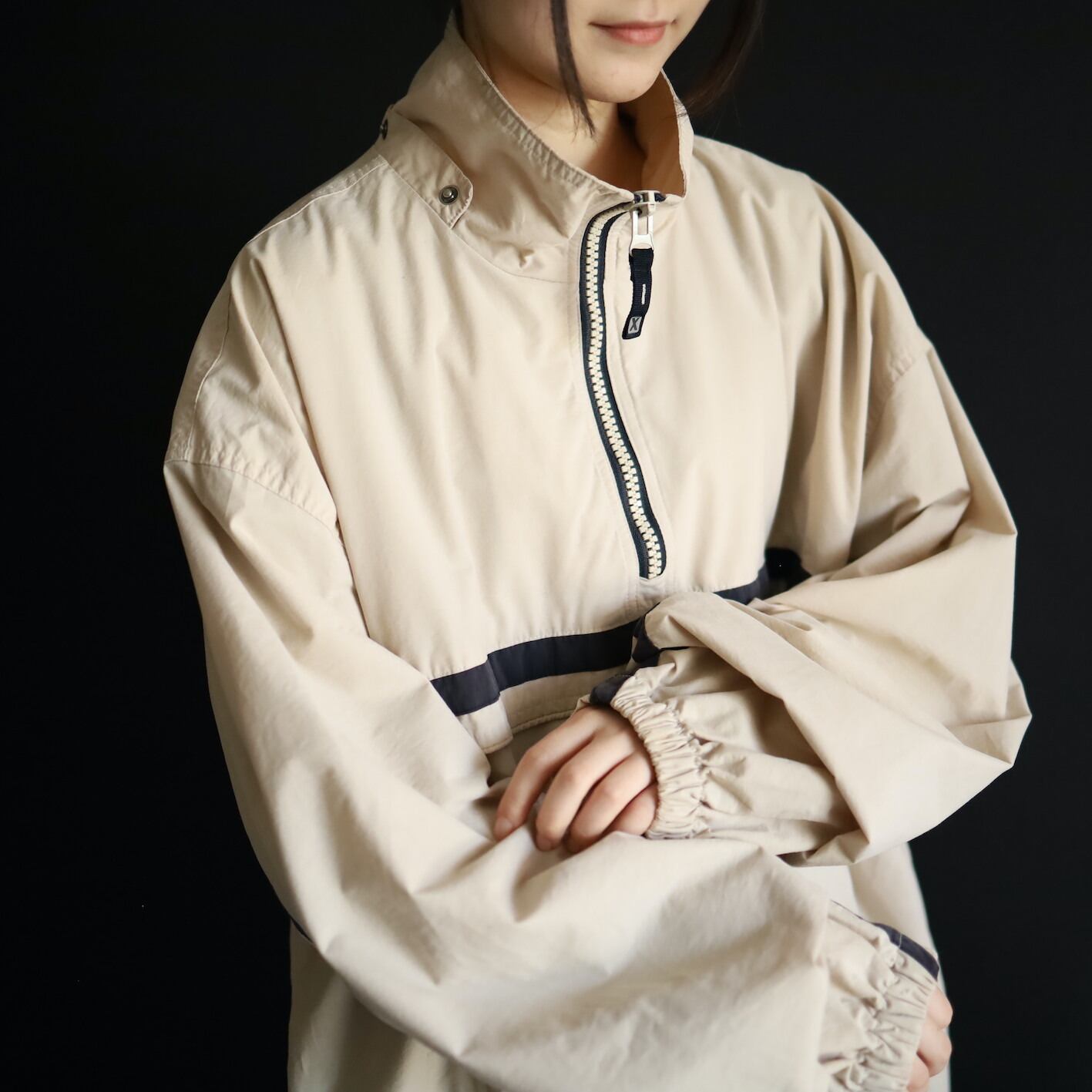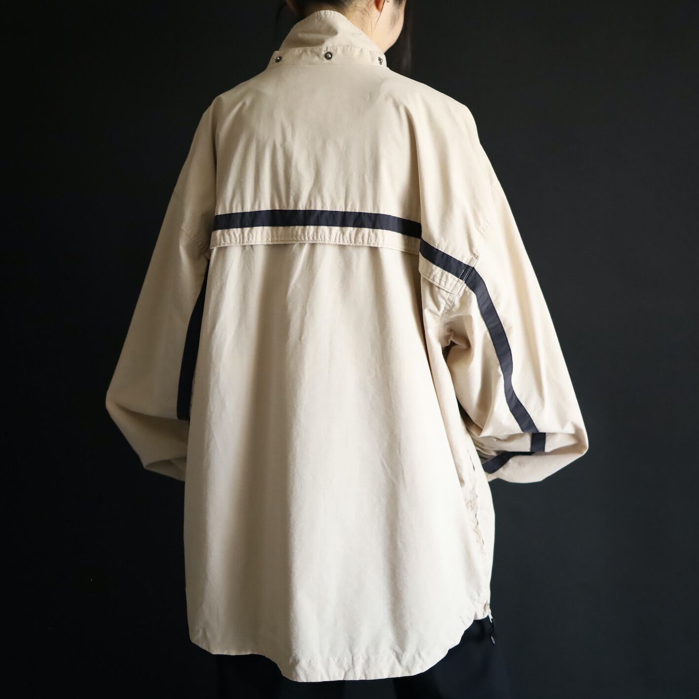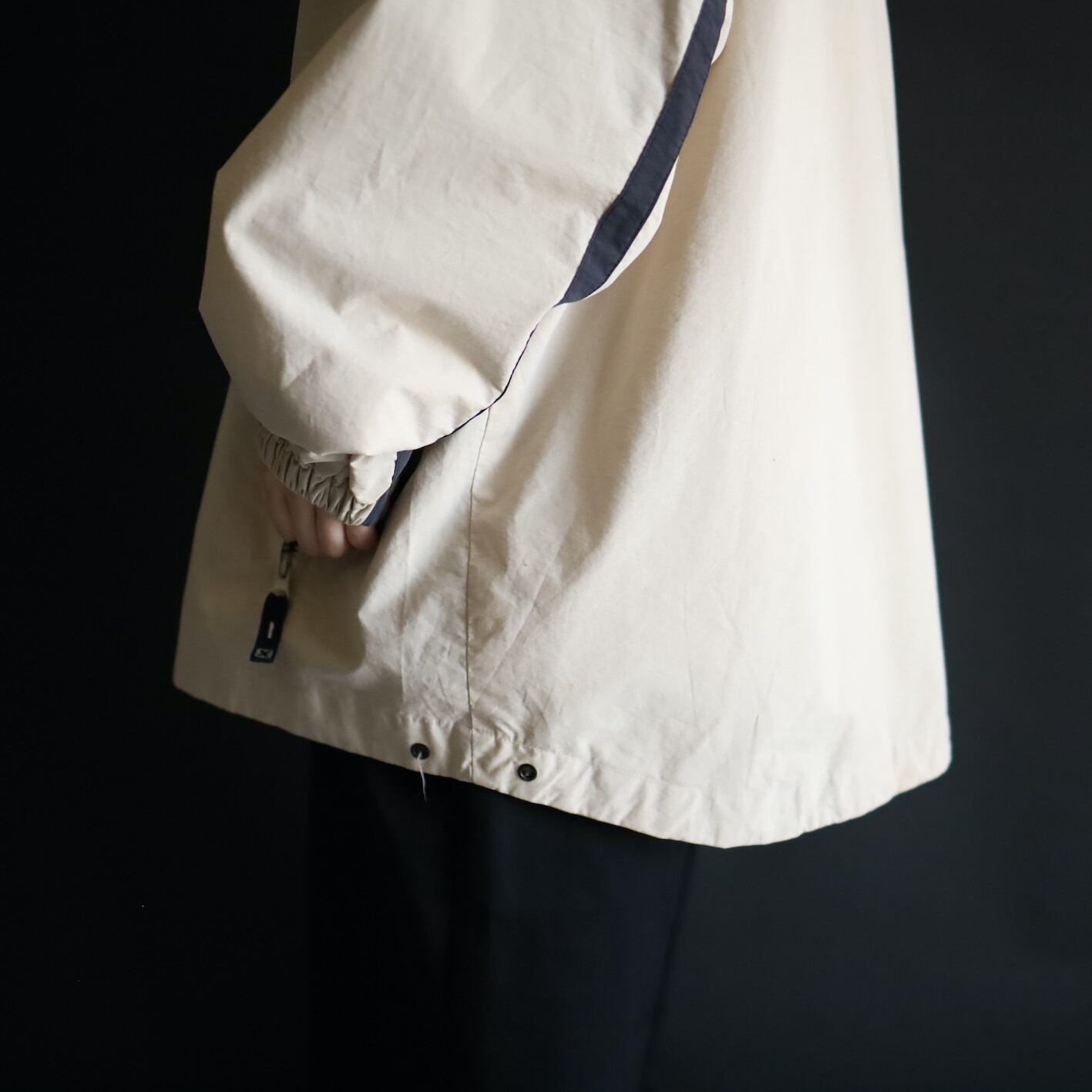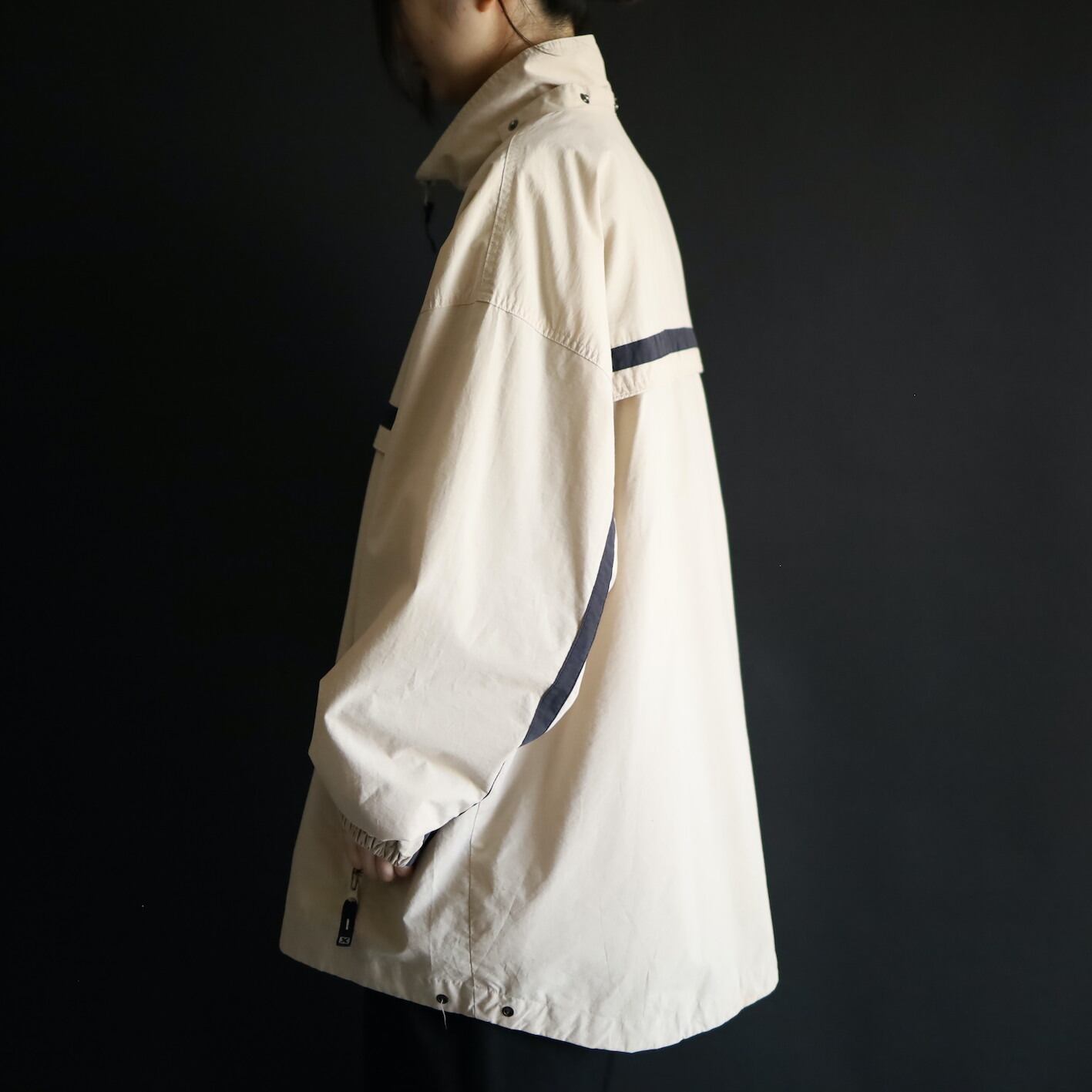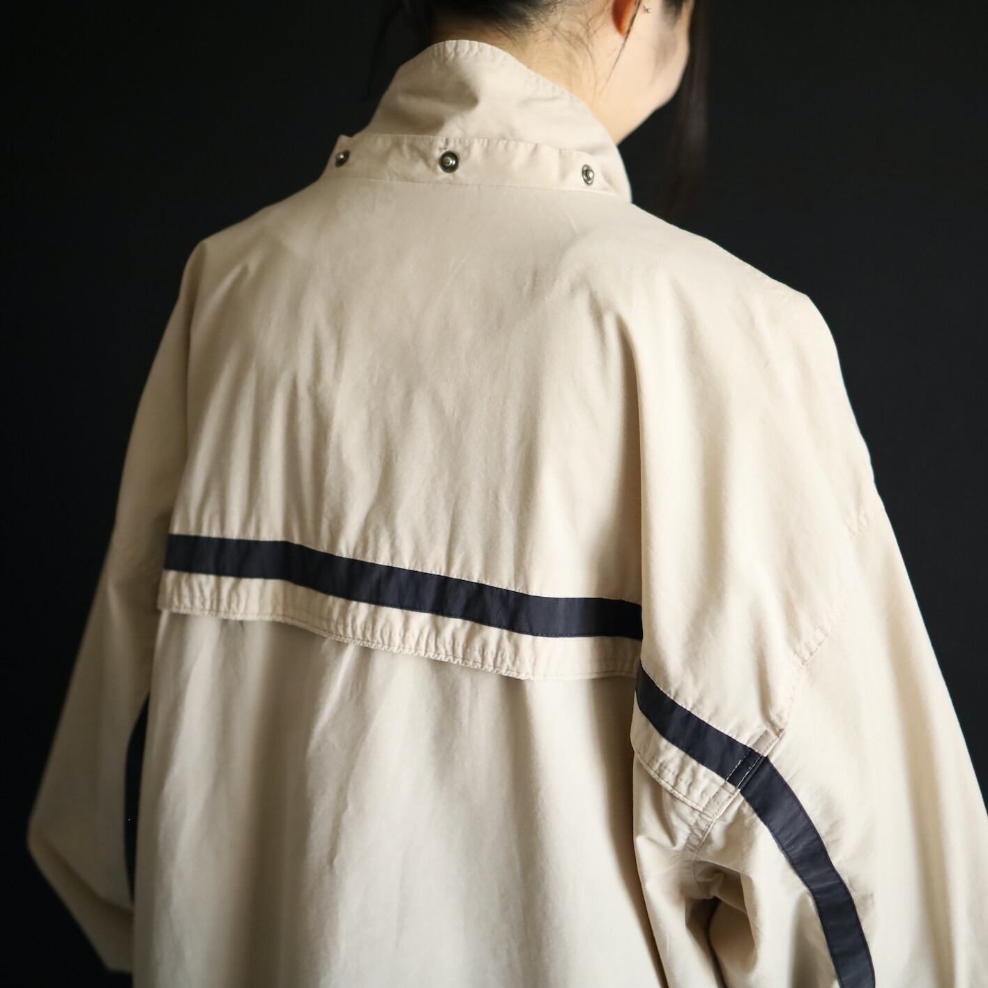 温かみのあるアイボリーカラーをベースに,袖と胸元を横切るチャコールグレーのライン.