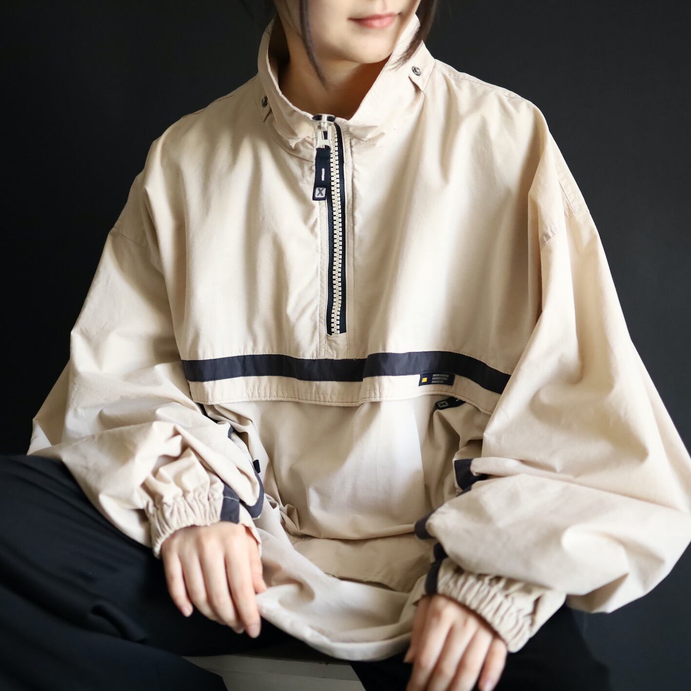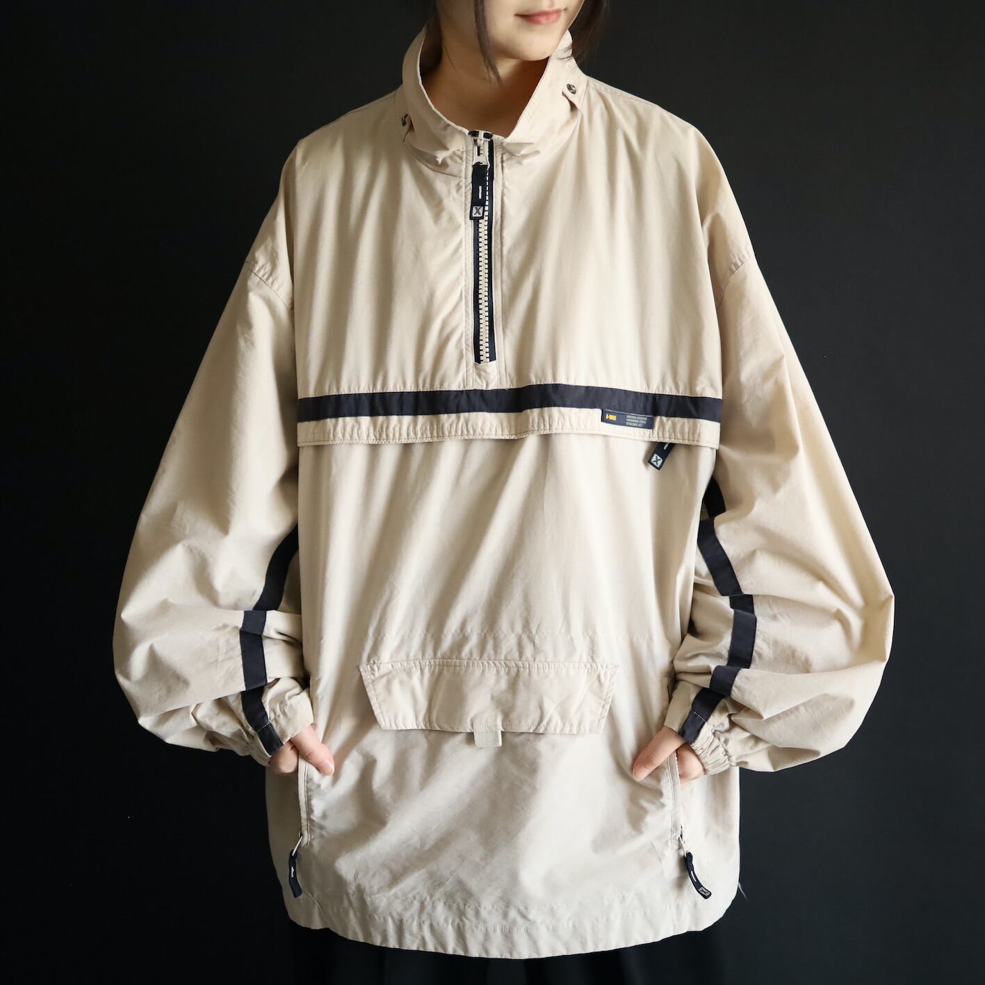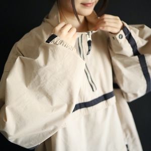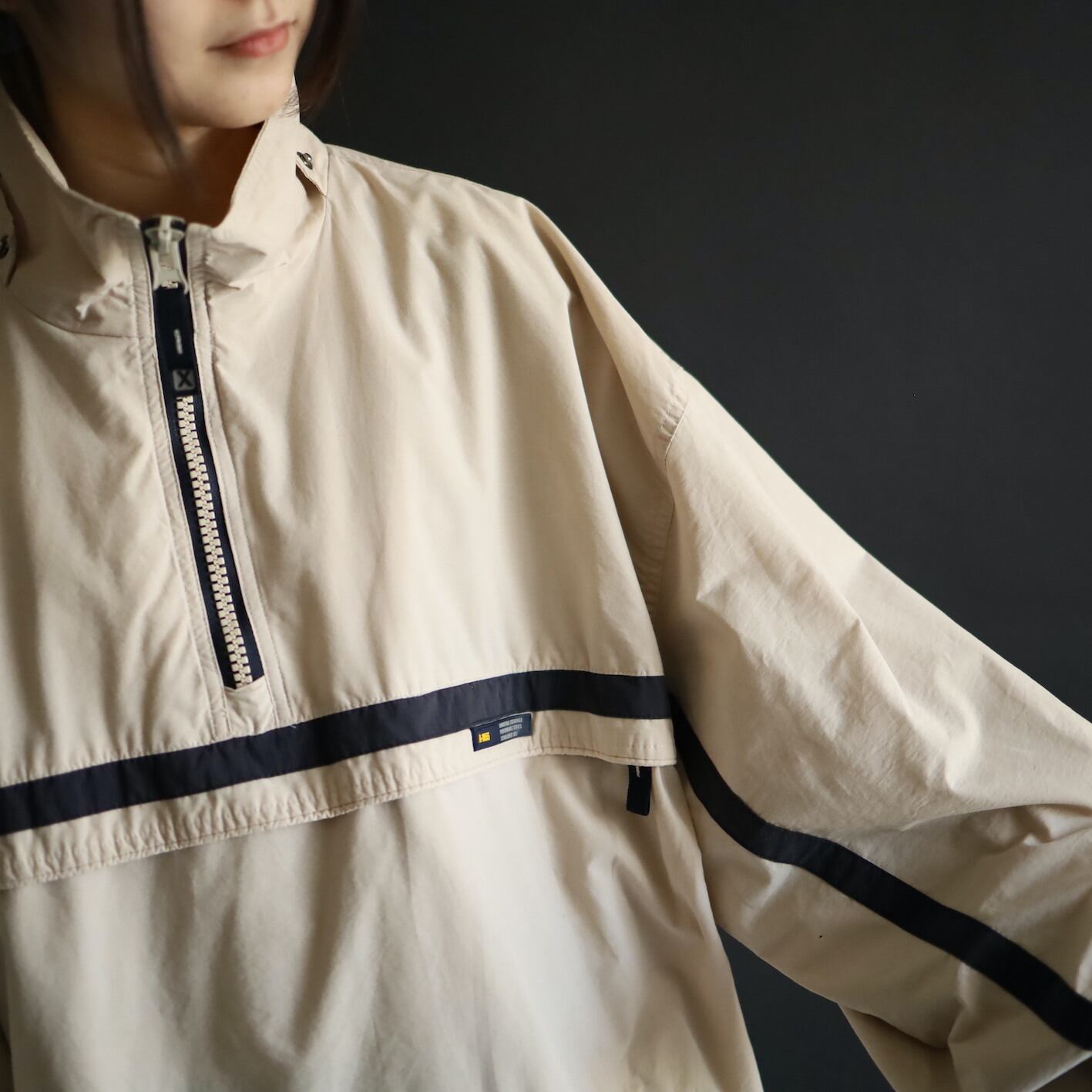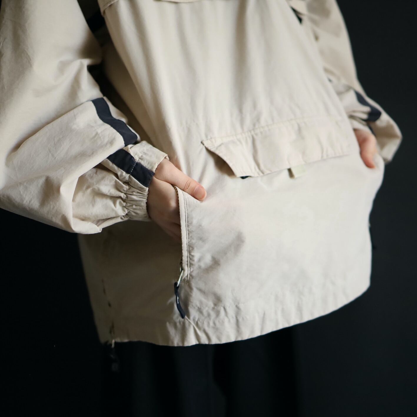 温かみのあるアイボリーカラーをベースに,袖と胸元を横切るチャコールグレーのライン.