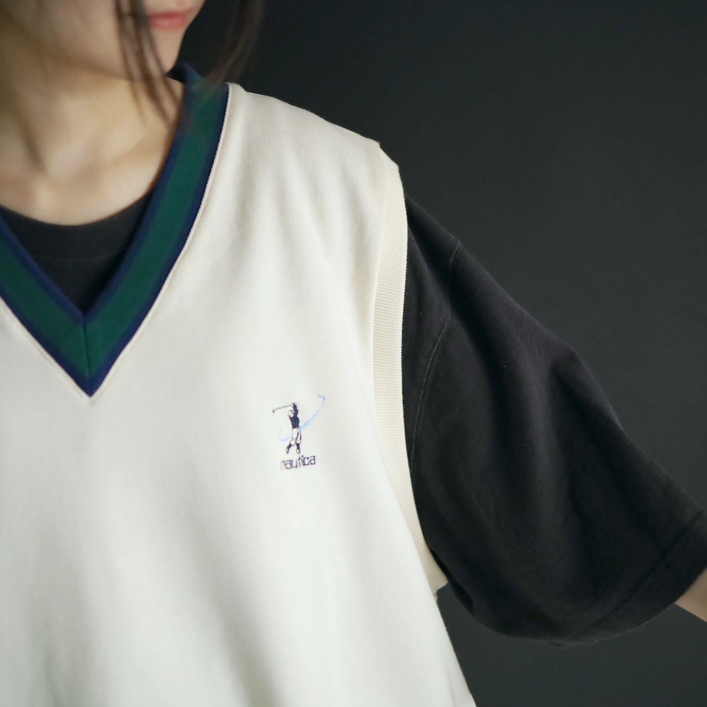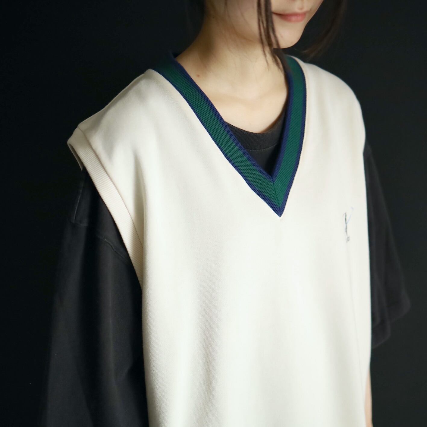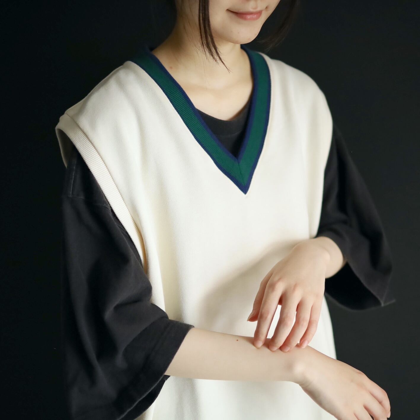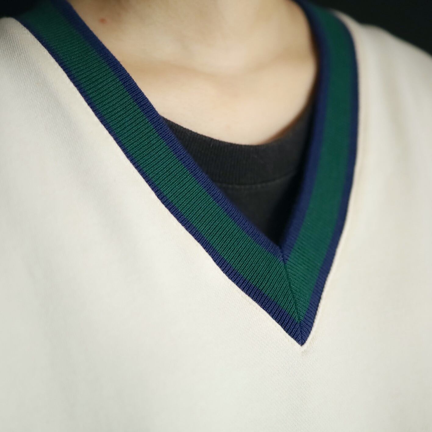 首元のVラインはグリーンとネイビーのライン切替.