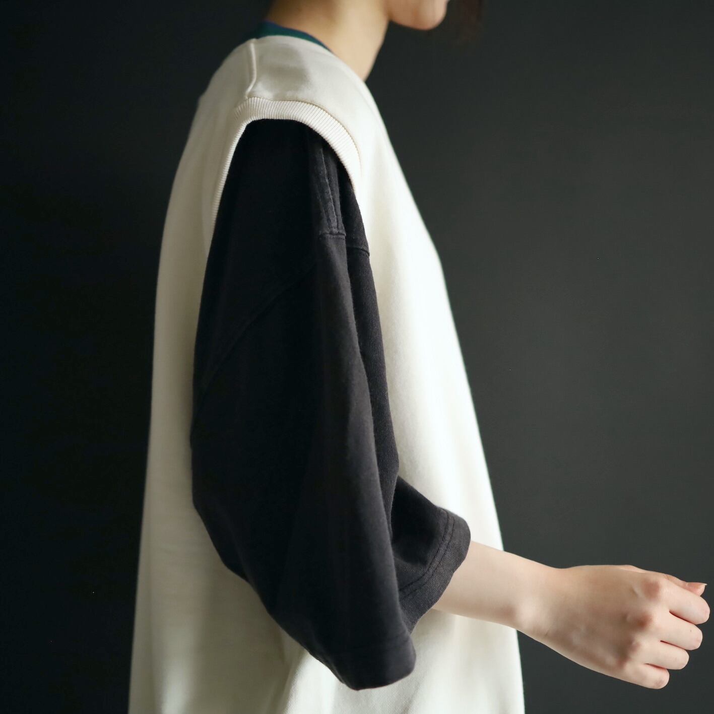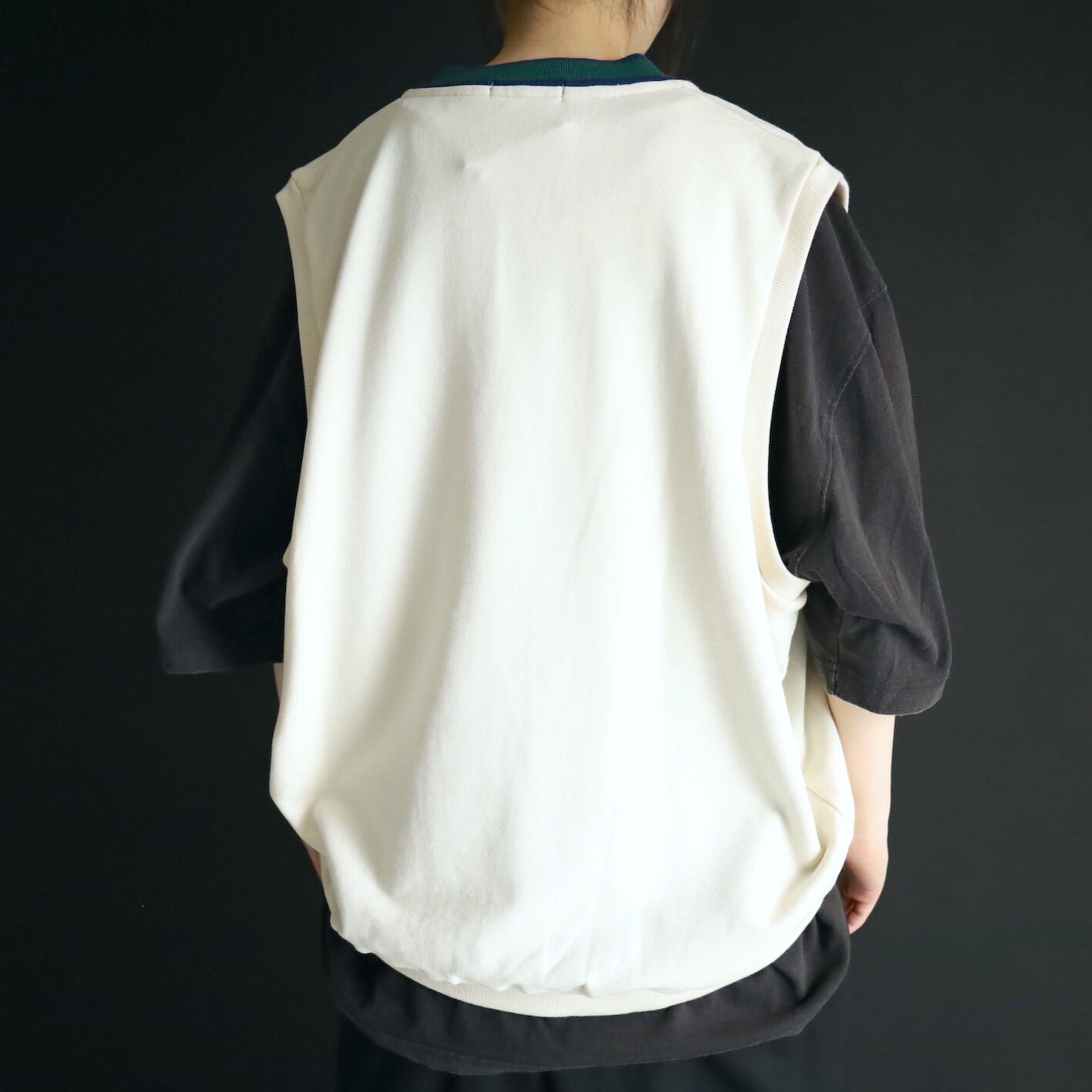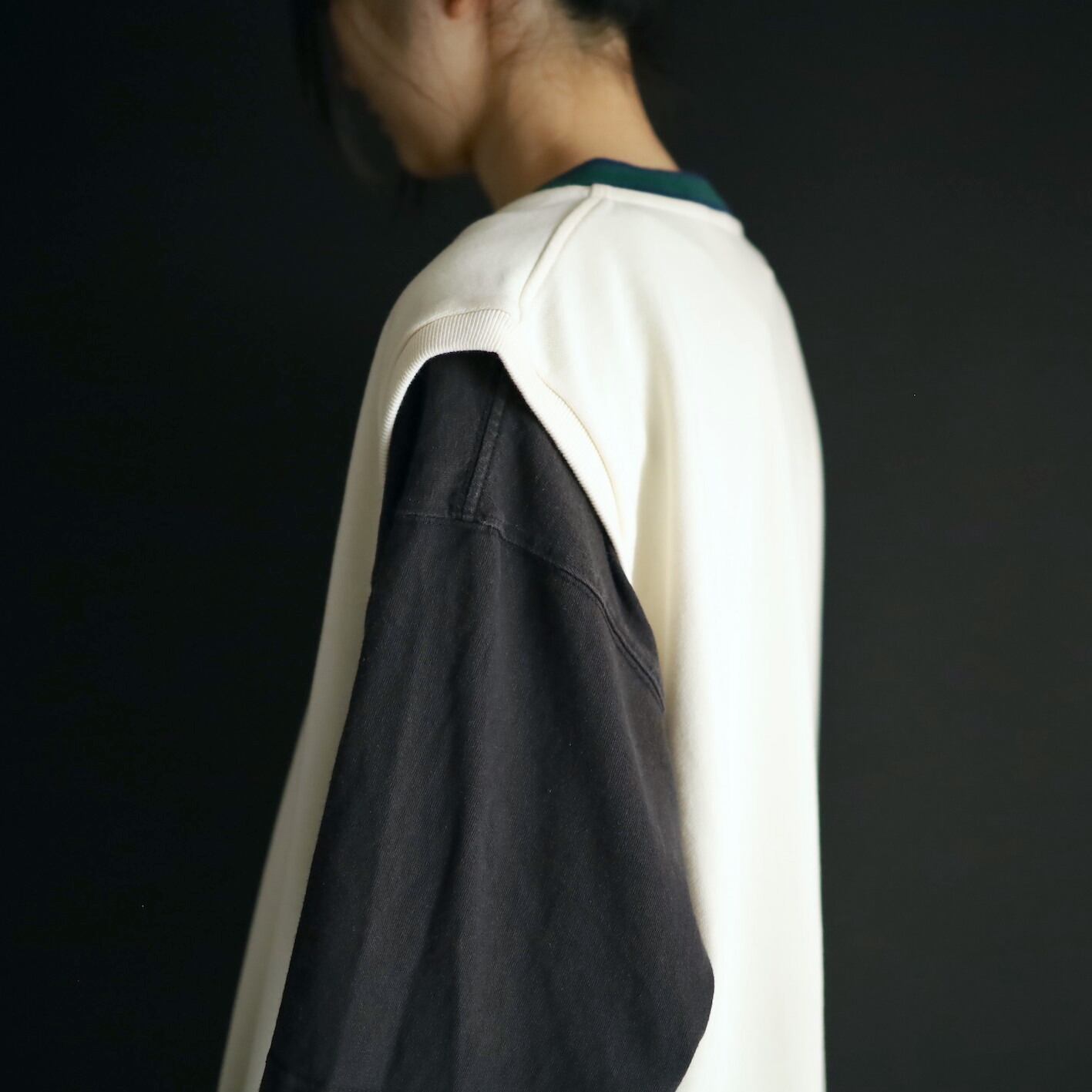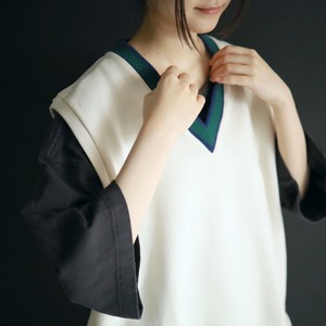 首元のVラインはグリーンとネイビーのライン切替.