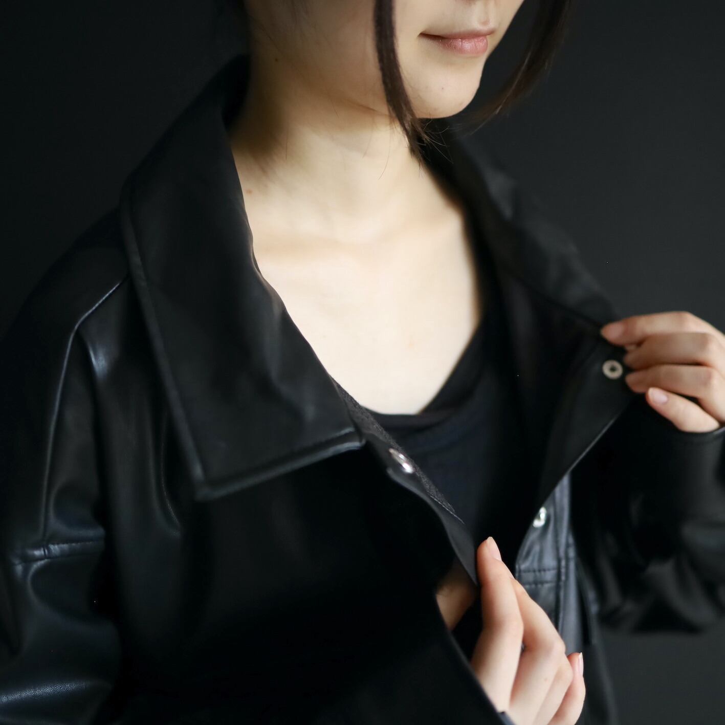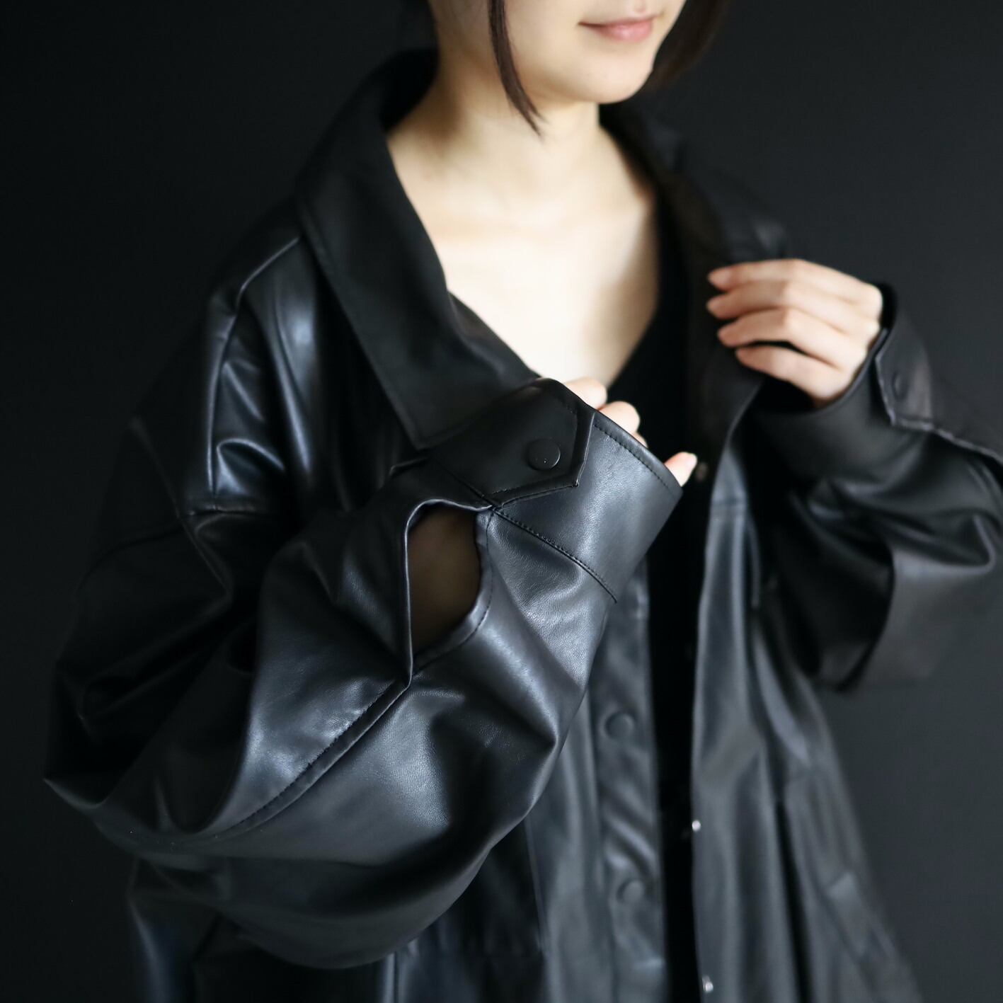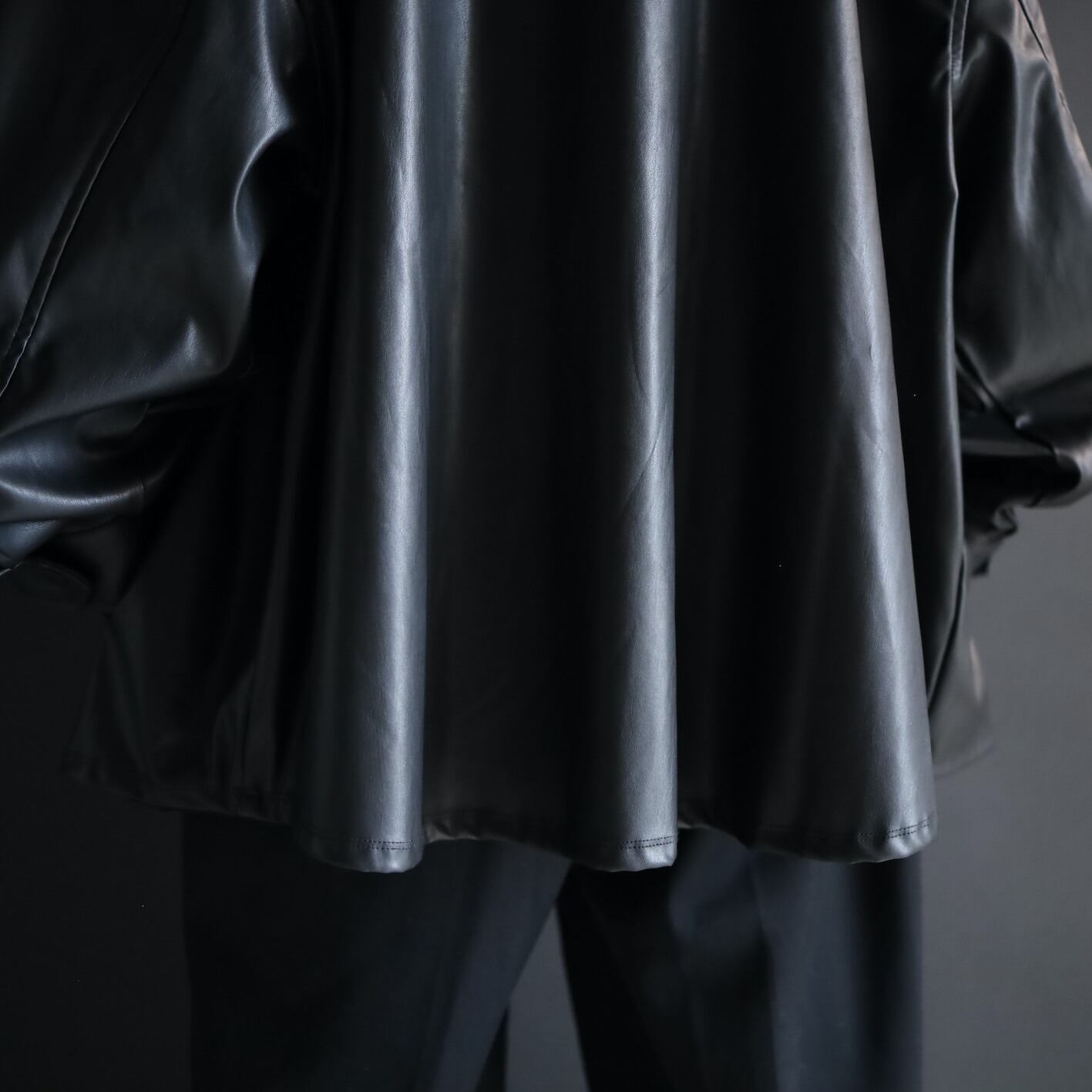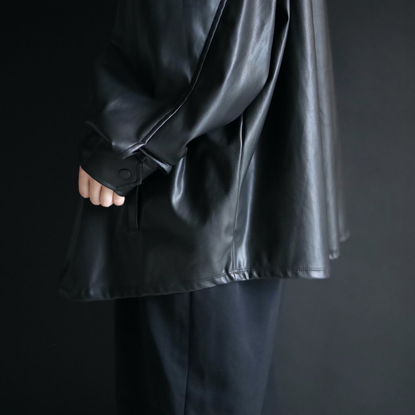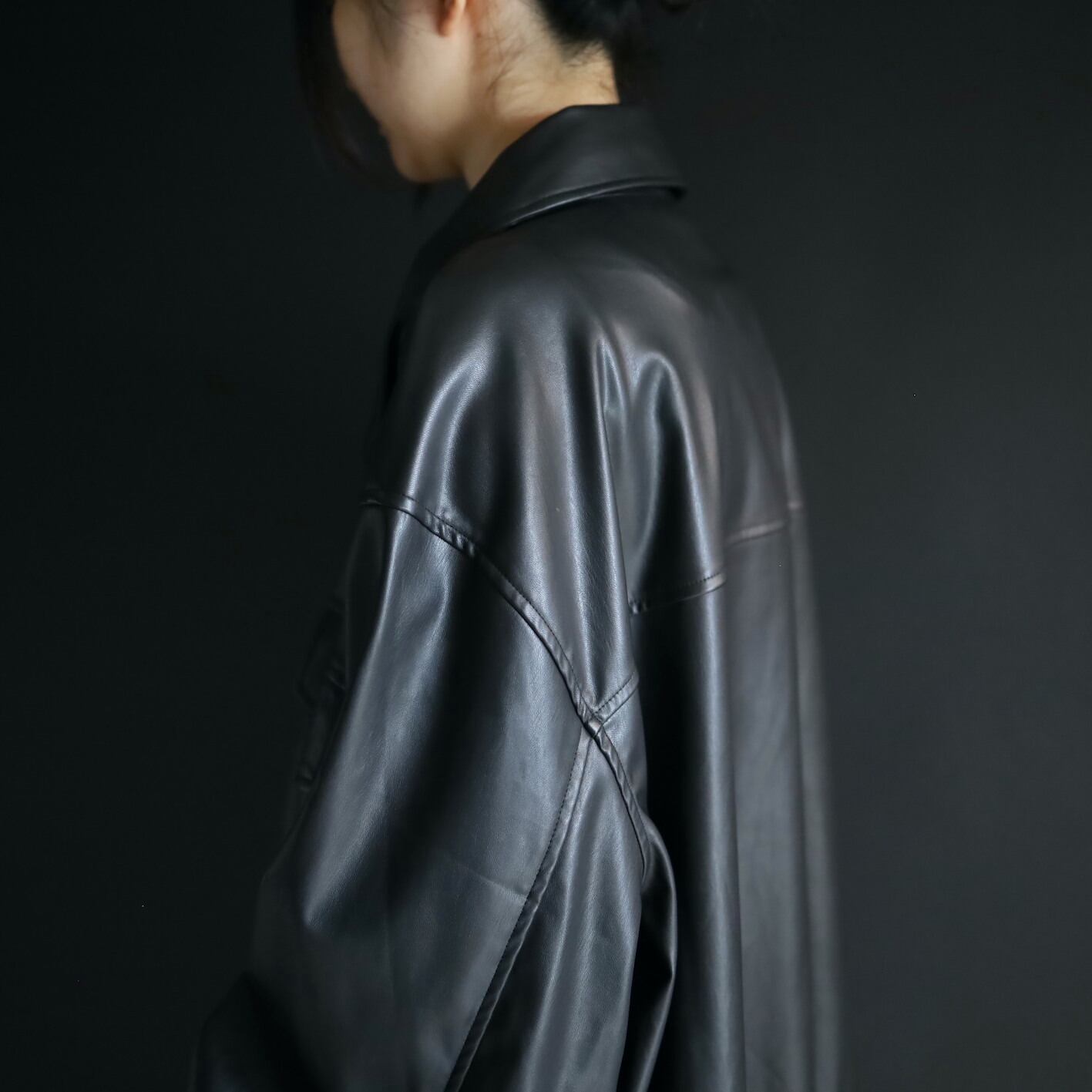 非常柔らかくしっとりとしたフェイクレザーで,本革とは比べ物にならない羽織りやすさ.