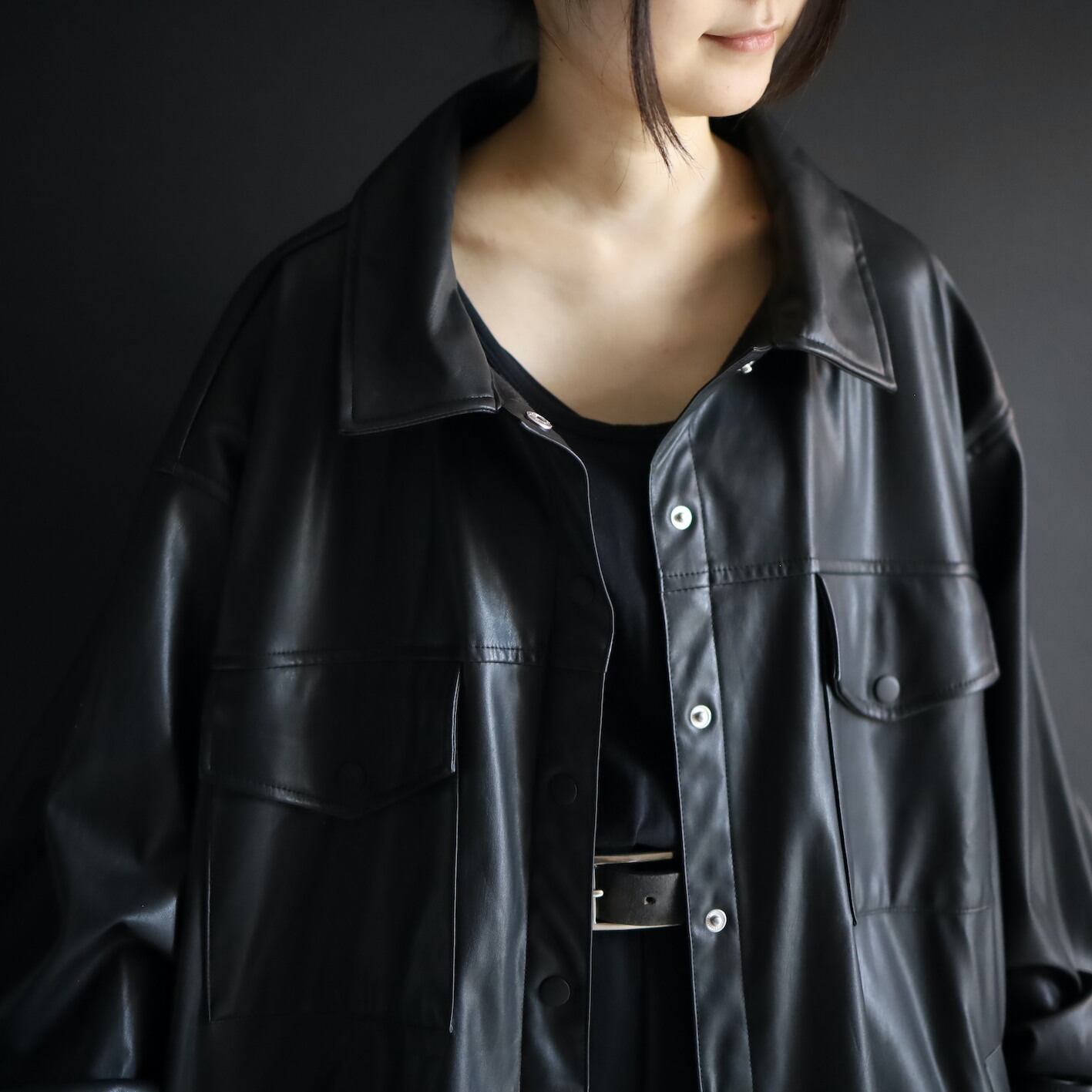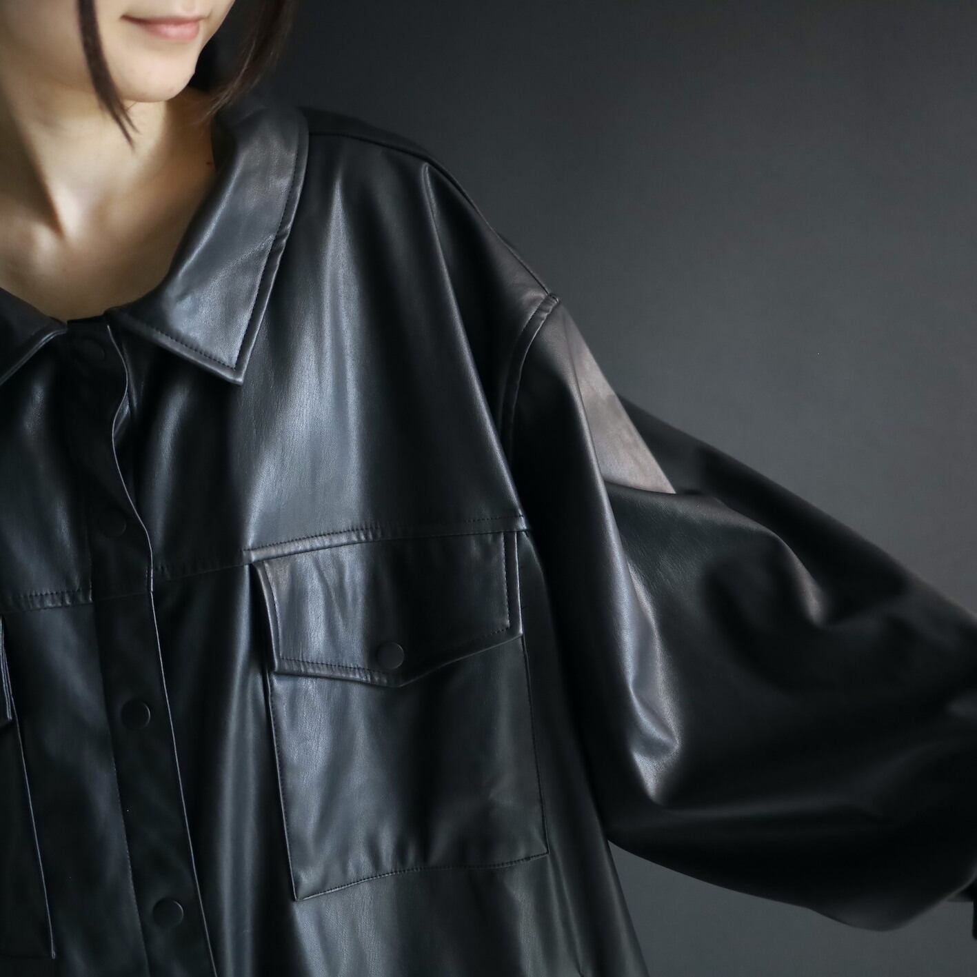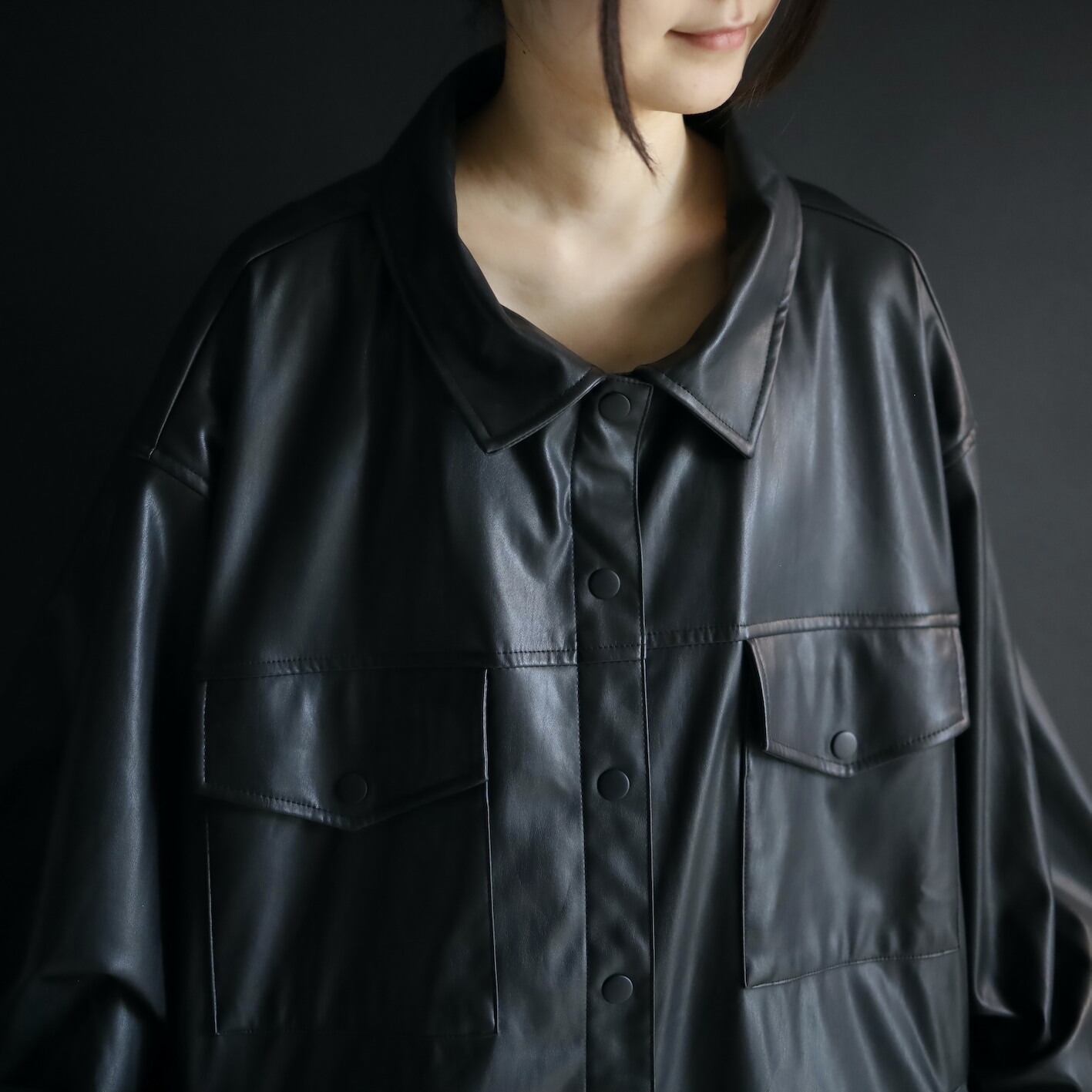 モードなフェイクレザーのシャツジャケットの入荷です.