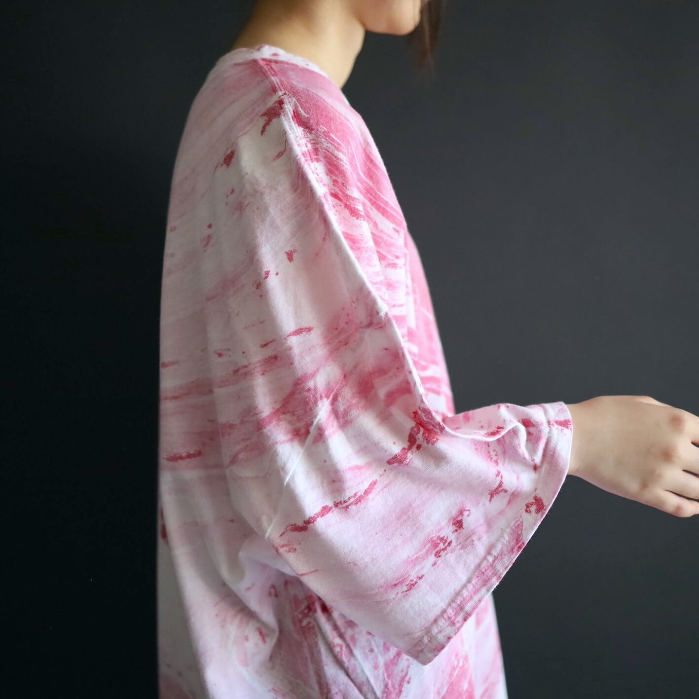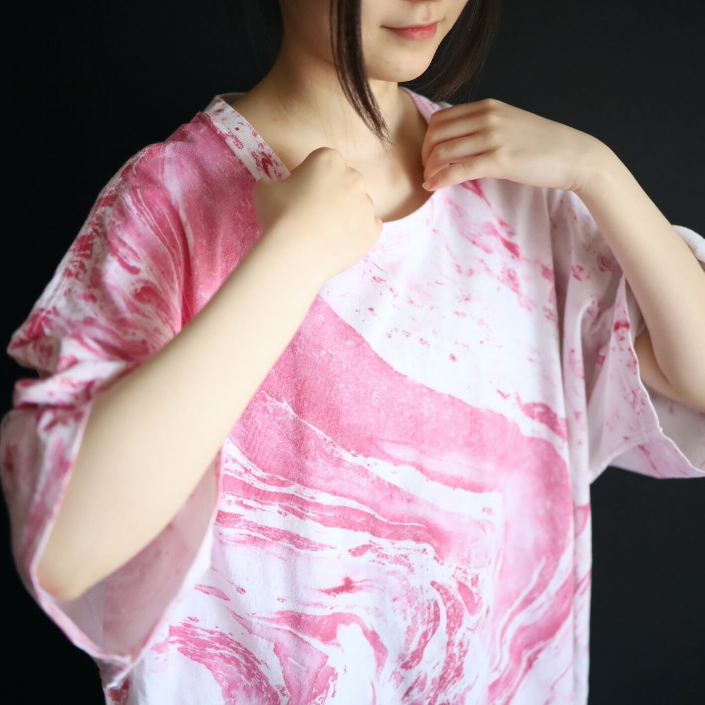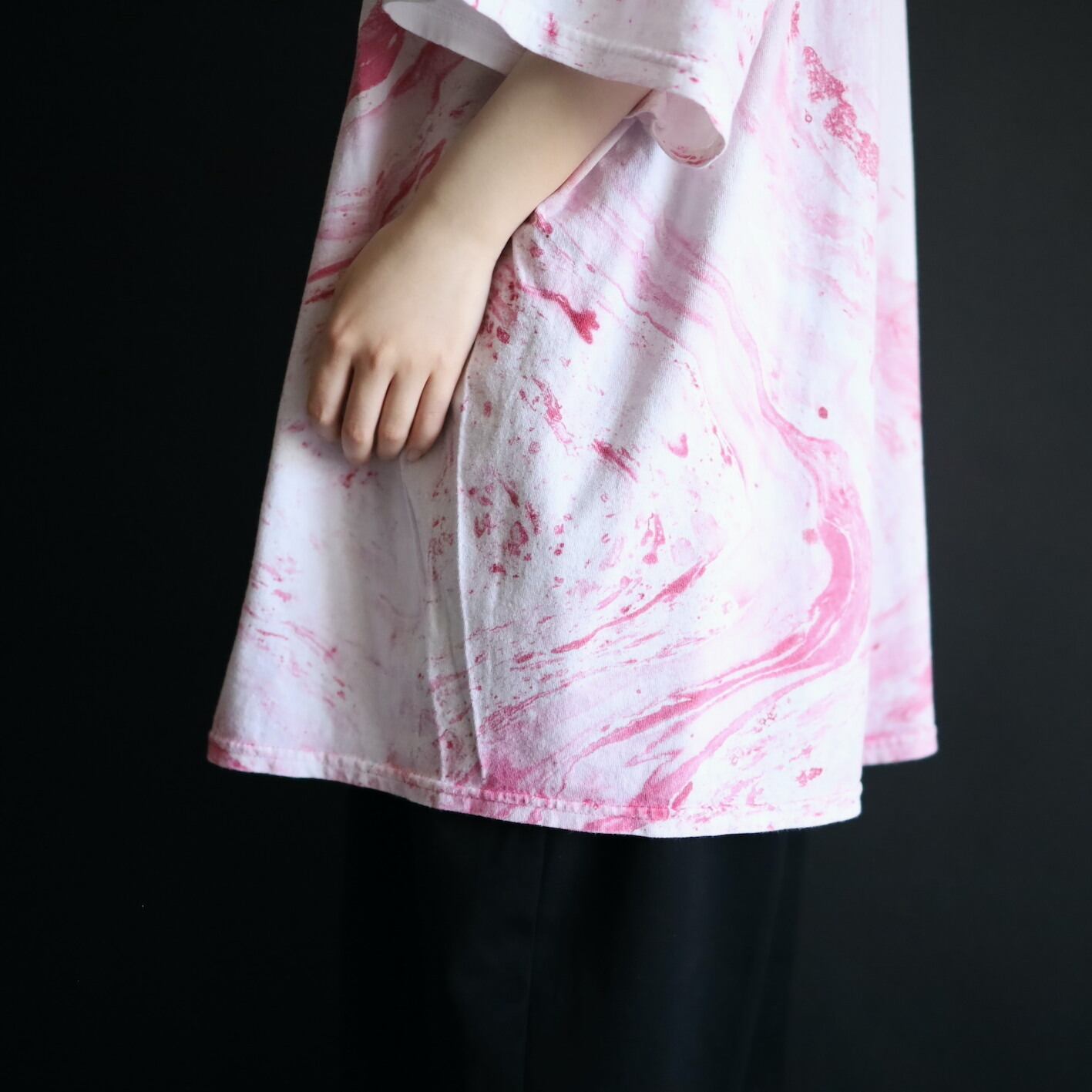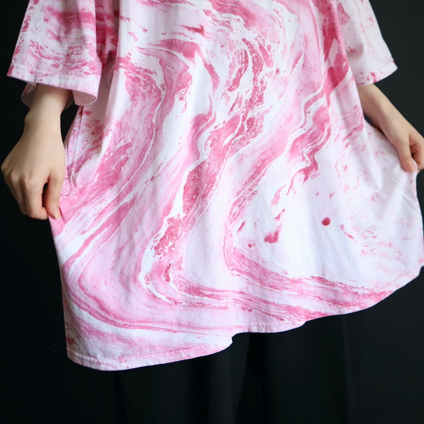 ホワイトカラーをベースに,全体にピンクで不規則なプリント.