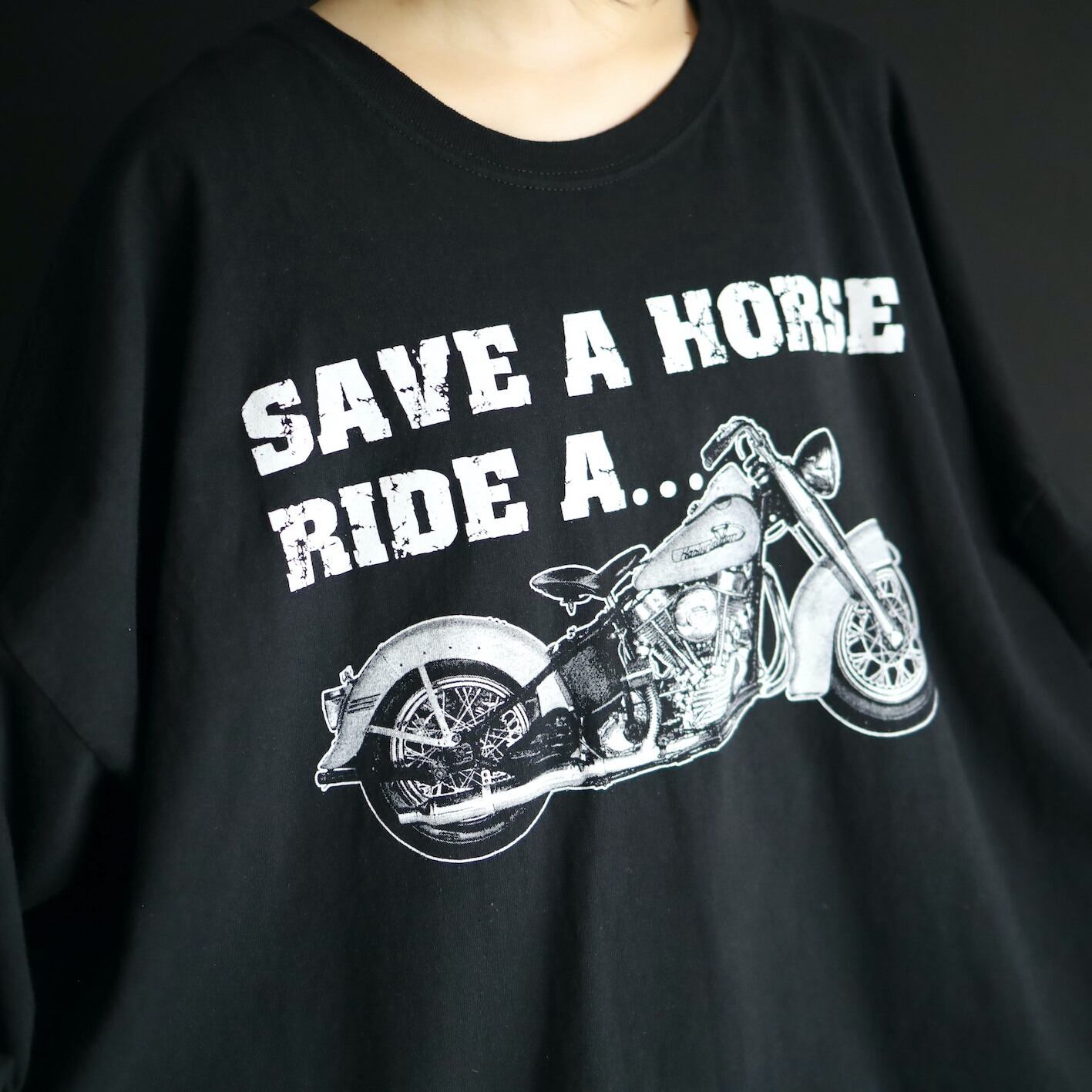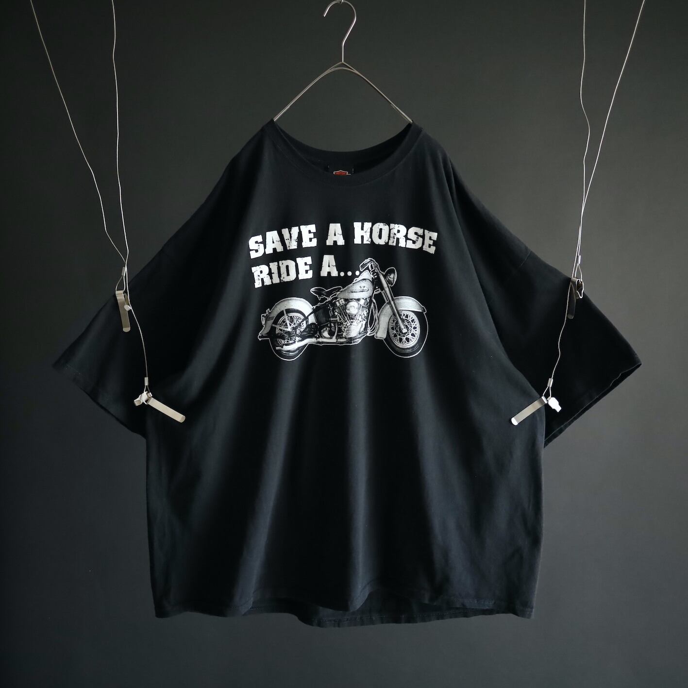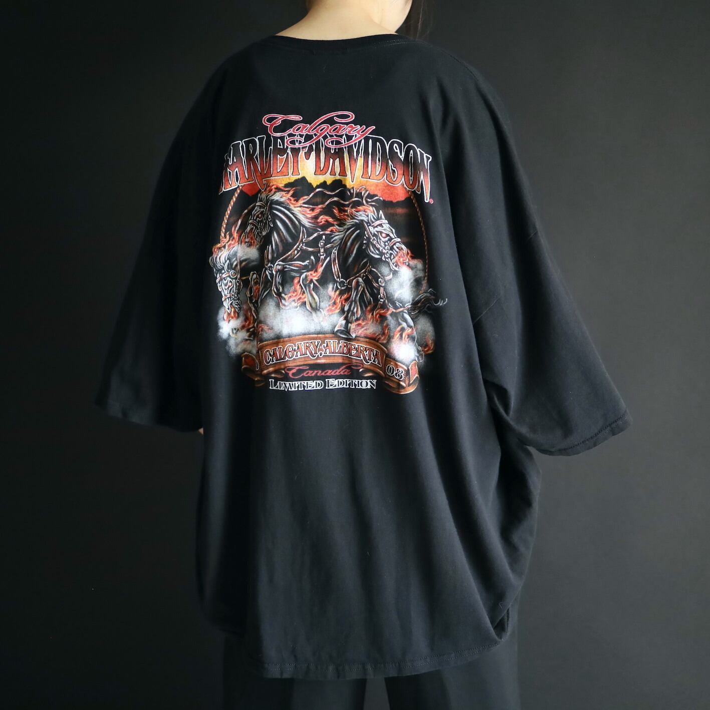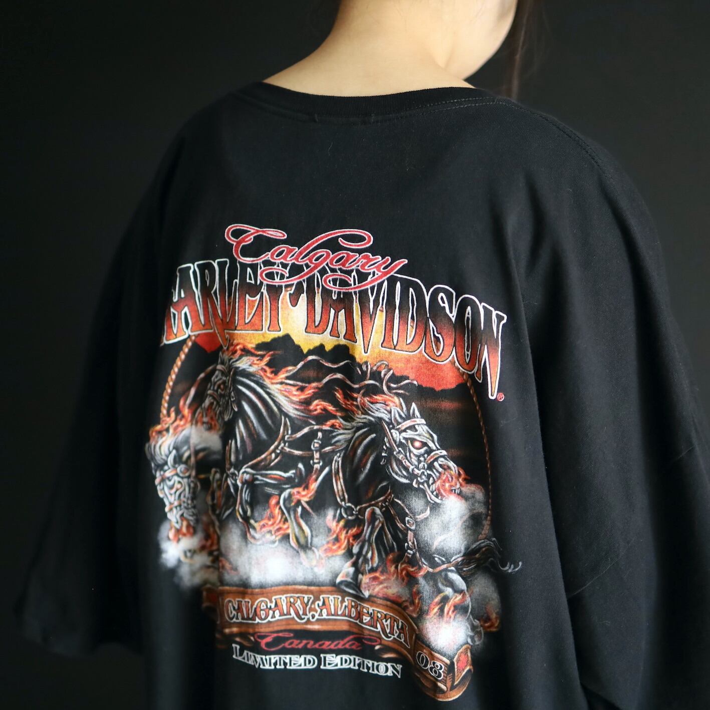 フロントにはハーレーらしいアメリカンバイクプリント,バックには火を纏った3頭の馬プリント.
