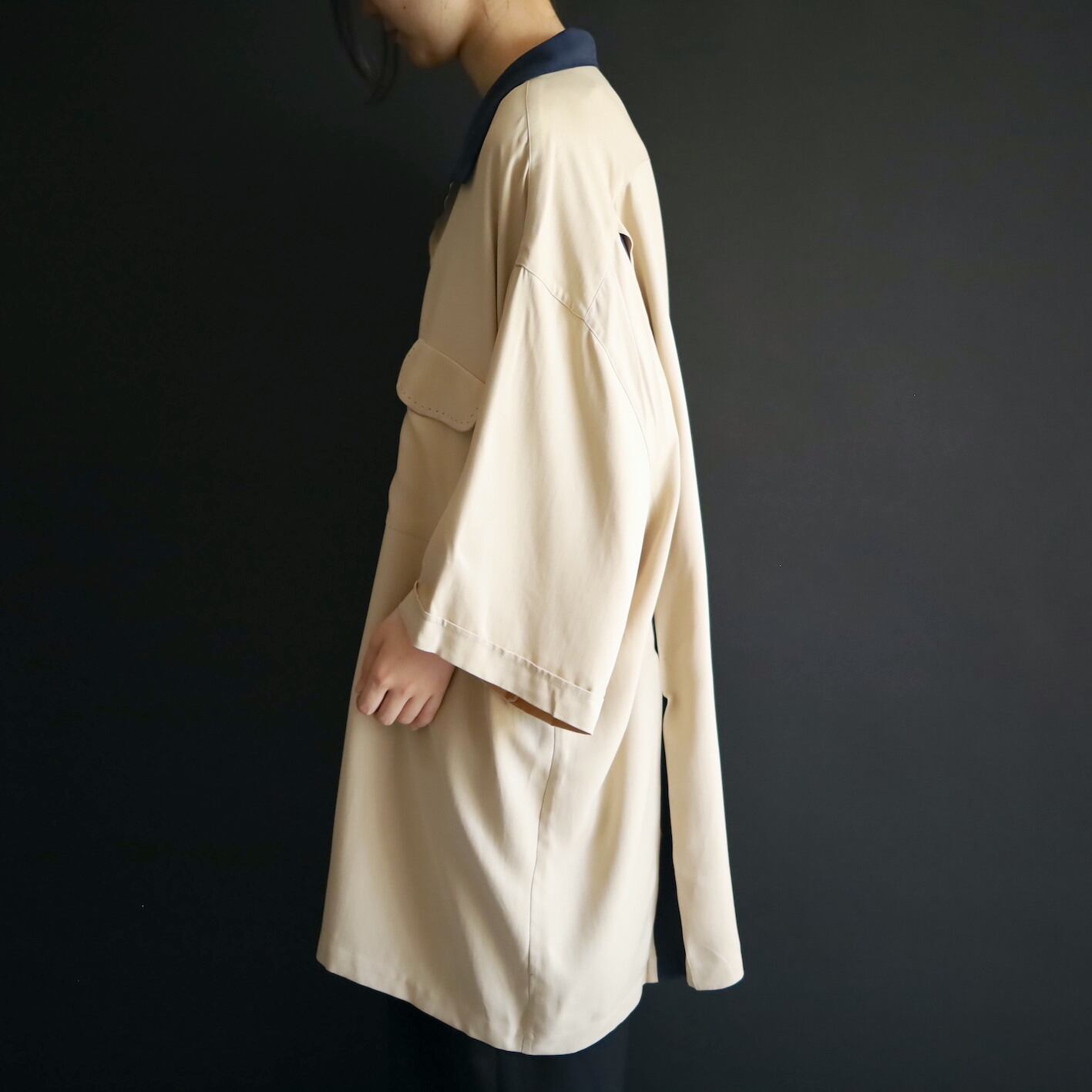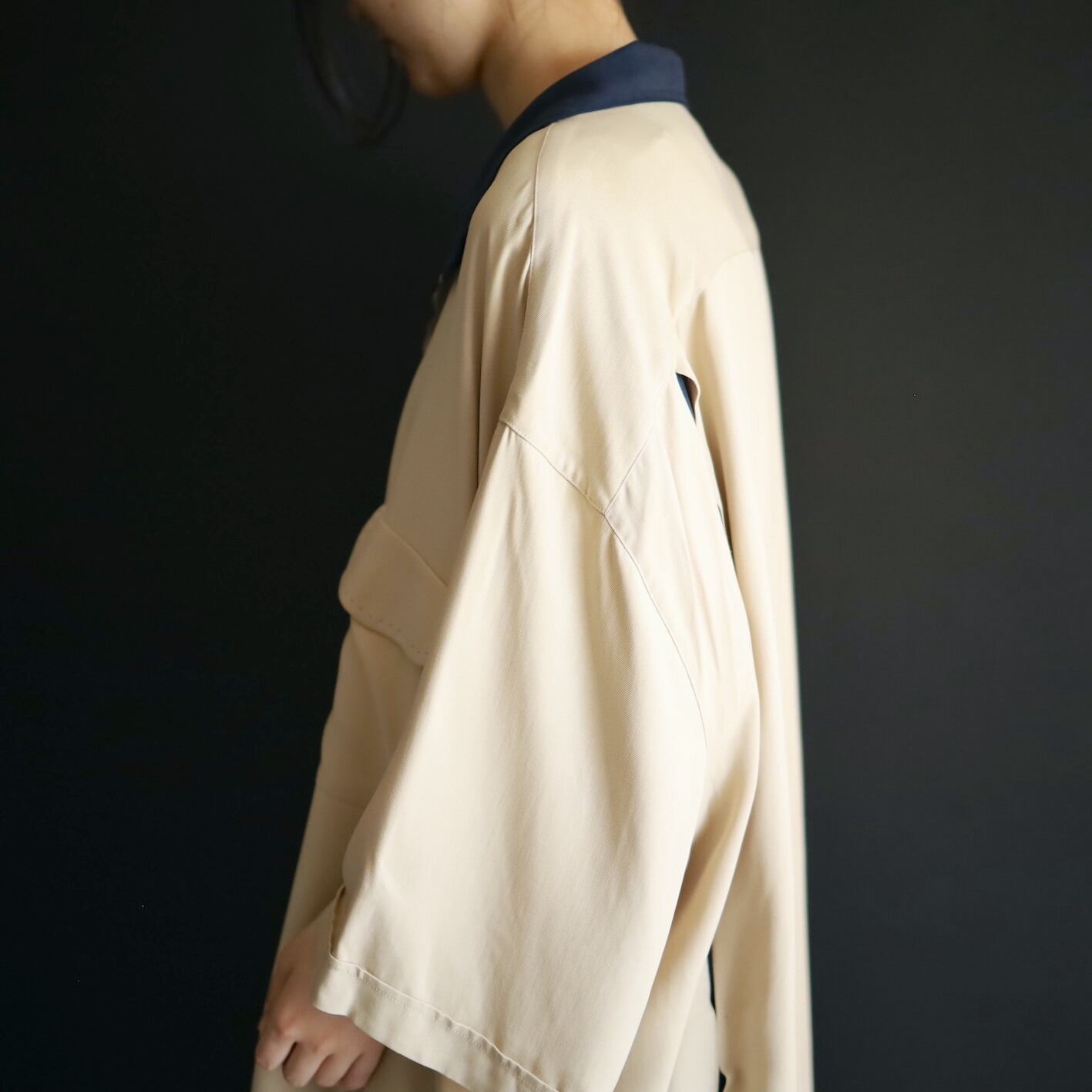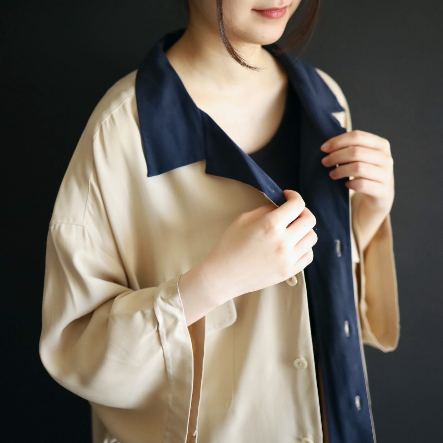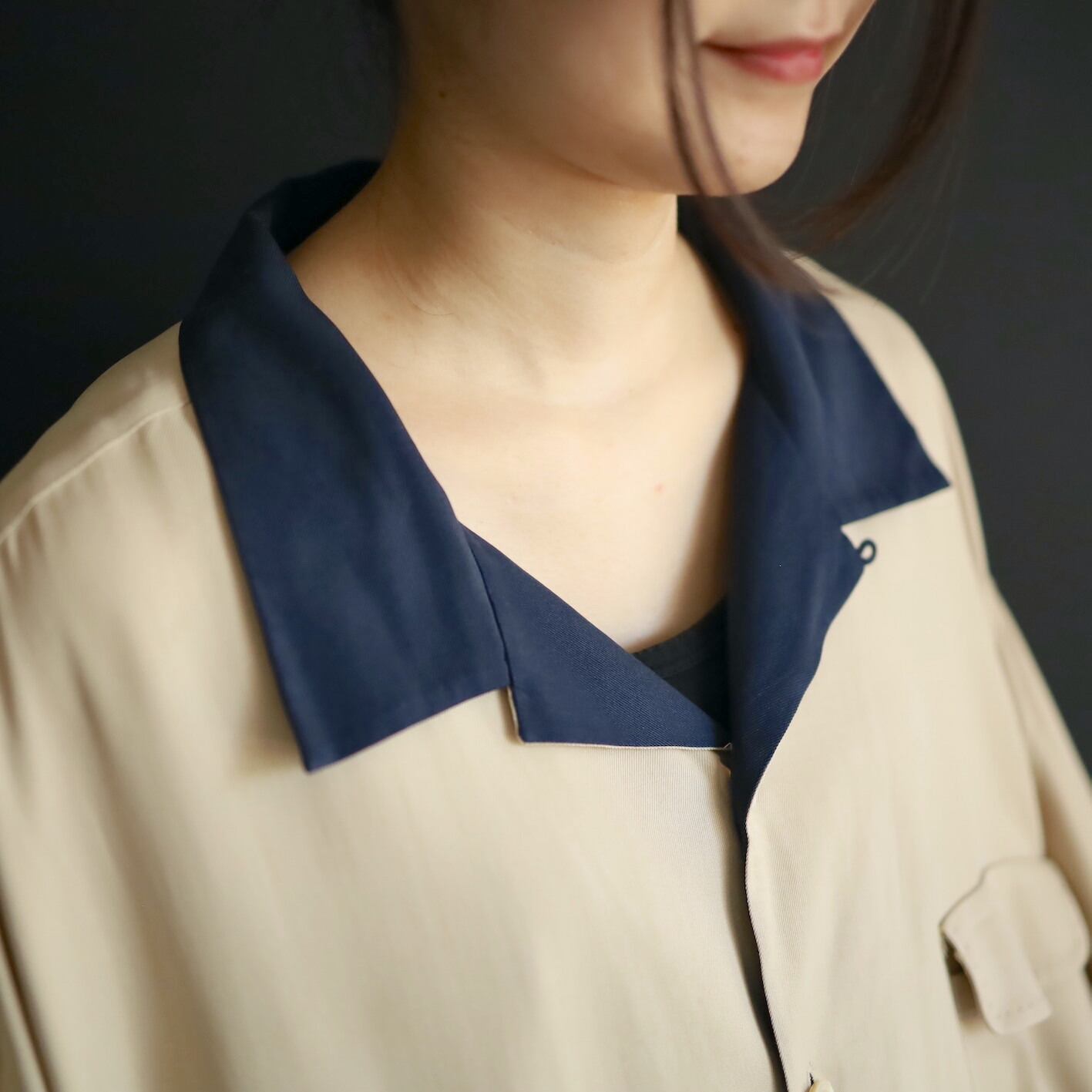 ベージュをベースにしたボディに,襟がネイビーのバイカラー切替.