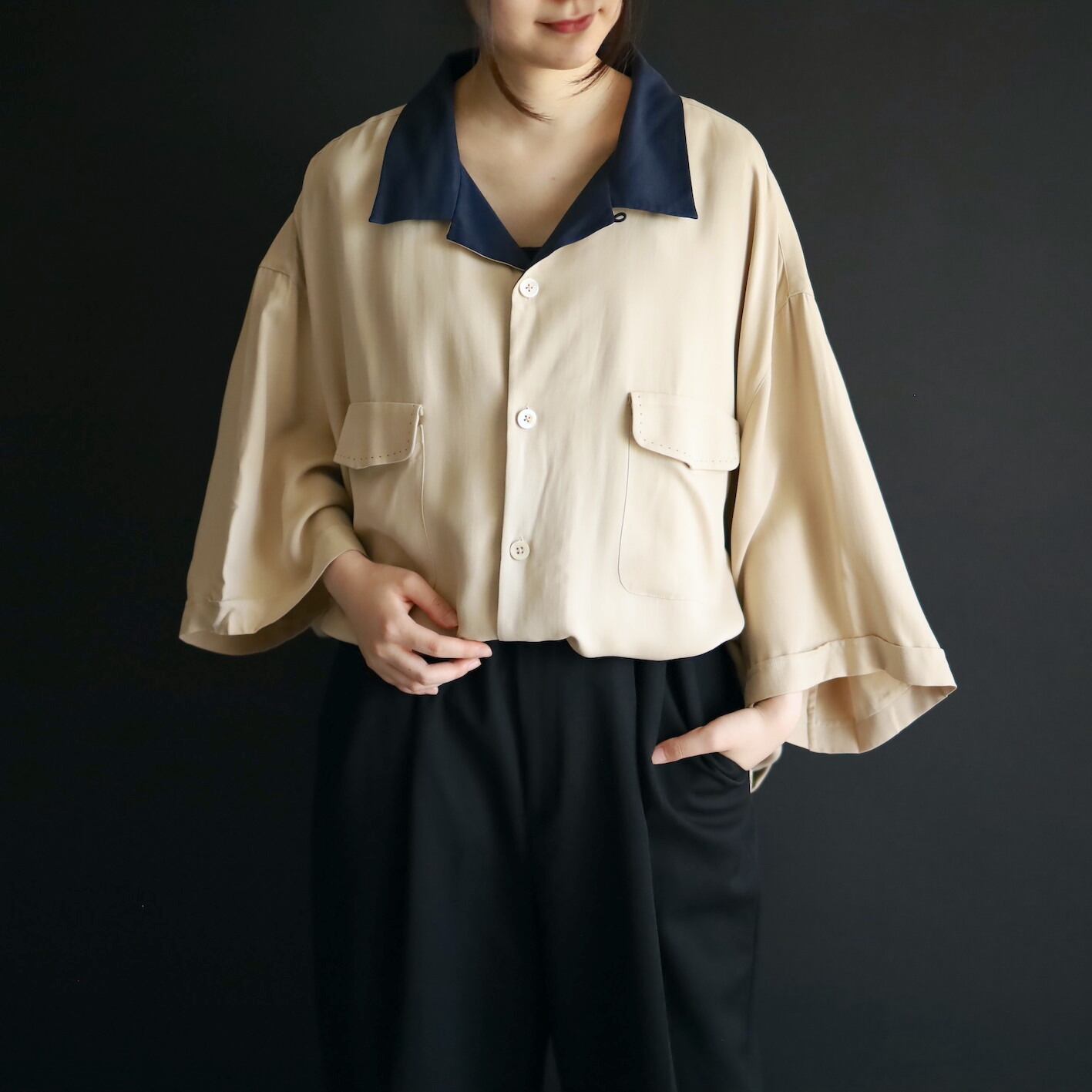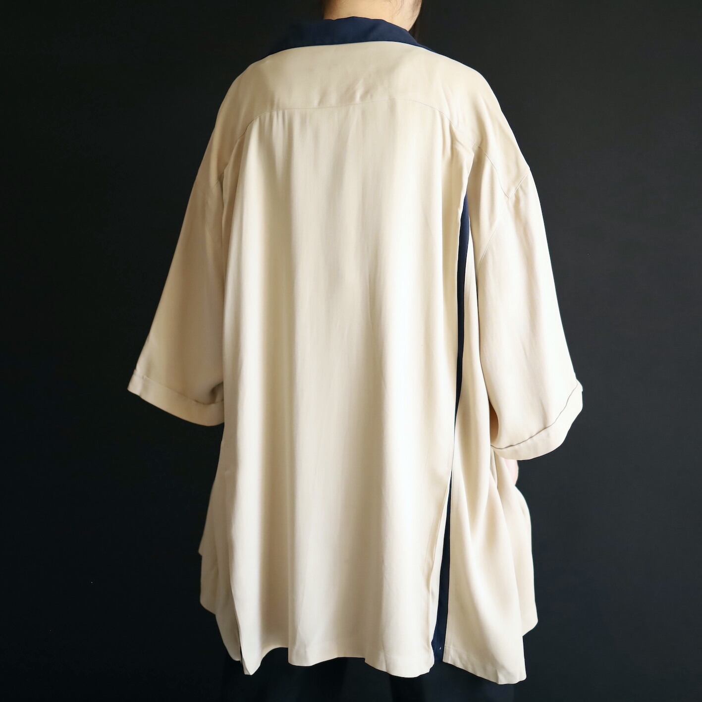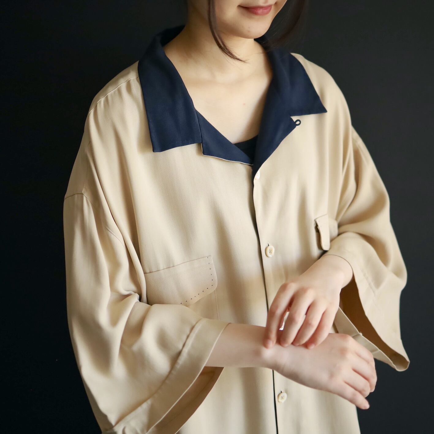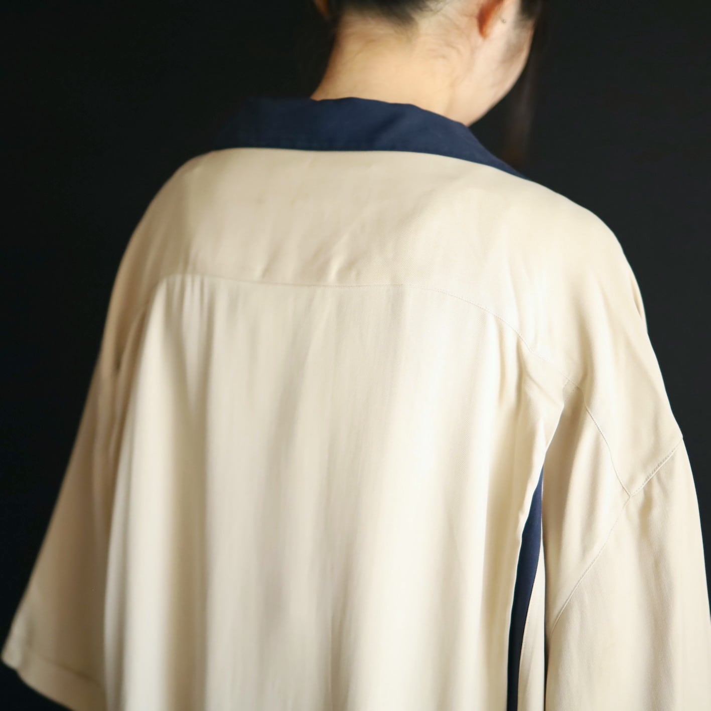 ベージュをベースにしたボディに,襟がネイビーのバイカラー切替.