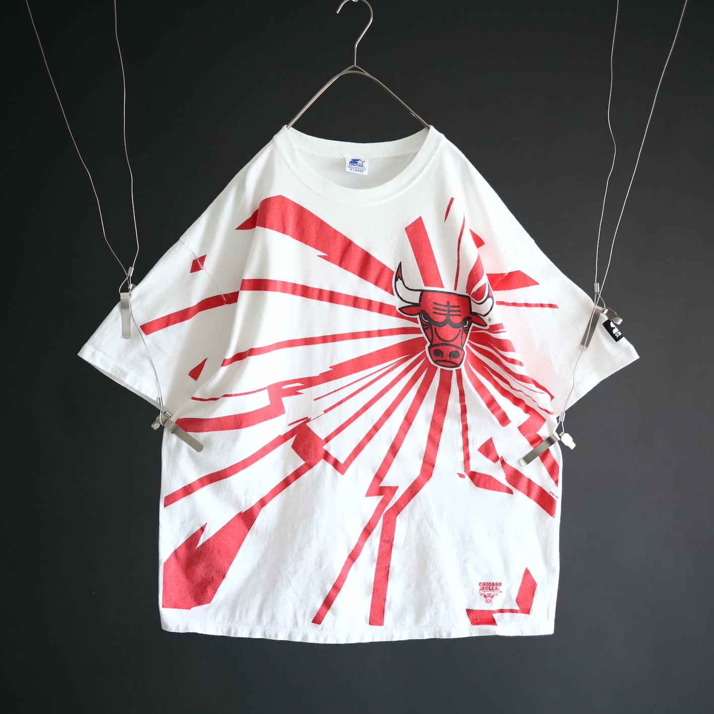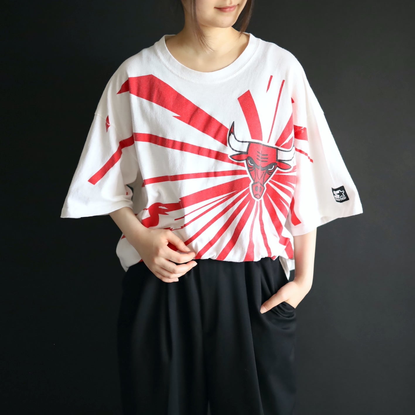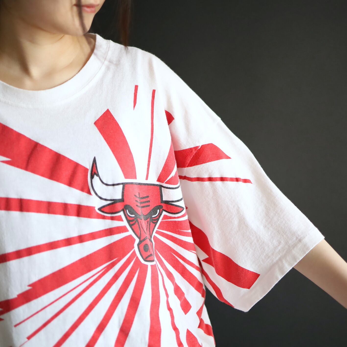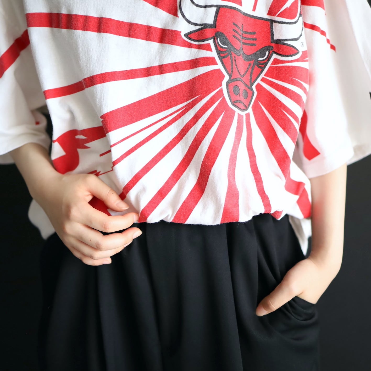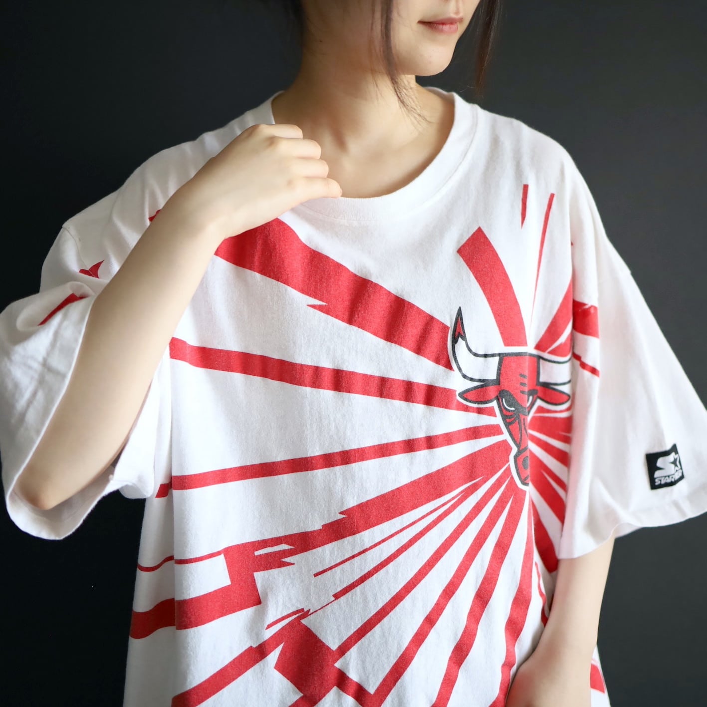 ホワイトカラーベのボディに,パキッと映えるレッドベースのNBA,CHICAGO BULLSプリント.