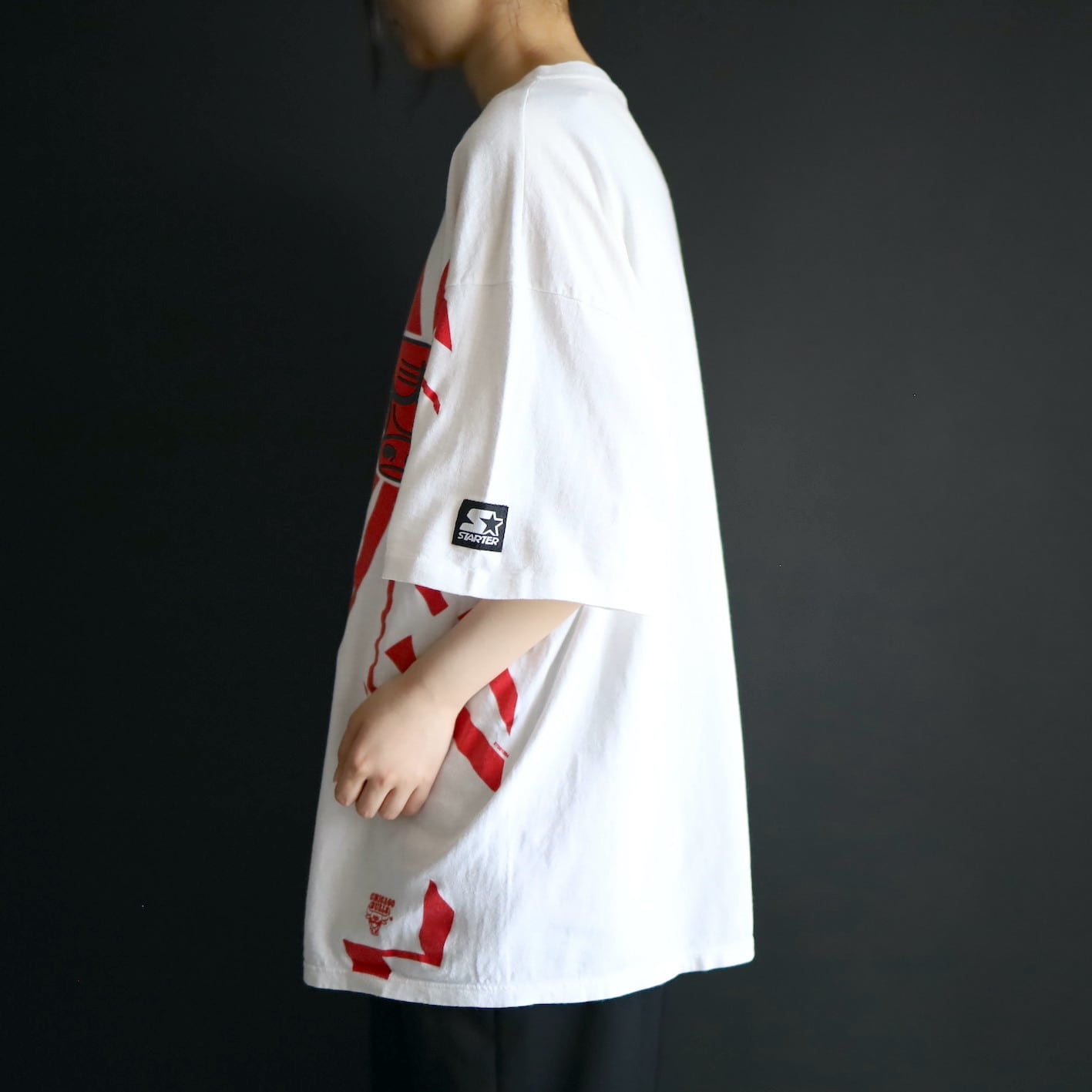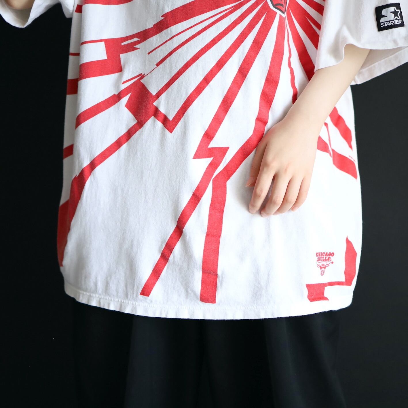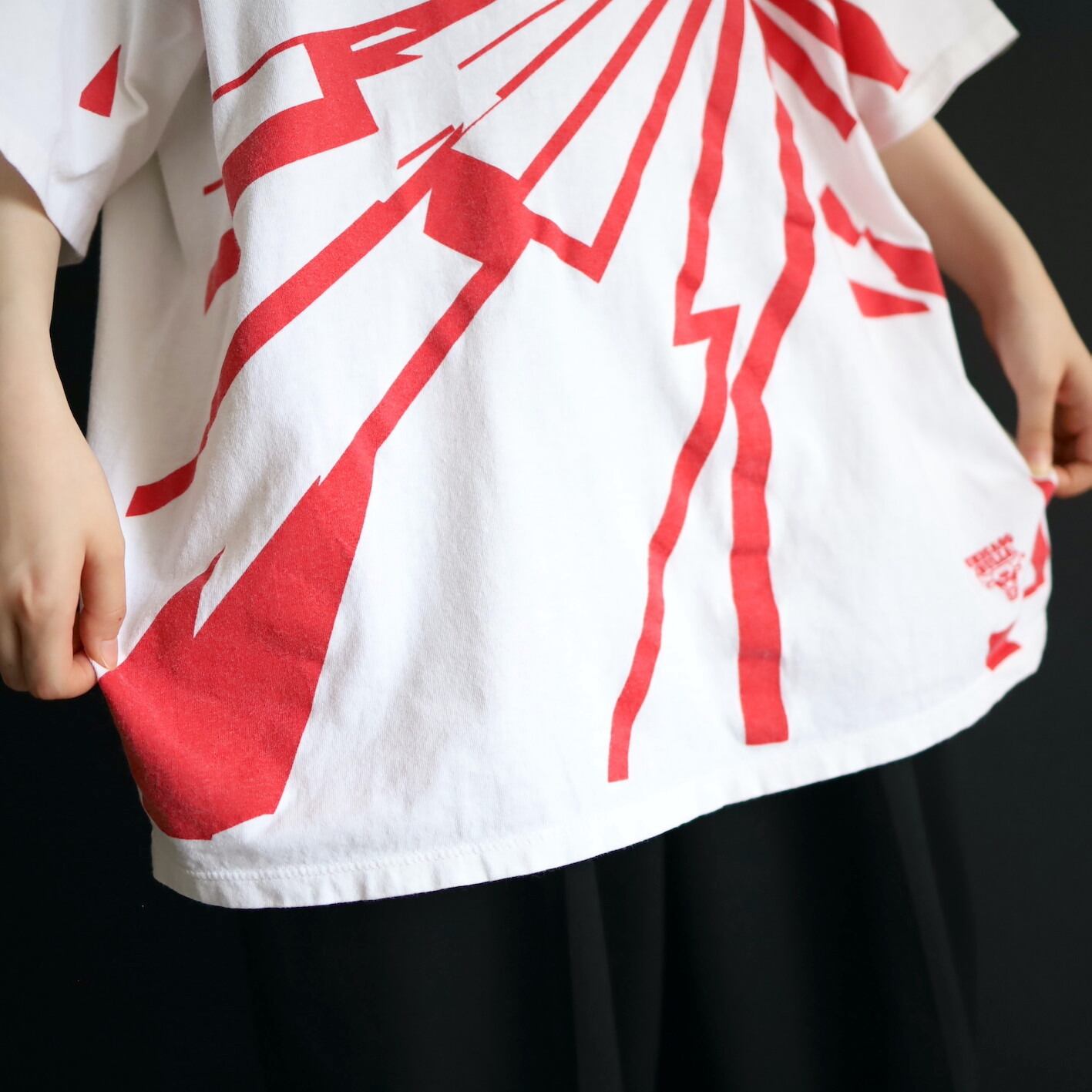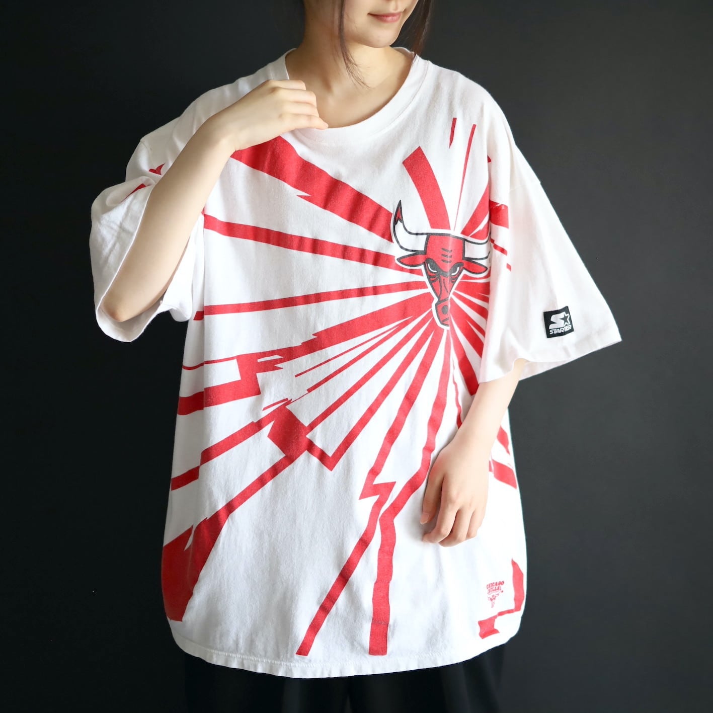 ホワイトカラーベのボディに,パキッと映えるレッドベースのNBA,CHICAGO BULLSプリント.