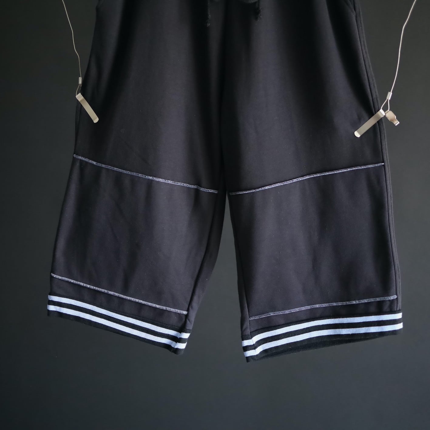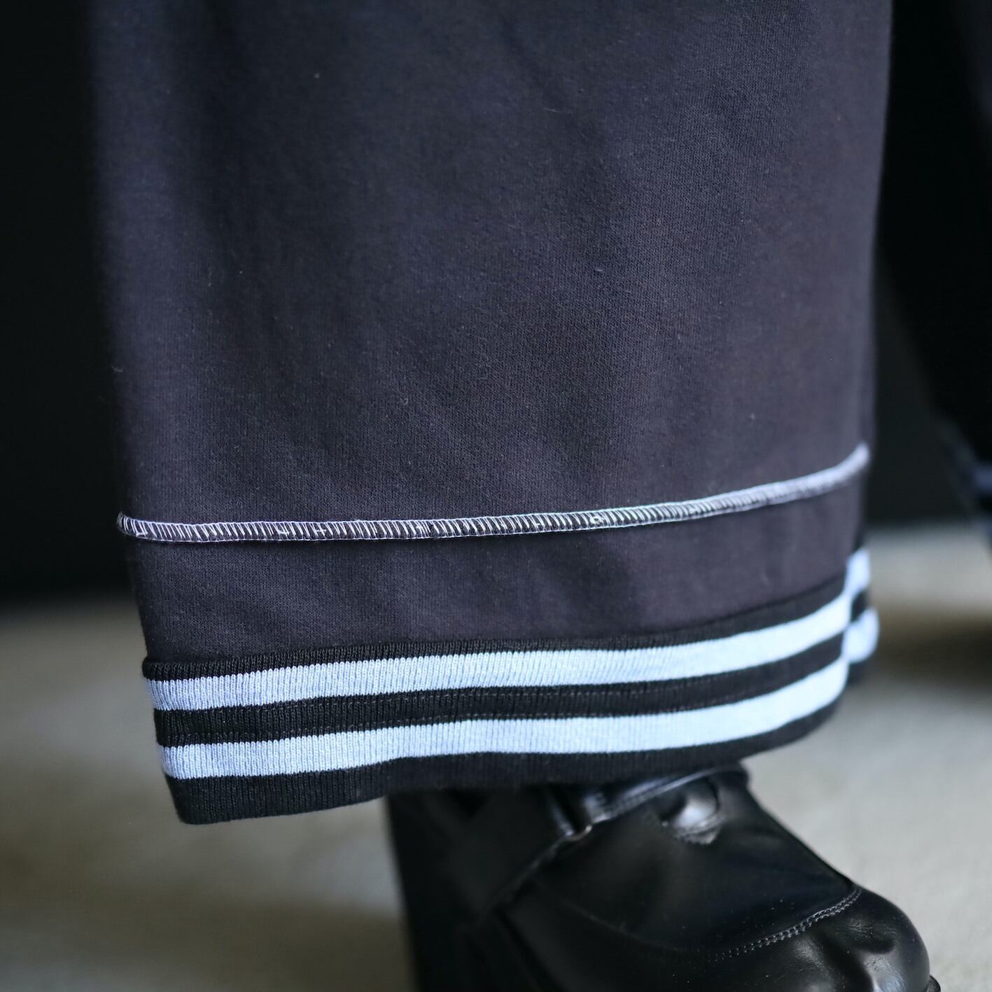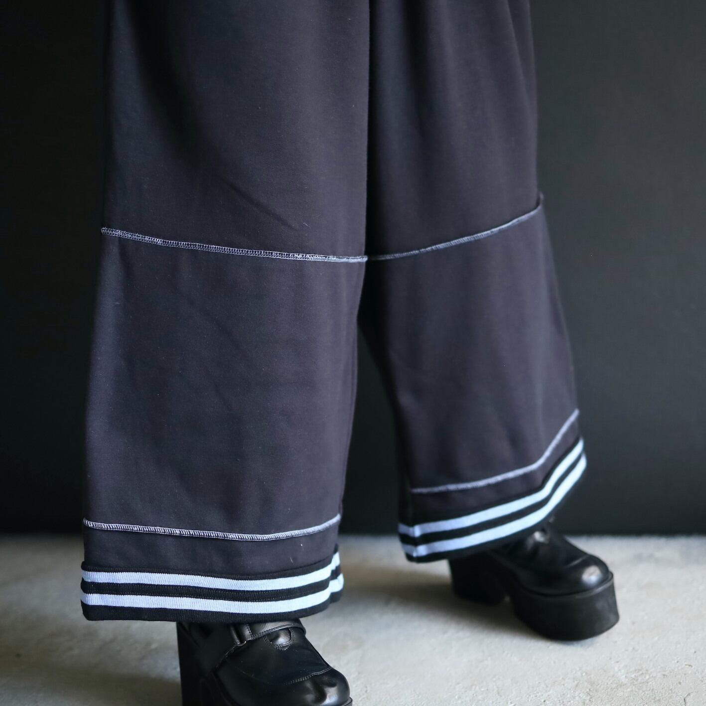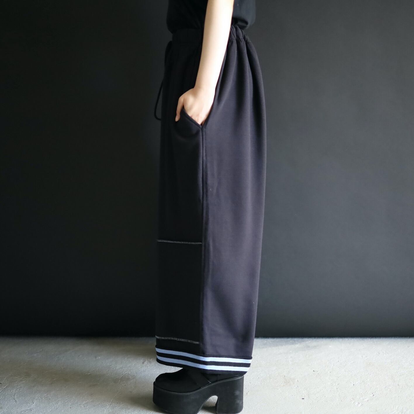 裾先はブルーのラインの入ったリブ切替,膝下付近と裾のやや上部には,ロックミシンによるかがり縫いのステッチが走ります.