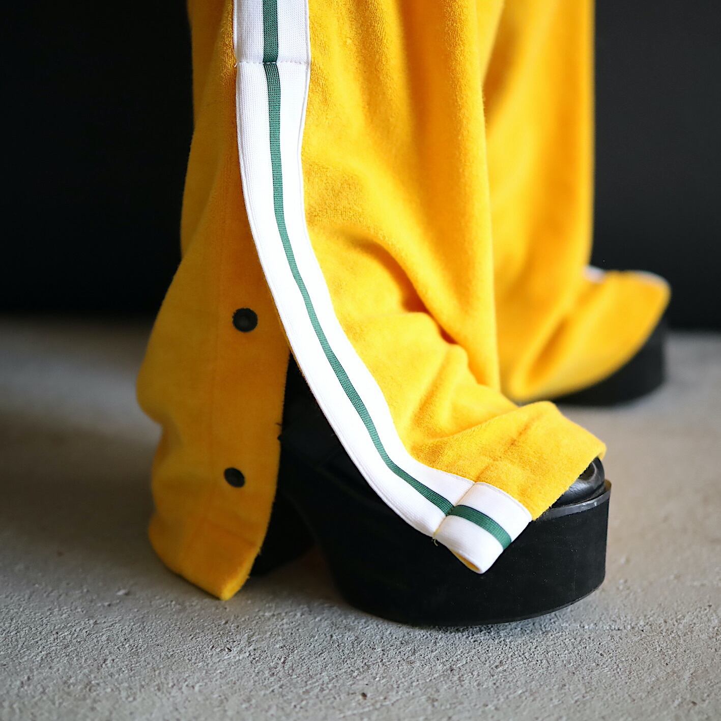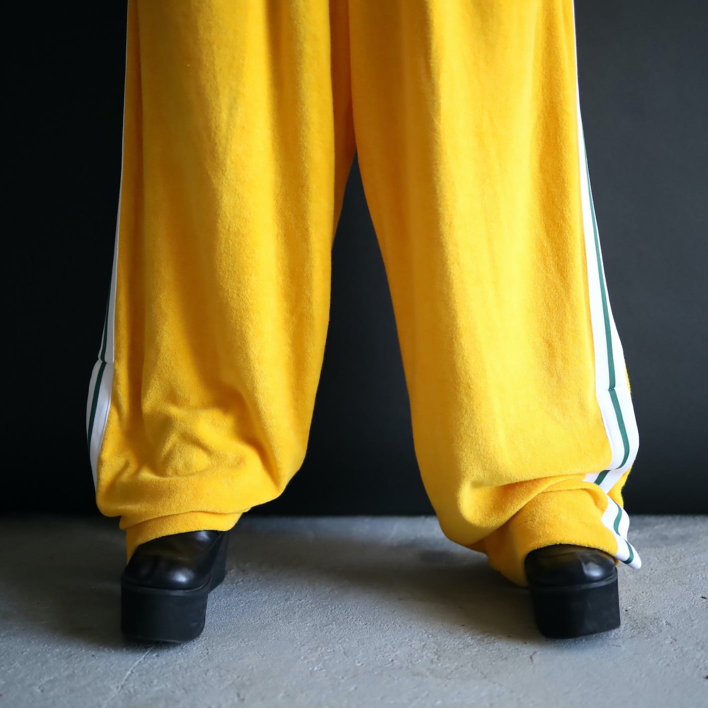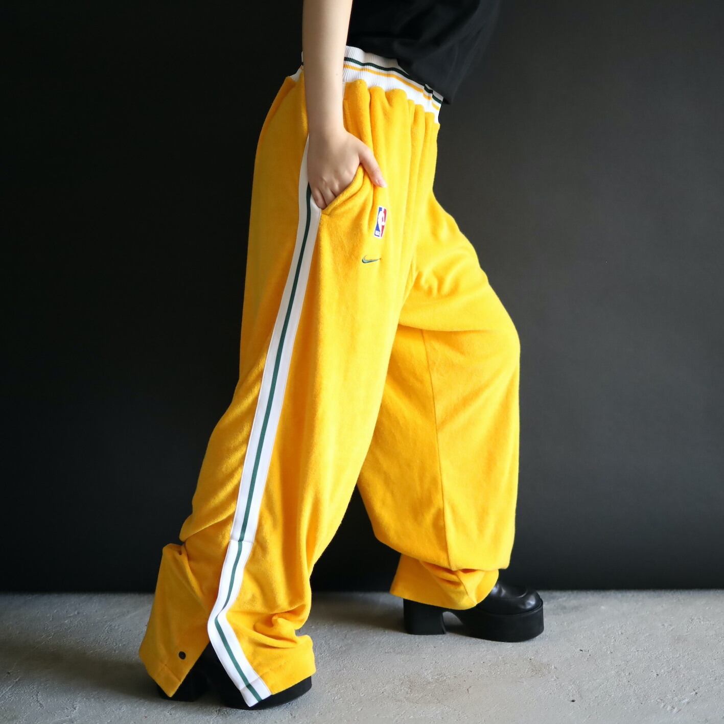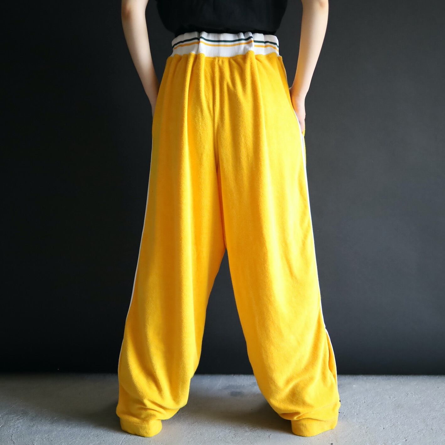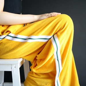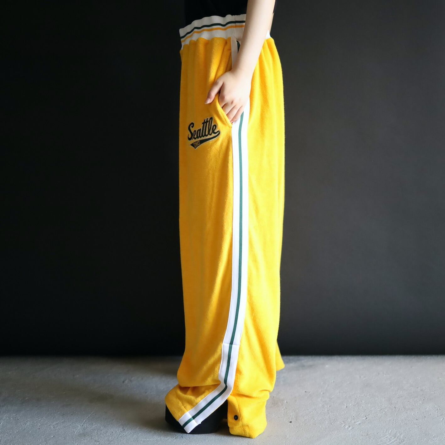 ワイド,ルーズなシルエットに加えて, パンチの効いた色味のトラックパンツ.