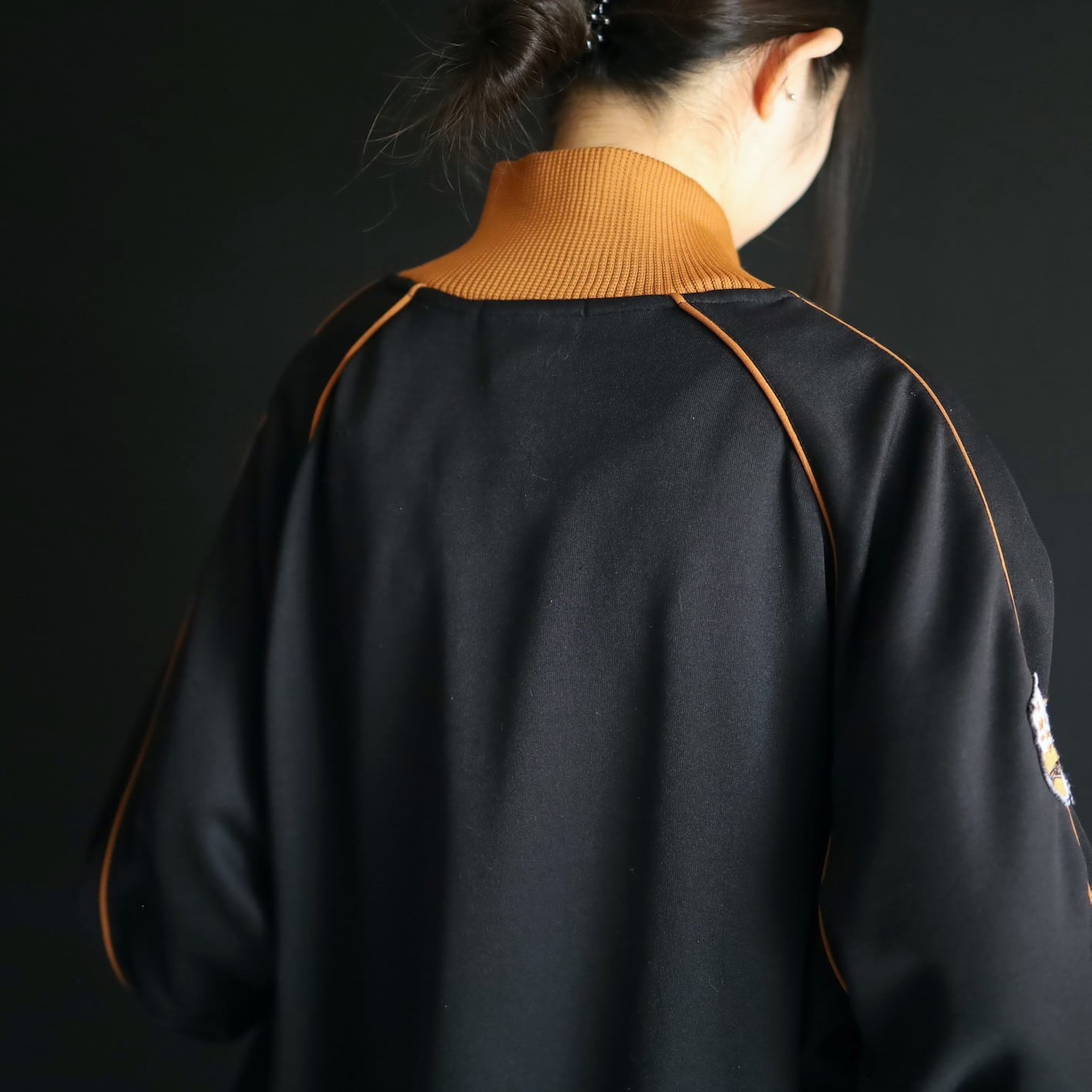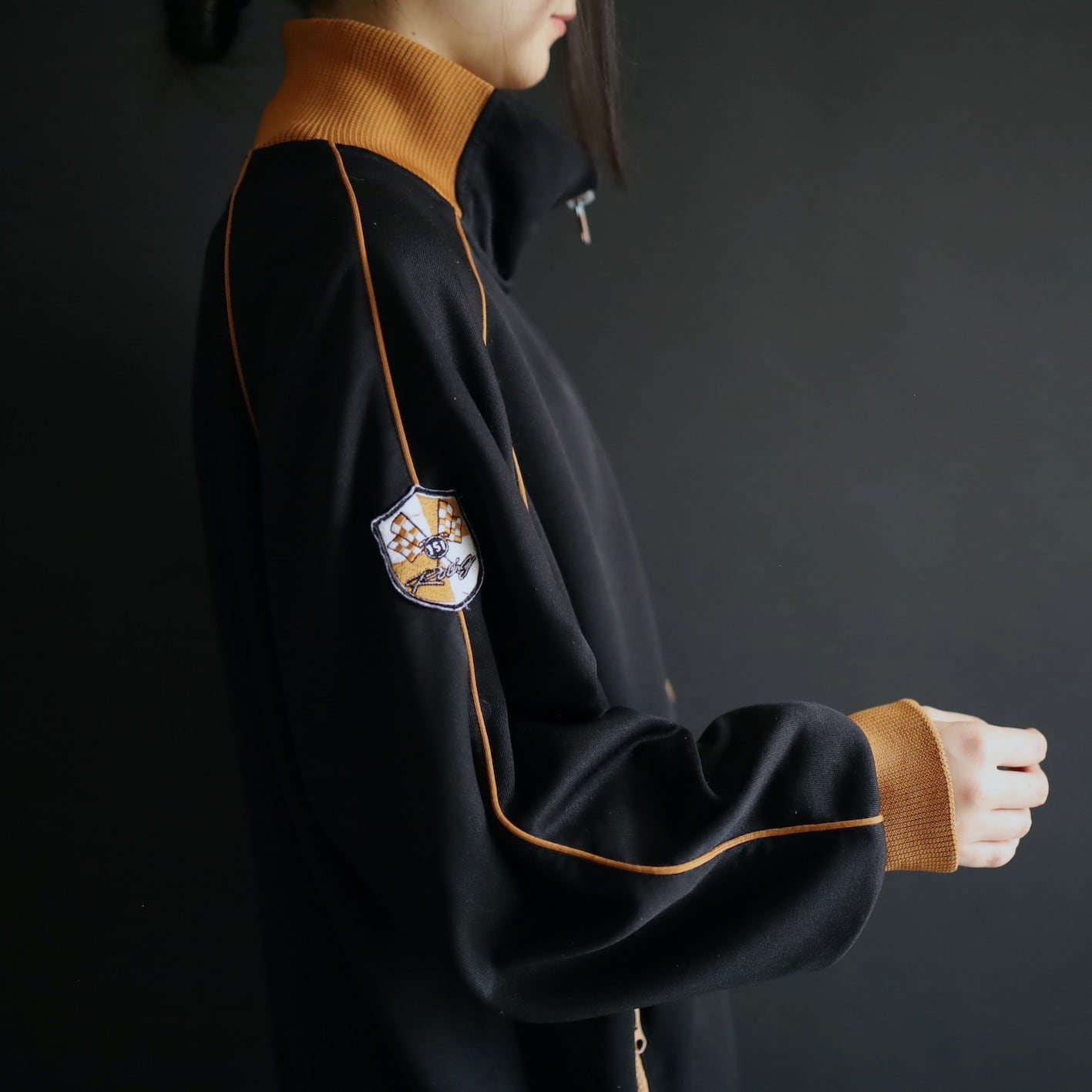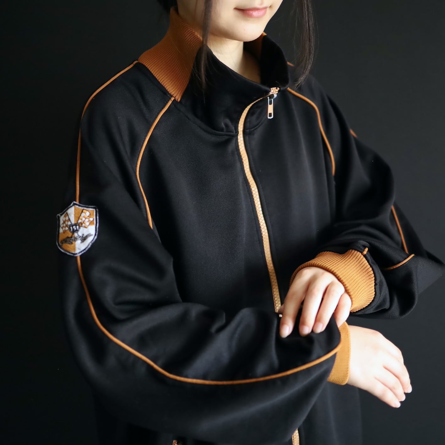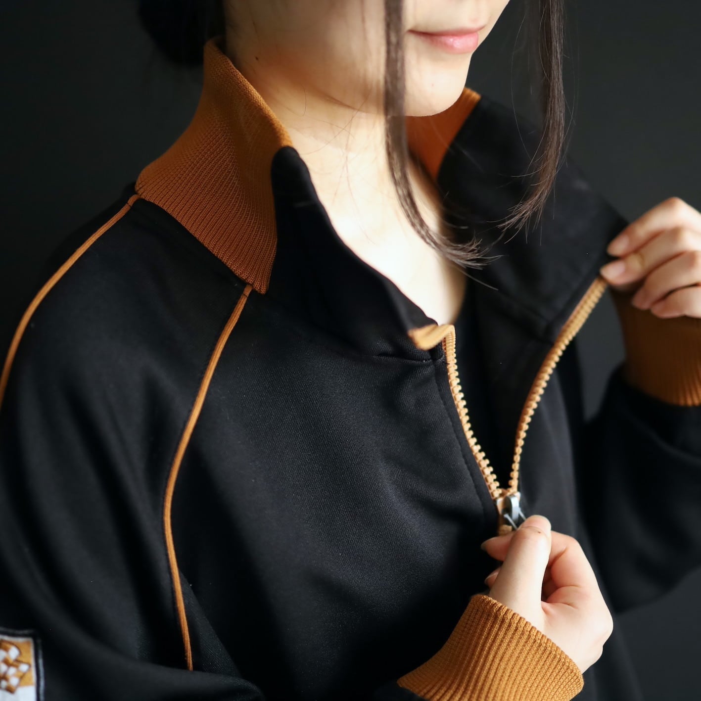 右袖にワンポイントアクセントとなるワッペンが一枚,ネックはトラック系でも人気のハイネック仕様.