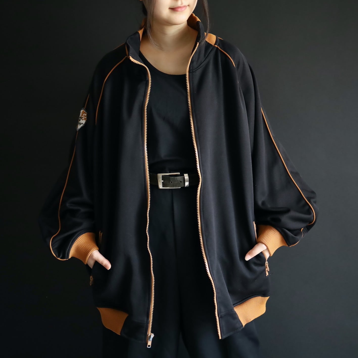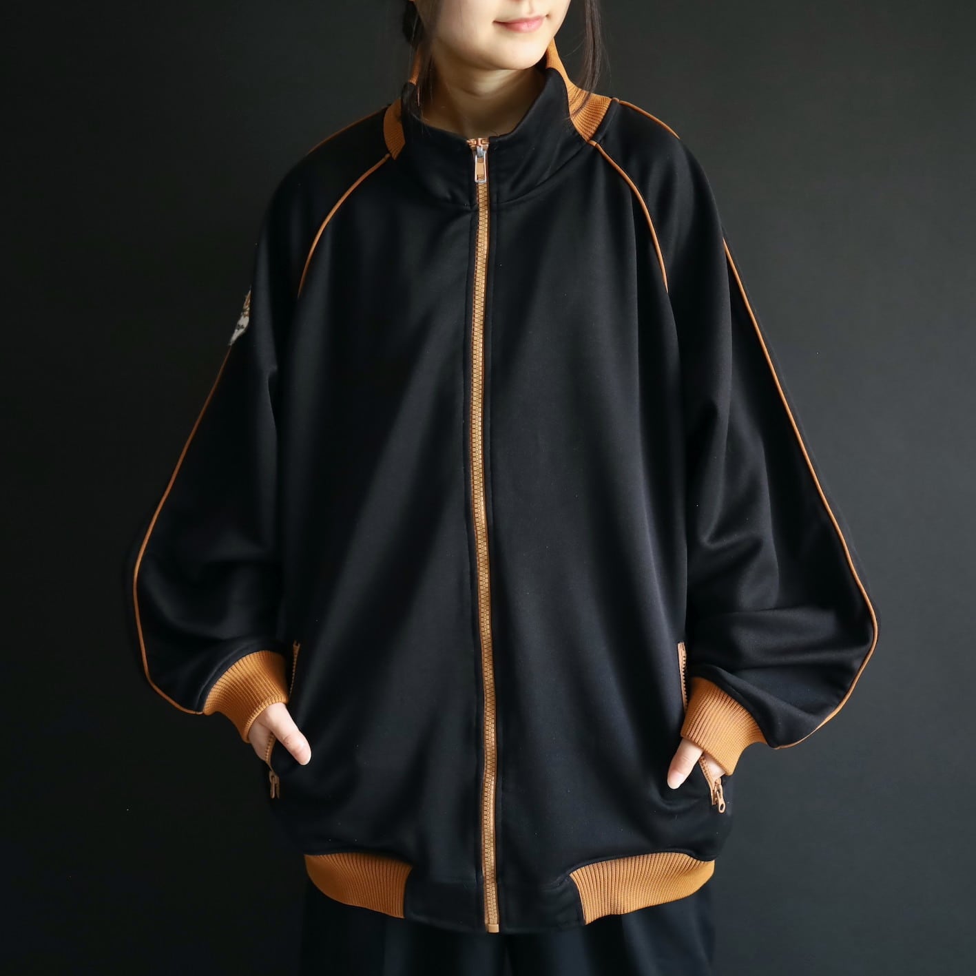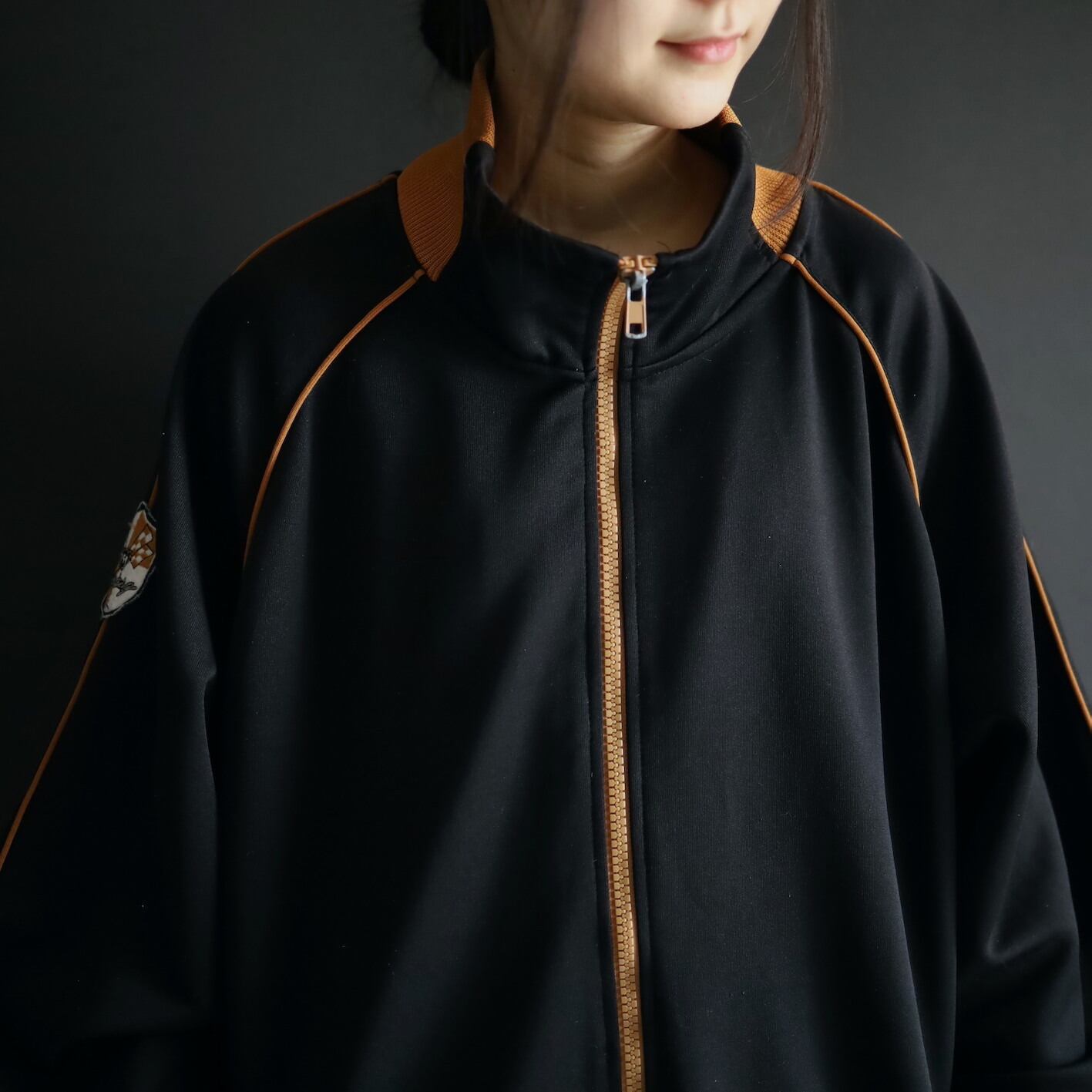 右袖にワンポイントアクセントとなるワッペンが一枚,ネックはトラック系でも人気のハイネック仕様.