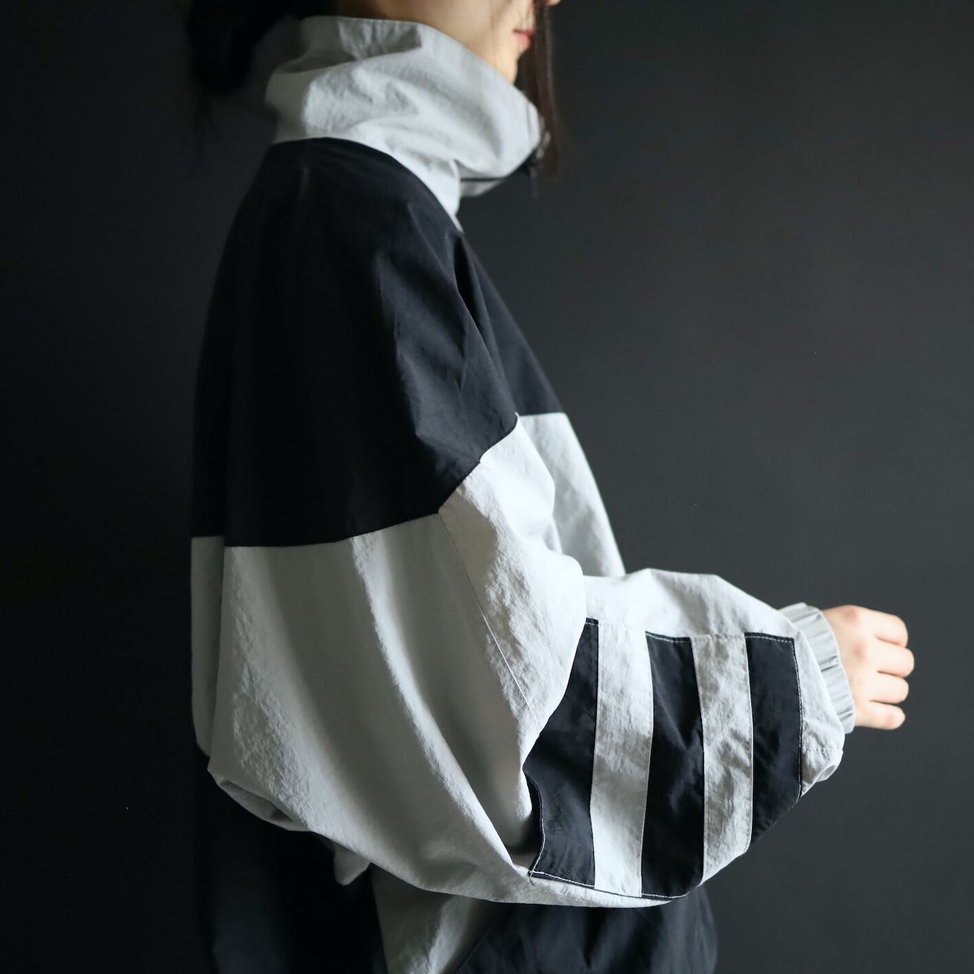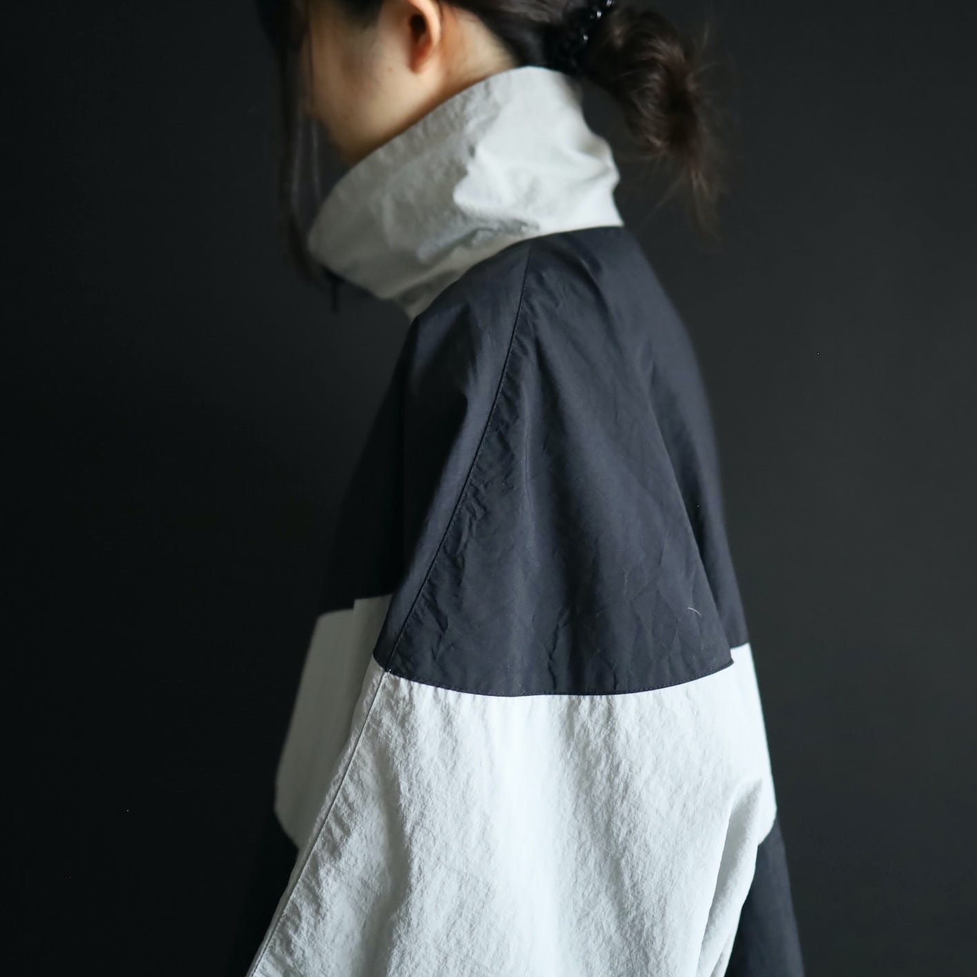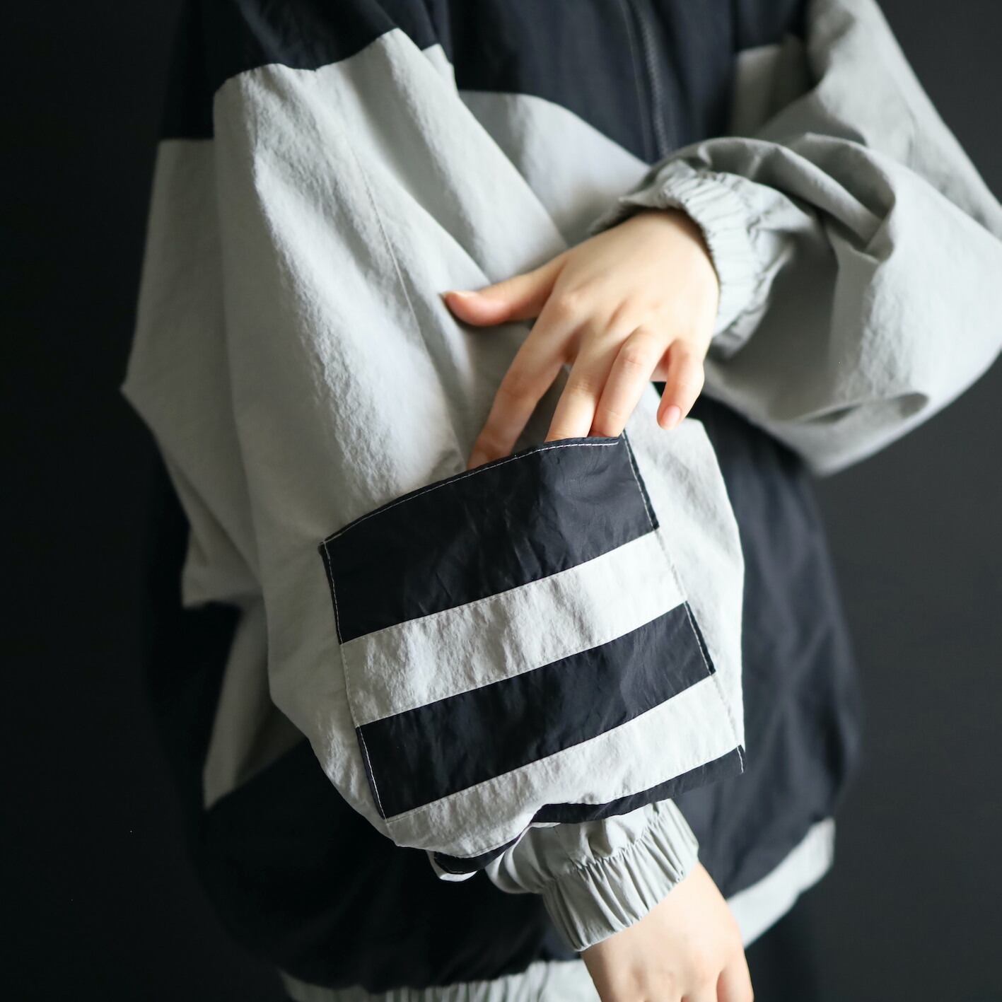 大胆な切替も目を惹きますが,右袖のバイカラーボーダーの謎のポケットもユニーク.