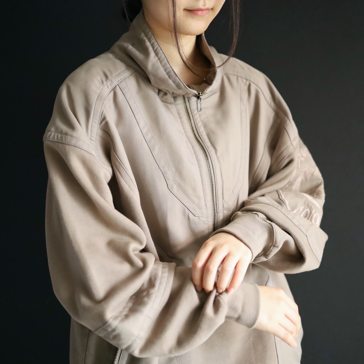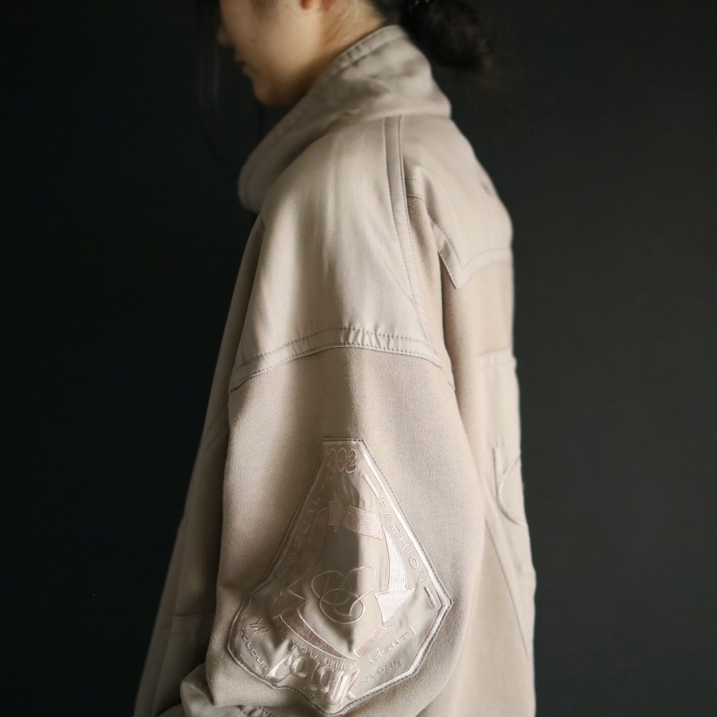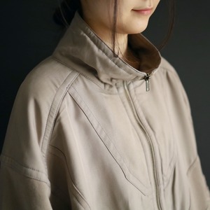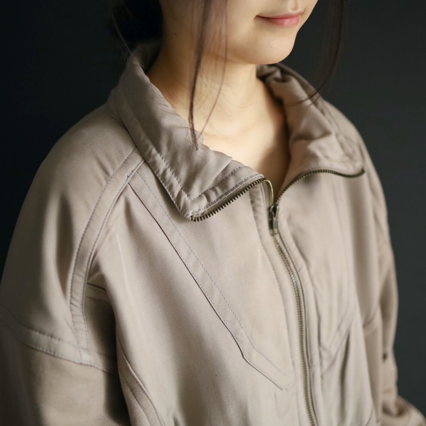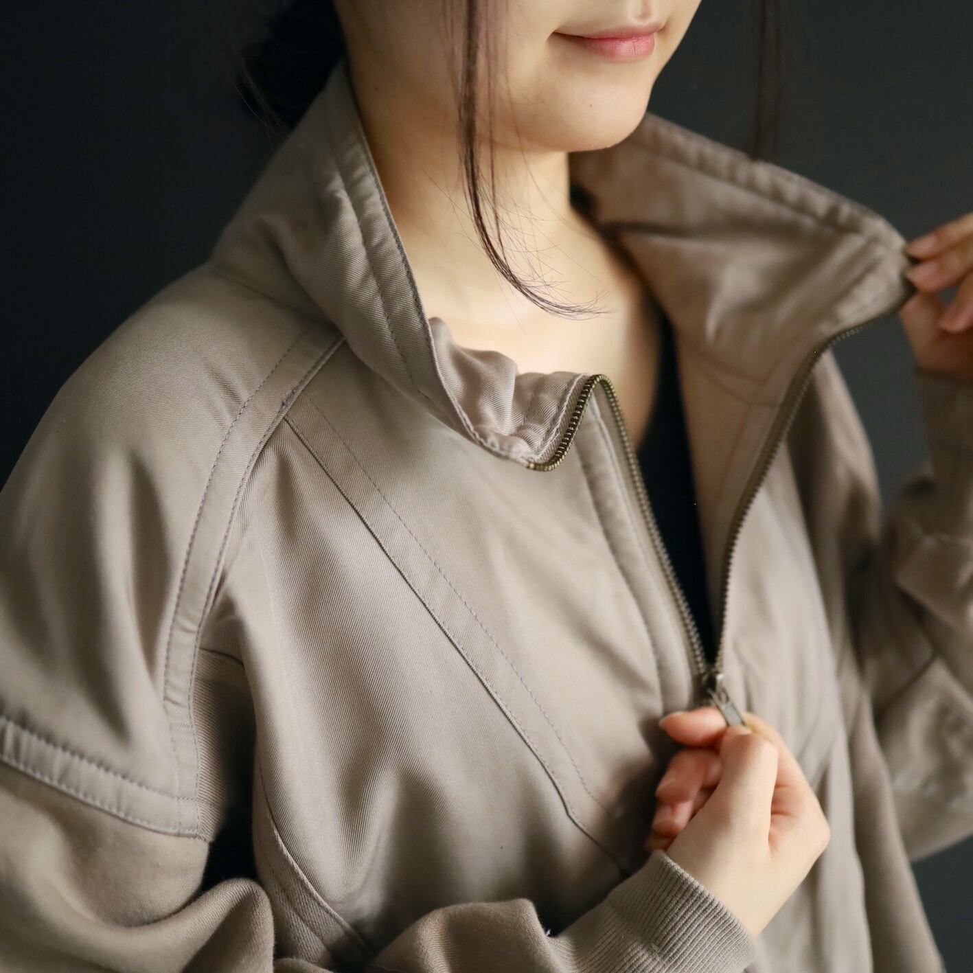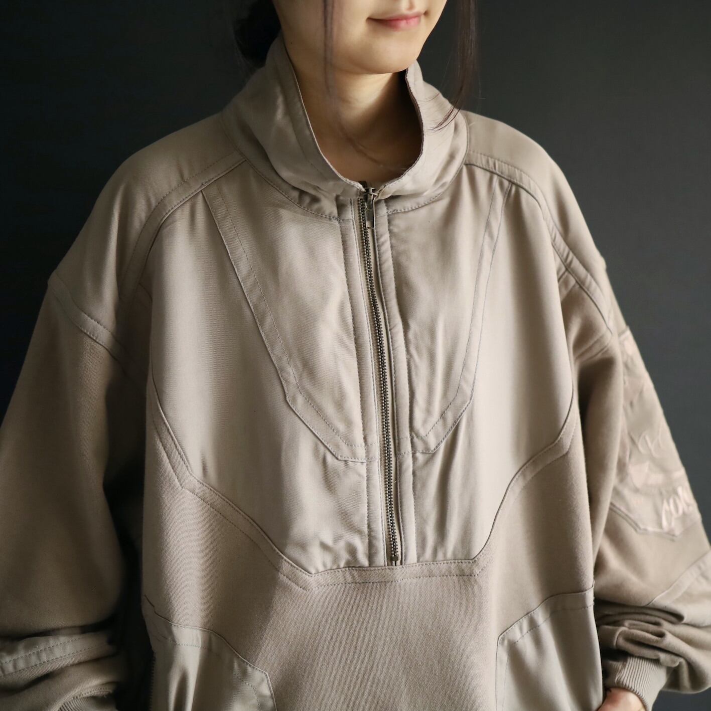 コットン100%のスウェットボディをベースに,ネック,ジップ,ポケット周りがシルク100%切替.
